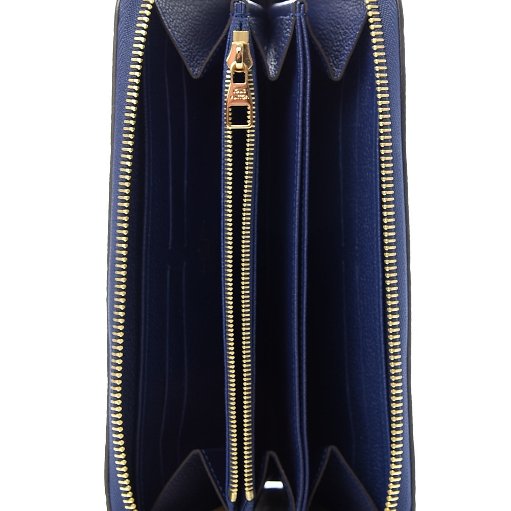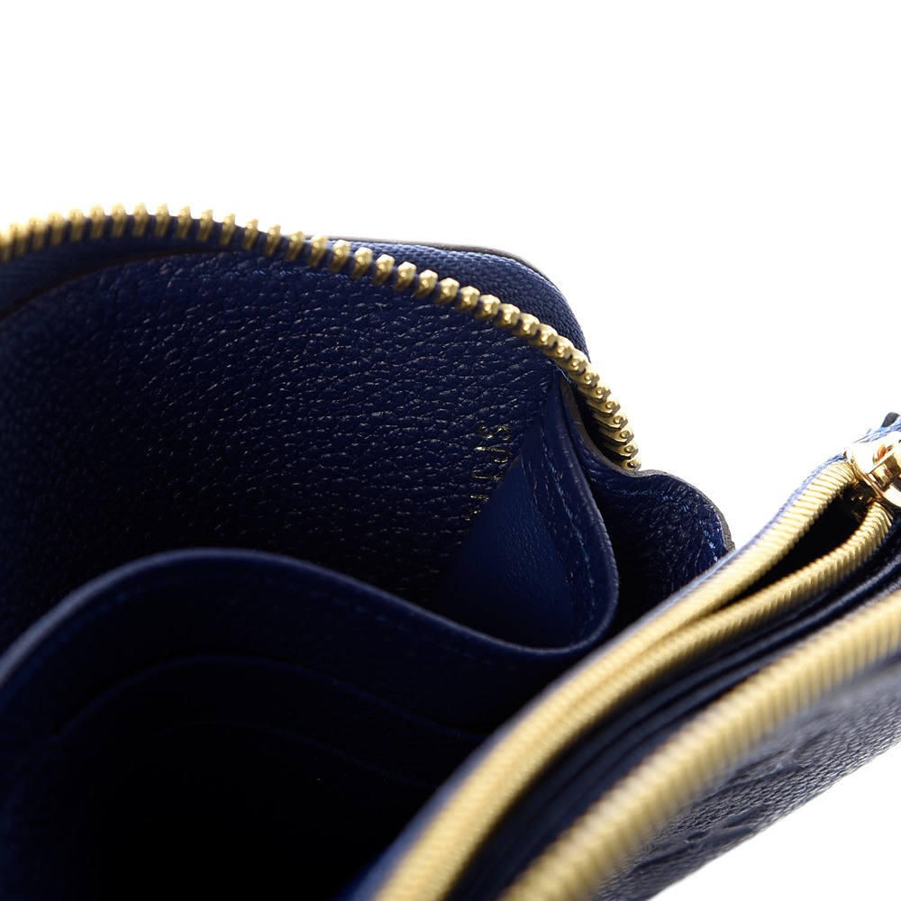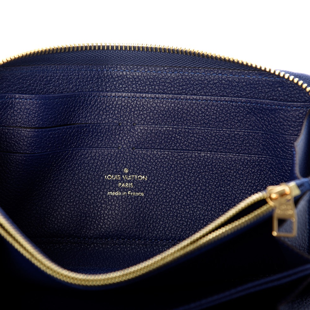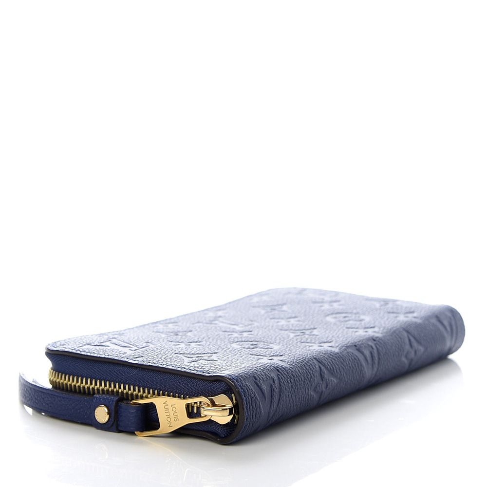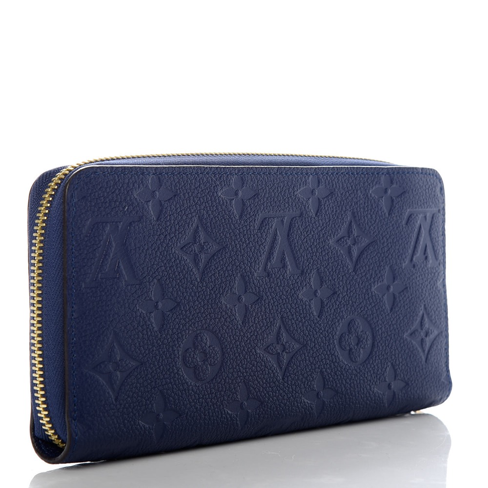 This is a Louis Vuitton Empreinte Zippy Wallet in Iris. This chic clutch wallet is crafted of fine Louis Vuitto NeoNoeam embossed leather in blue. The wallet features a wrap-around zipper that opens to a leather interior lined with card slots and patch pockets and a partition zippered pocket.