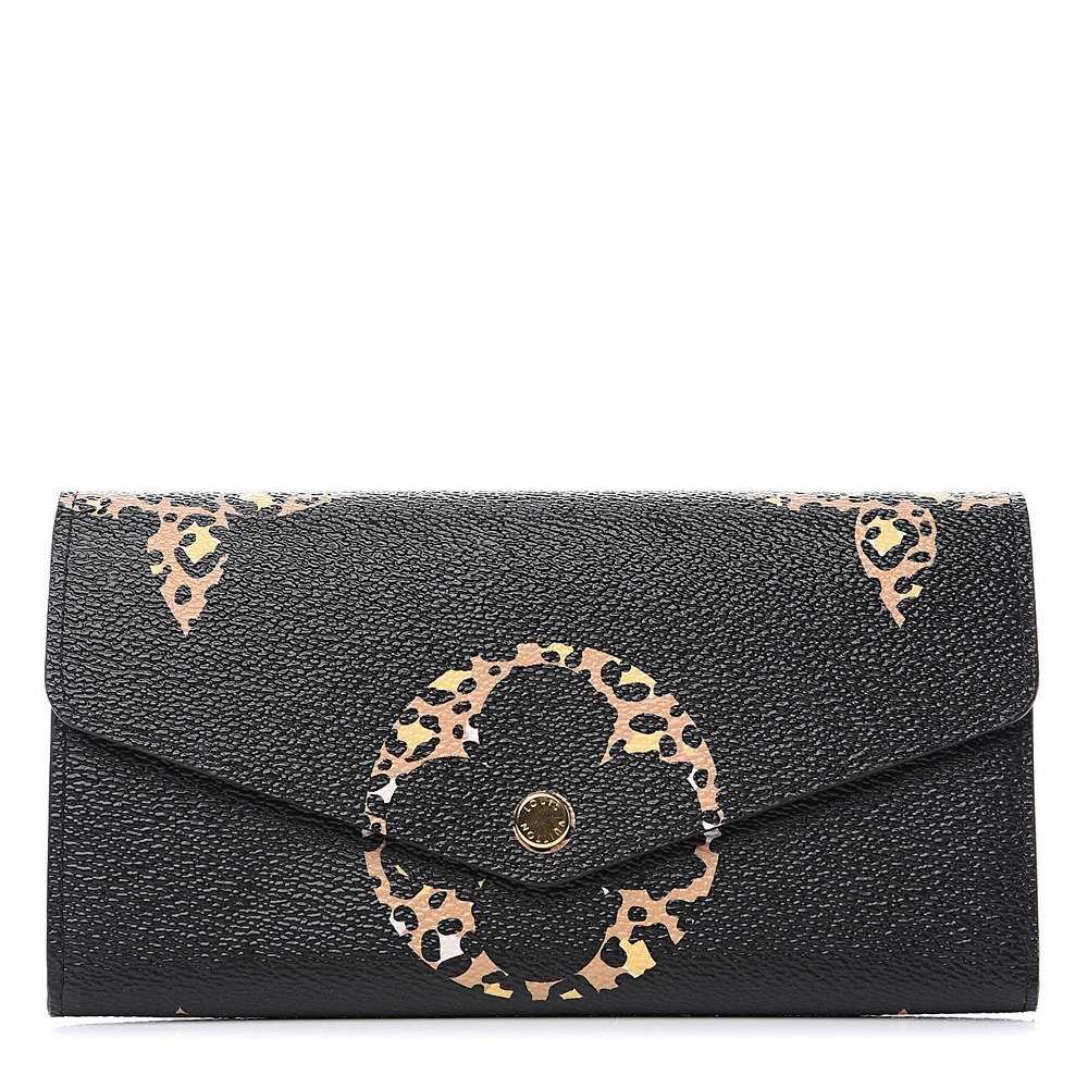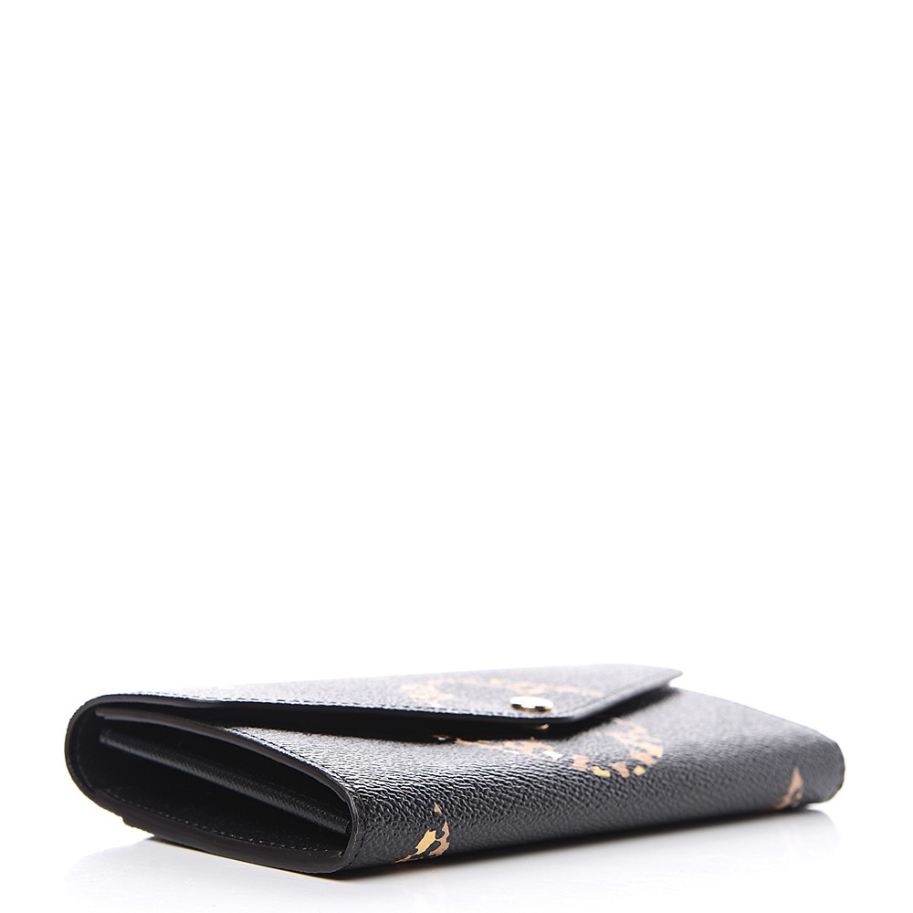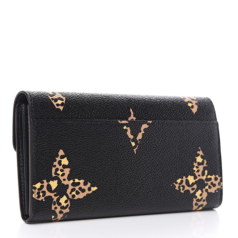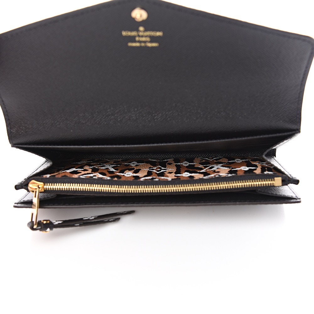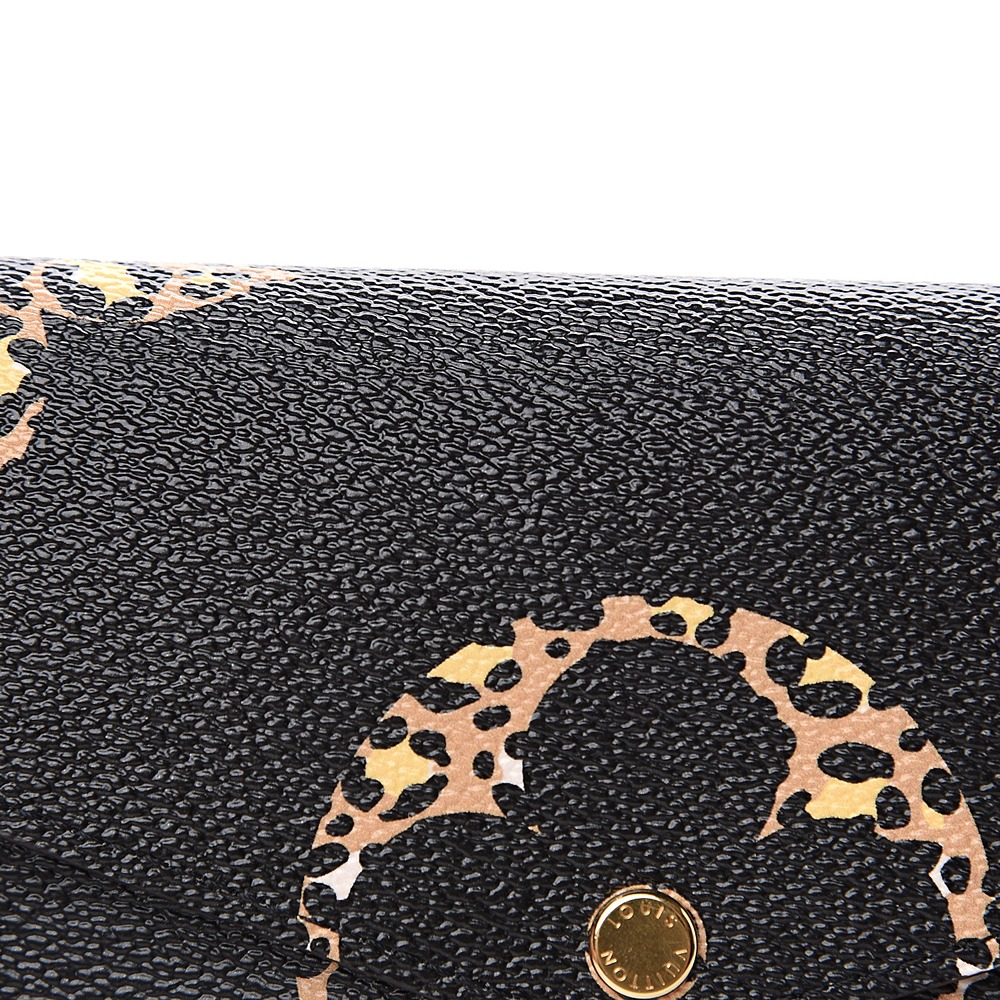 This is the Louis Vuitto NeoNoeam Giant Jungle Sarah Wallet in Black. This chic wallet is crafted of traditional Louis Vuitto NeoNoeam jungle toile coated canvas. The envelope style front flap opens with a polished gold snap to a partitioned black cross grain leather interior with flat pockets, card slots, and a central zipper compartment. This stylish wallet has the luxury of Louis Vuitton!