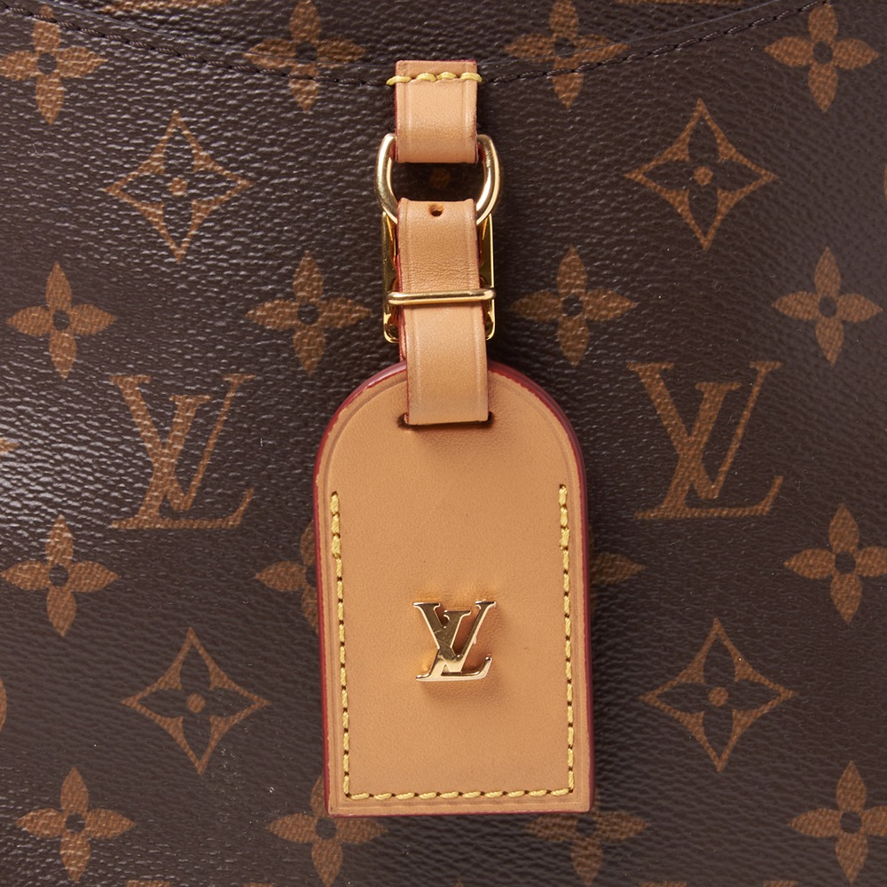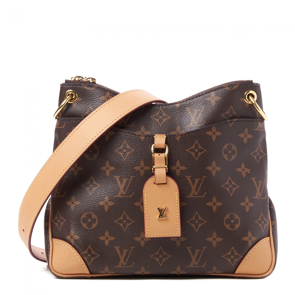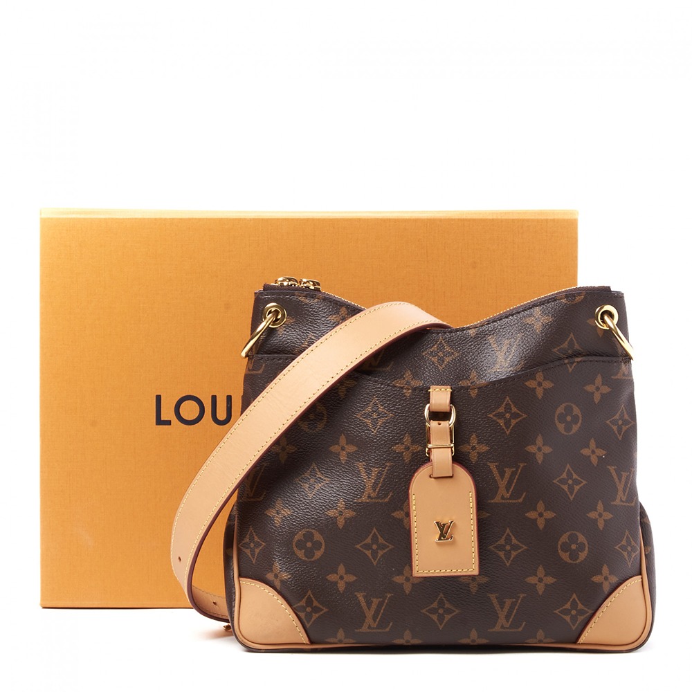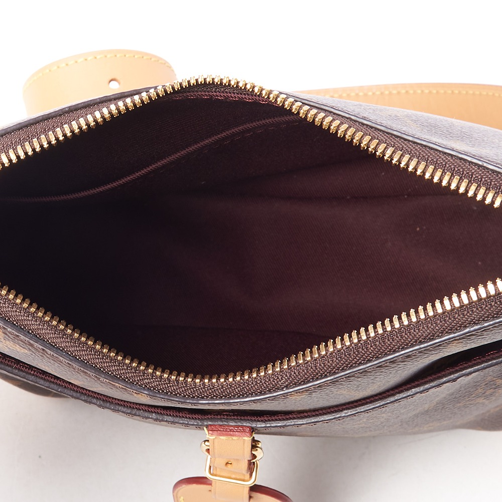 An elegant messenger bag by Louis Vuitton, crafted with the iconic monogram coated canvas and vachetta leather trim. Showcasing an adjustable shoulder strap adorned with brass hardware and a practical front pocket for added storage. The top zipper opens to reveal a sophisticated dark brown fabric interior with a convenient patch pocket.