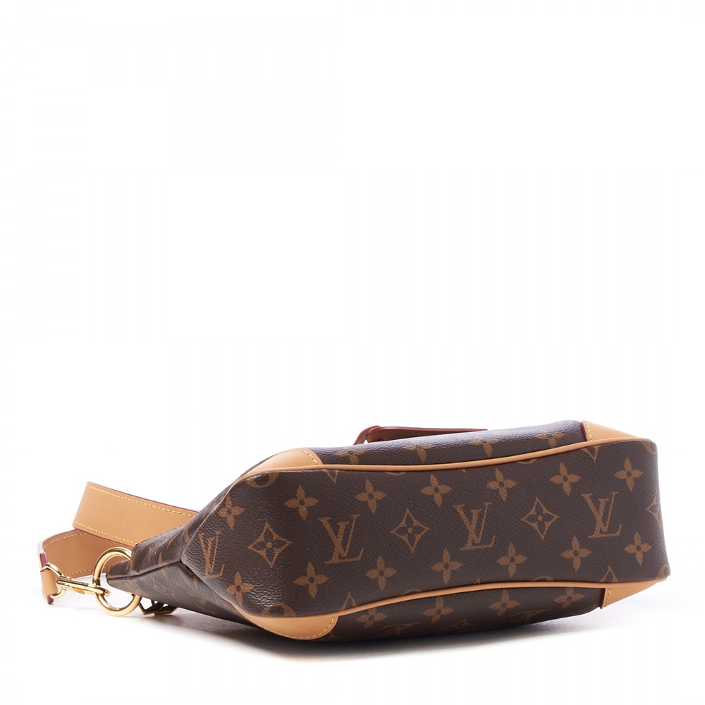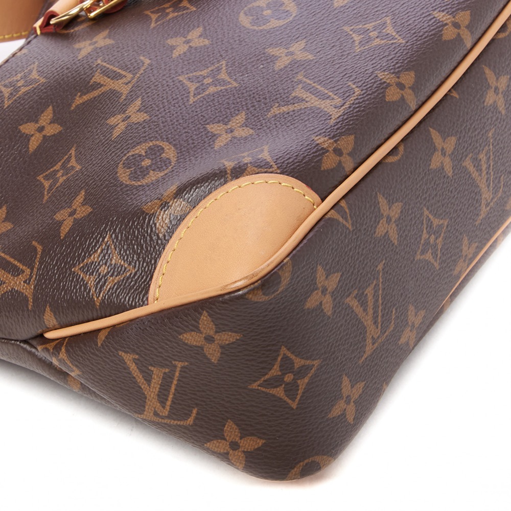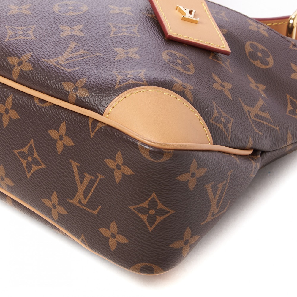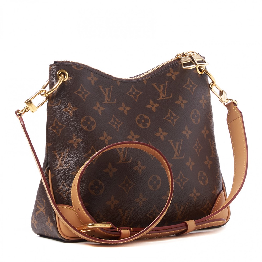 An elegant messenger bag by Louis Vuitton, crafted with the iconic monogram coated canvas and vachetta leather trim. Showcasing an adjustable shoulder strap adorned with brass hardware and a practical front pocket for added storage. The top zipper opens to reveal a sophisticated dark brown fabric interior with a convenient patch pocket.