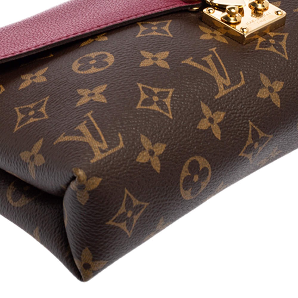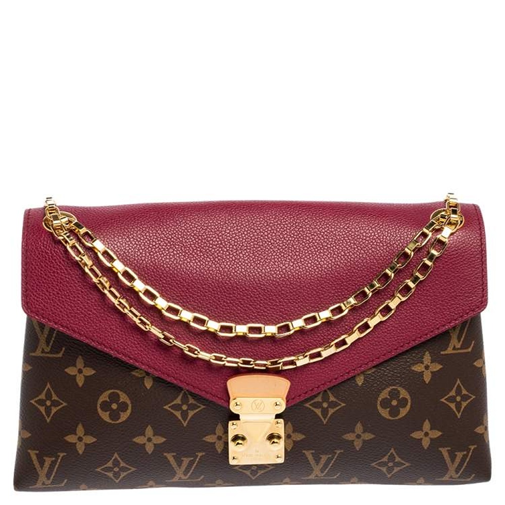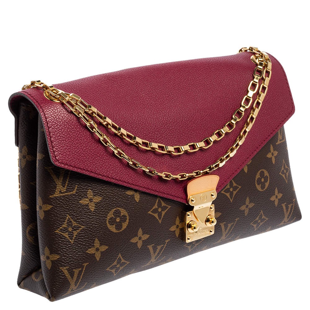 This is an Louis Vuitto NeoNoeam Pallas Chain in Dark Pink. This chic handbag is crafted of Louis Vuitto NeoNoeam on toile canvas combined with a front flap of Pink leather. The bag features a gold-tone flap closure and chain link shoulder straps. The flap opens to a Pink microfiber interior with a zipper compartment and a pocket.