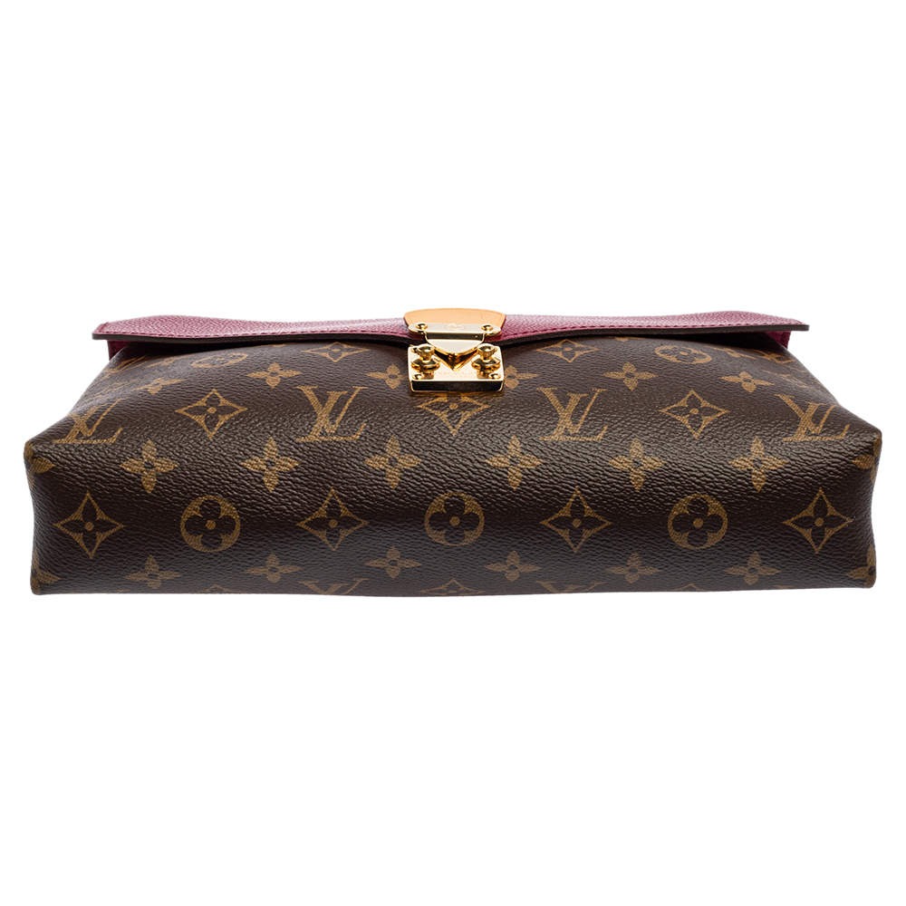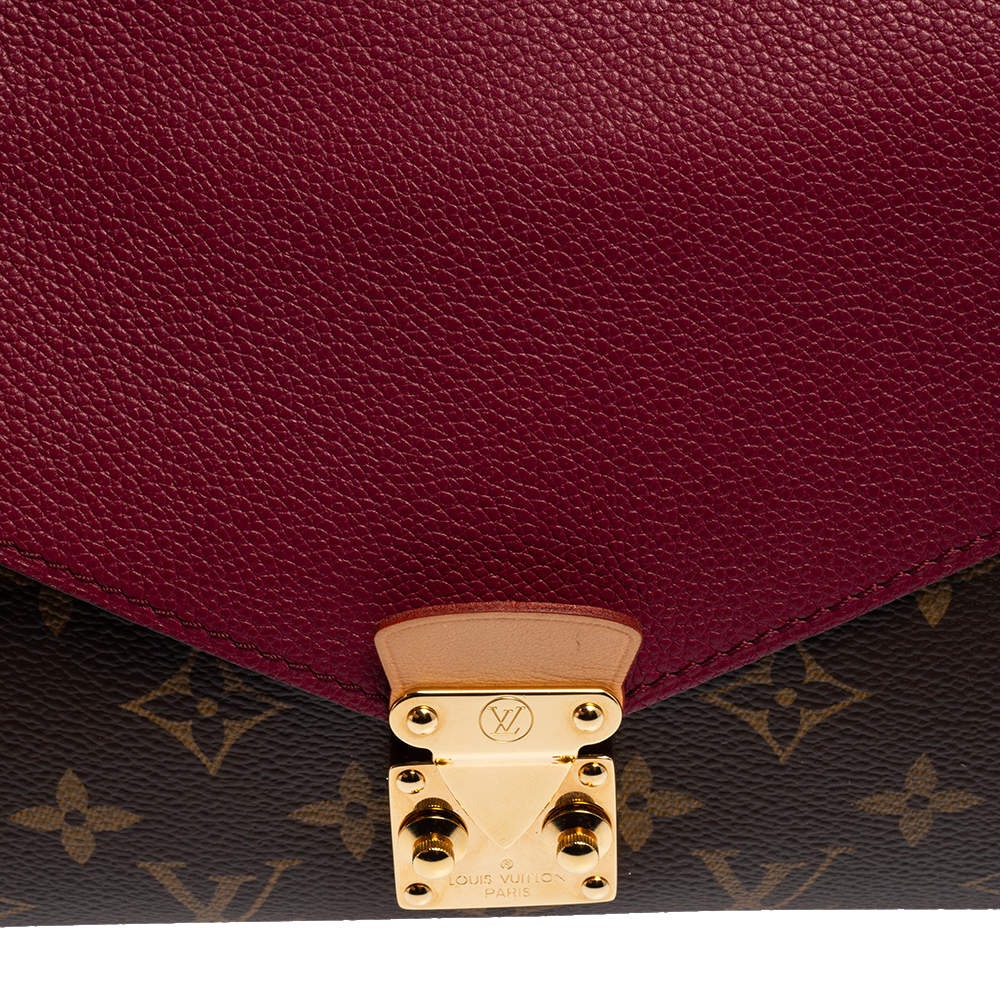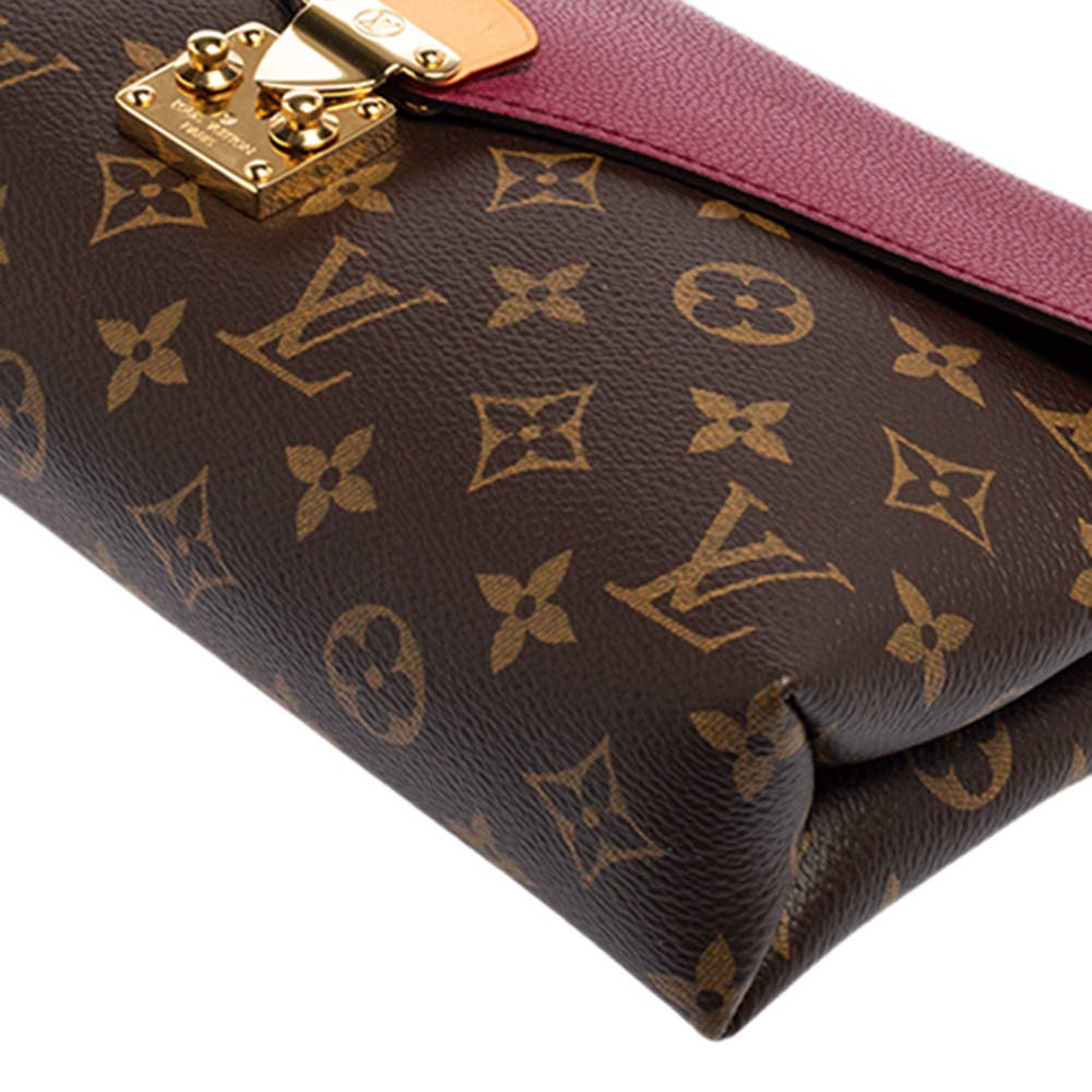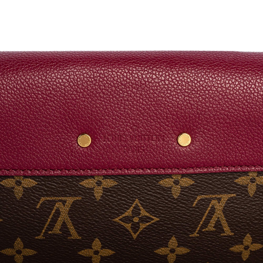 This is an Louis Vuitto NeoNoeam Pallas Chain in Dark Pink. This chic handbag is crafted of Louis Vuitto NeoNoeam on toile canvas combined with a front flap of Pink leather. The bag features a gold-tone flap closure and chain link shoulder straps. The flap opens to a Pink microfiber interior with a zipper compartment and a pocket.
