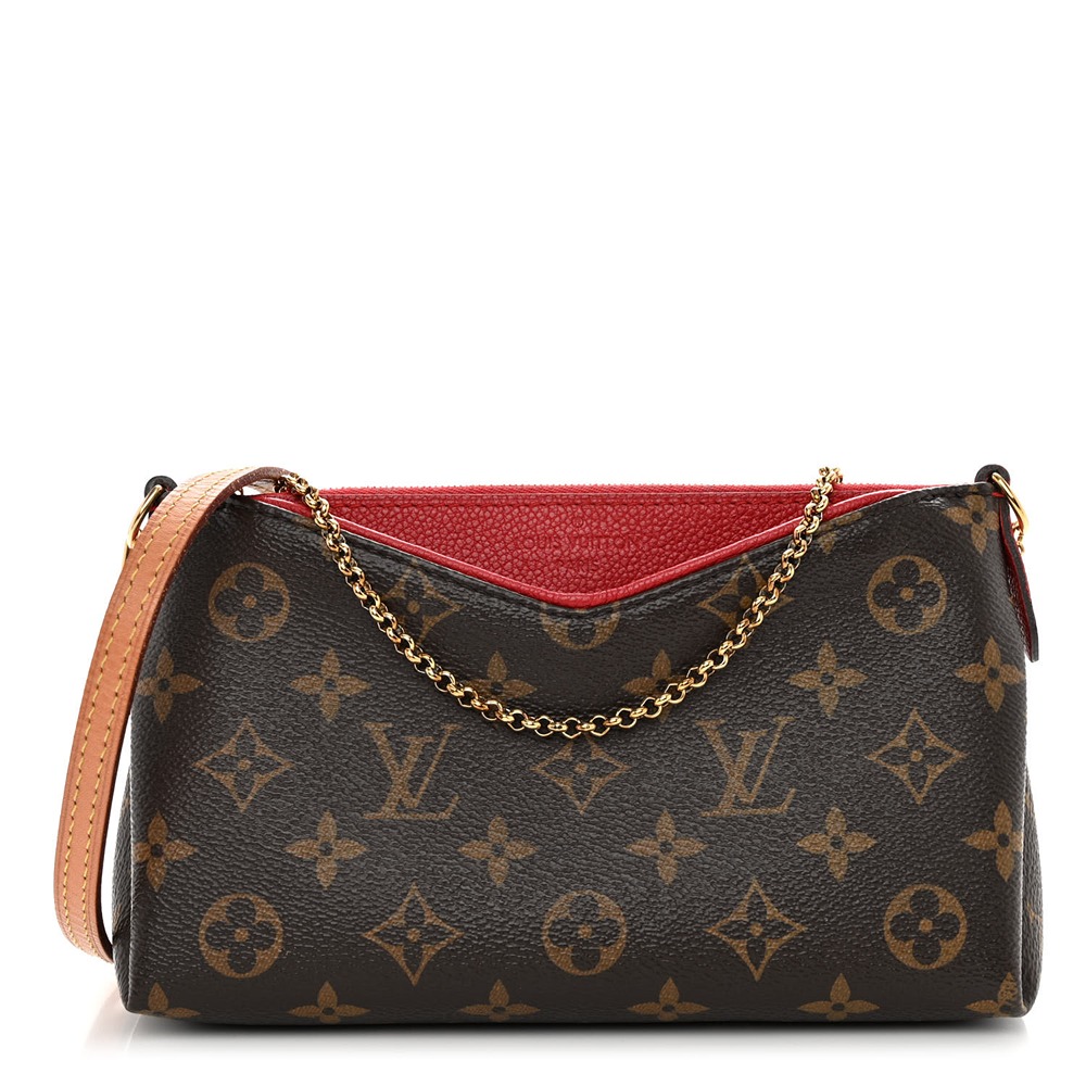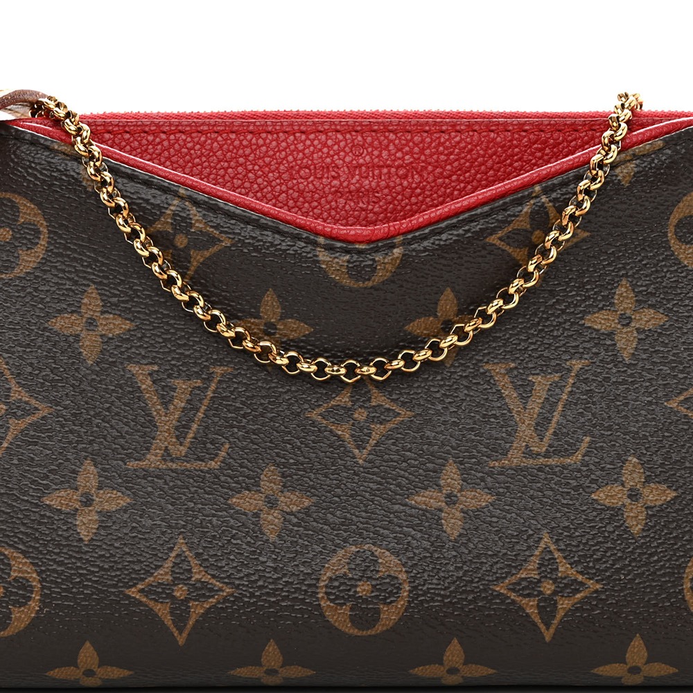 This is an Louis Vuitto NeoNoeam Pallas Clutch in Cherry Red. This chic shoulder bag is crafted of Louis Vuitto NeoNoeam on toile canvas with a trim of red leather at the top. The bag features a front V pocket, a polished gold chain link strap, and a vachetta shoulder strap. The top zipper opens to a red fabric interior with a patch pocket.