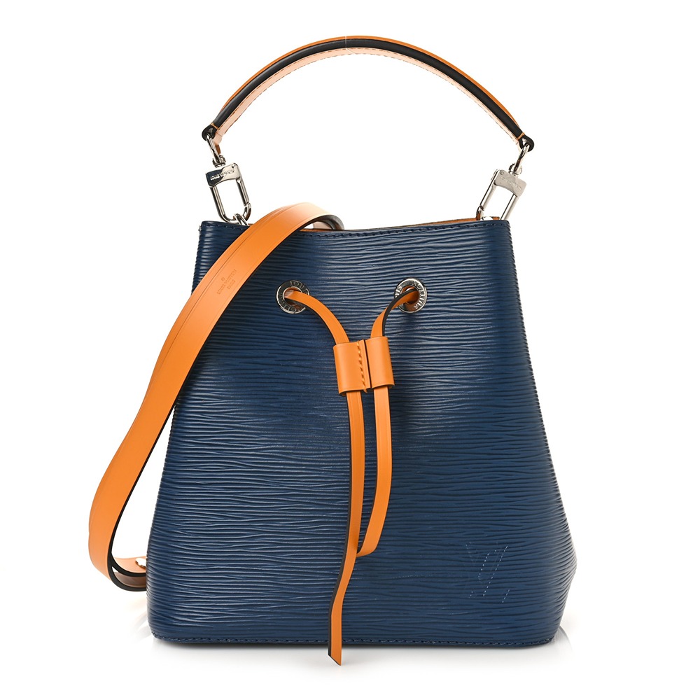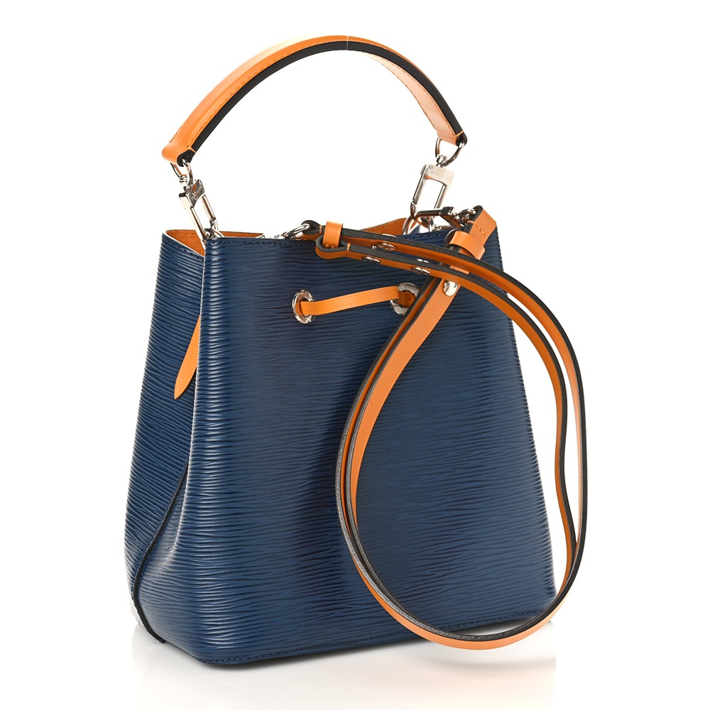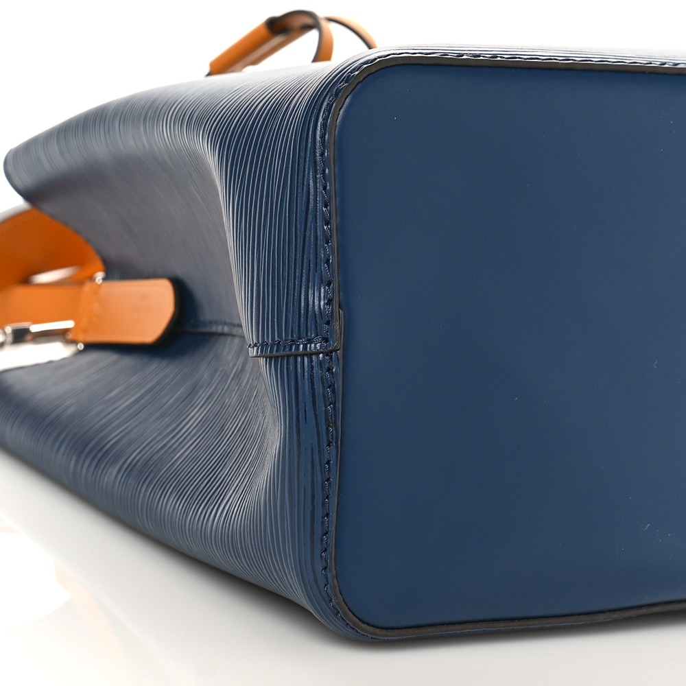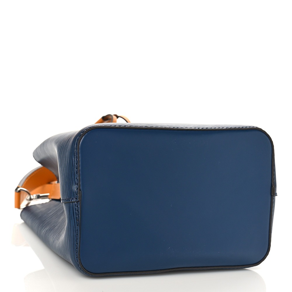 Introducing the Louis Vuitton Epi Neonoe in Indigo Safran, a classic bucket-style shoulder bag crafted from exquisite Louis Vuitton epi leather in a vibrant shade . This stylish bag offers versatility with an optional yellow shoulder strap, a top handle, top cinch cord, and polished silver hardware. The interior, adorned with soft yellow microfiber, features a convenient center zip pocket.
