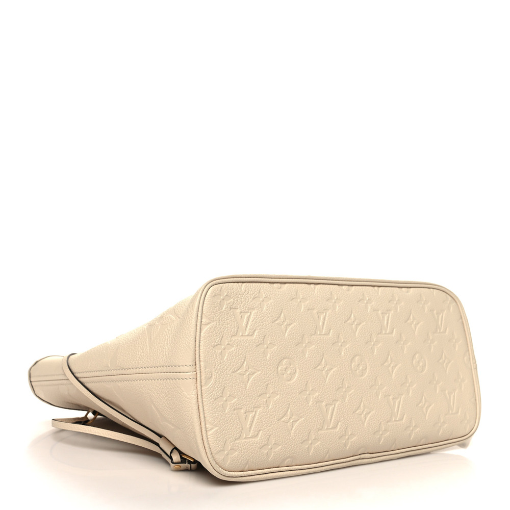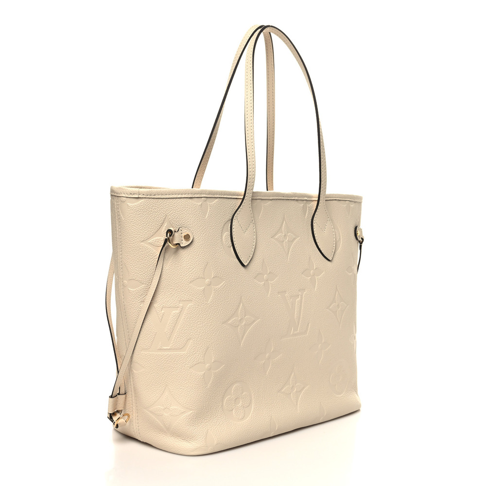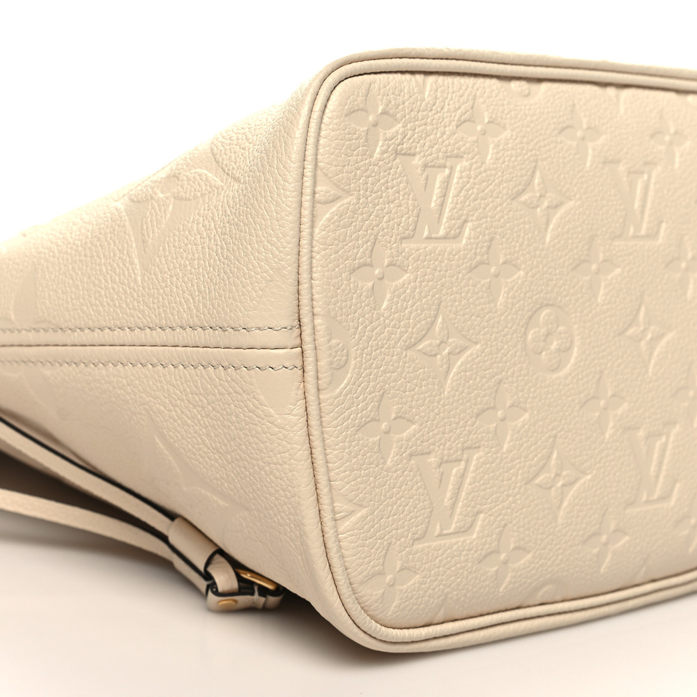 The Neverfull MM tote bag is made from grained Monogram Empreinte leather, with gold-color hardware and a tone-on-tone microfiber lining. A zipped pocket inside can be removed and used separately. The side laces can be tightened for a sleeker look or loosened for more casual use.