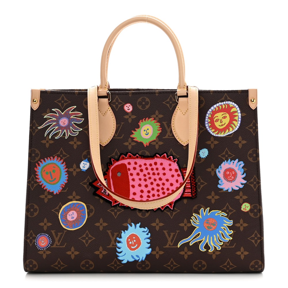 This is an Louis Vuitton LV X YK Monogram Onthego MM in Multicolor. This limited edition Onthego is crafted of Monogram coated canvas with 3D Painted Dots print of energetic lines; the Onthego MM is part of the LV Crafty capsule collection. The bag features vachetta leather shoulder straps and the top is open to a spacious fabric interior with zipper and patch pockets.
