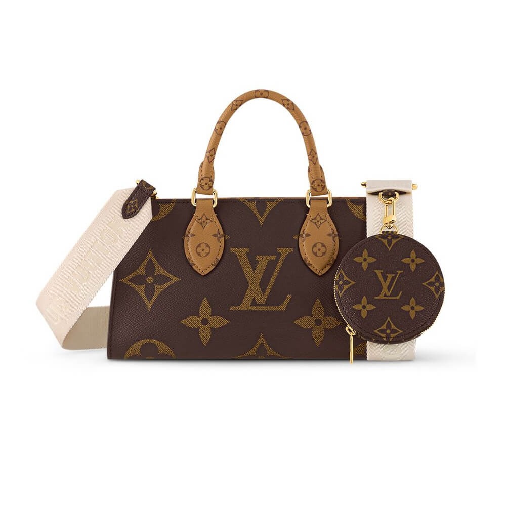 The Louis Vuitton OnTheGo East West tote reimagines the classic with a modern twist, boasting a blend of Giant Monogram and Monogram Reverse canvas. This stylish bag features two Toron top handles and a wide, detachable strap, offering versatile styling options. Its well-proportioned design includes a large zipped main compartment, two outer flat compartments, and a convenient inside flat pocket. Completing the versatile design is a removable round coin purse.