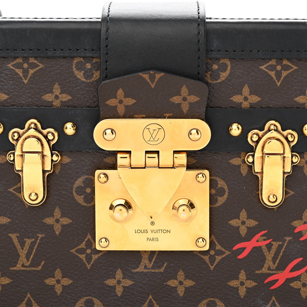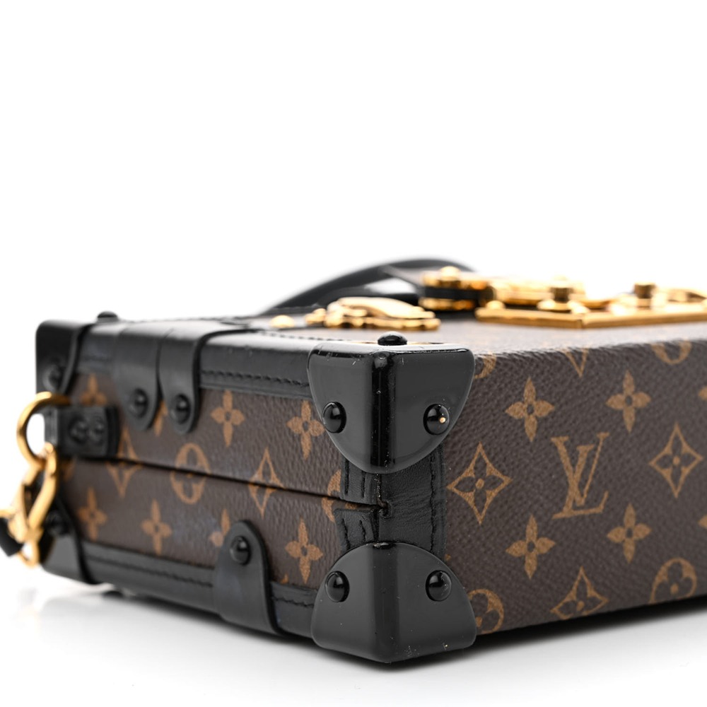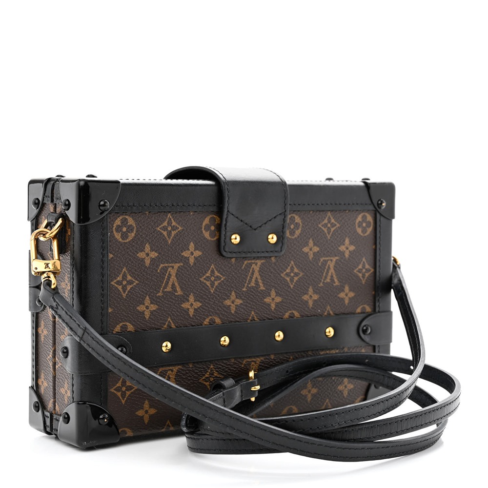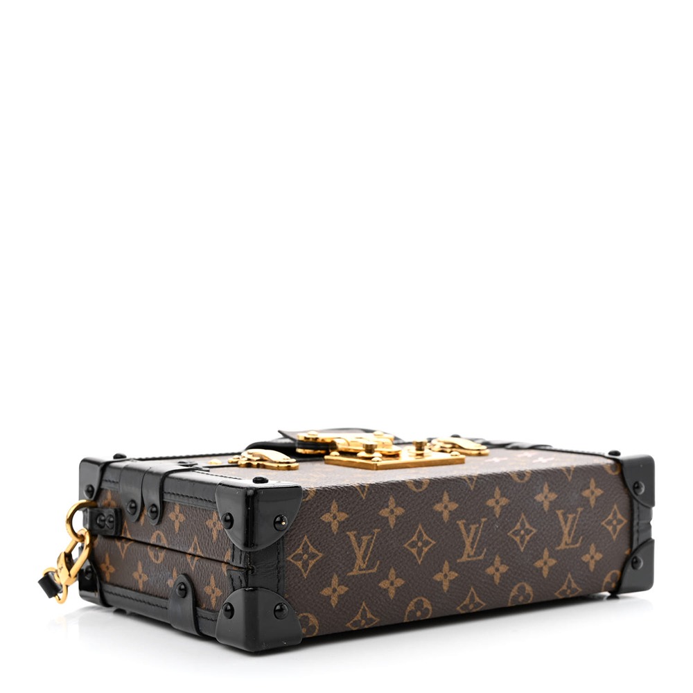 Louis Vuitto NeoNoeam Petite Malle in Black. This stylish trunk bag is crafted with Louis Vuitto NeoNoeam on toile canvas. The shoulder bag features an optional adjustable black leather shoulder strap, matching leather trim, and polished black hardware at the joints with polished brass buckles and a brass press lock.