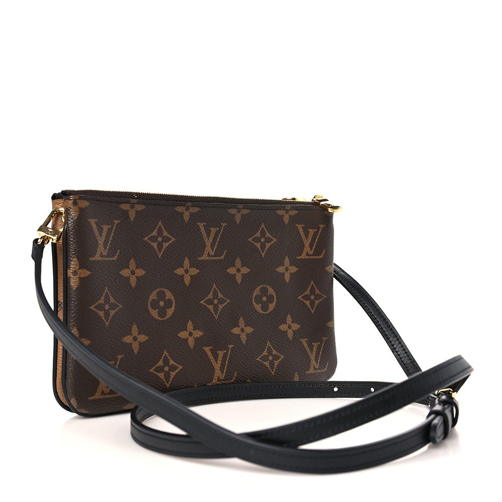 This is an Louis Vuitton Reverse Monogram Giant Double Zip Pochette. This stylish pochette is crafted of oversized Louis Vuitto NeoNoeam on reverse-colored coated canvas. The bag features black leather trim, a black adjustable leather shoulder strap, and two top zippers with gold hardware. This opens to a black microfiber interior with a patch pocket and card slots.
