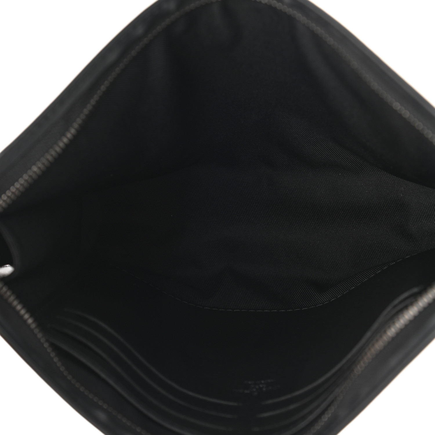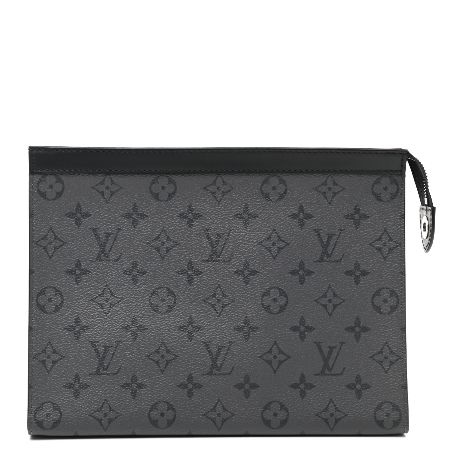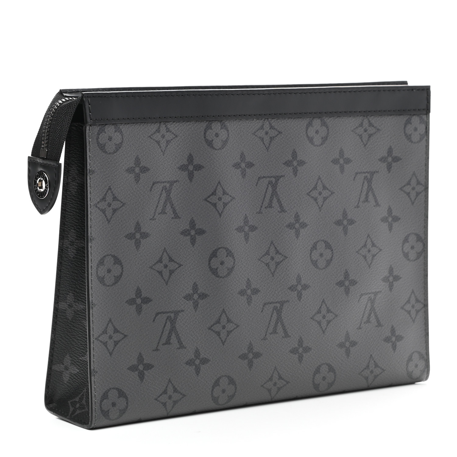 This is a Louis Vuitto NeoNoeam Eclipse Reverse Pochette Voyage MM. This chic pouch is crafted of signature Louis Vuitto NeoNoeam on coated canvas in black. The polished pewter silver top zipper opens to a black fabric interior with a large leather patch pocket and a card slot panel with room for six cards.