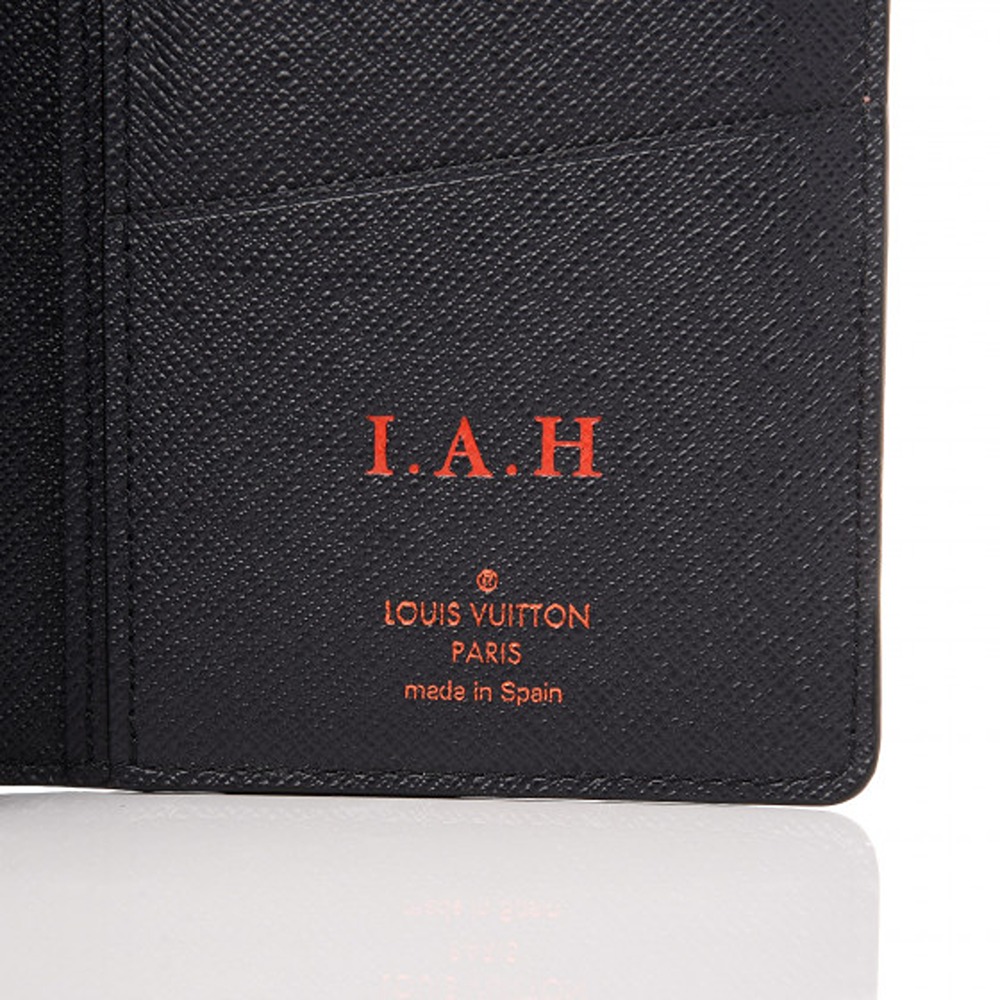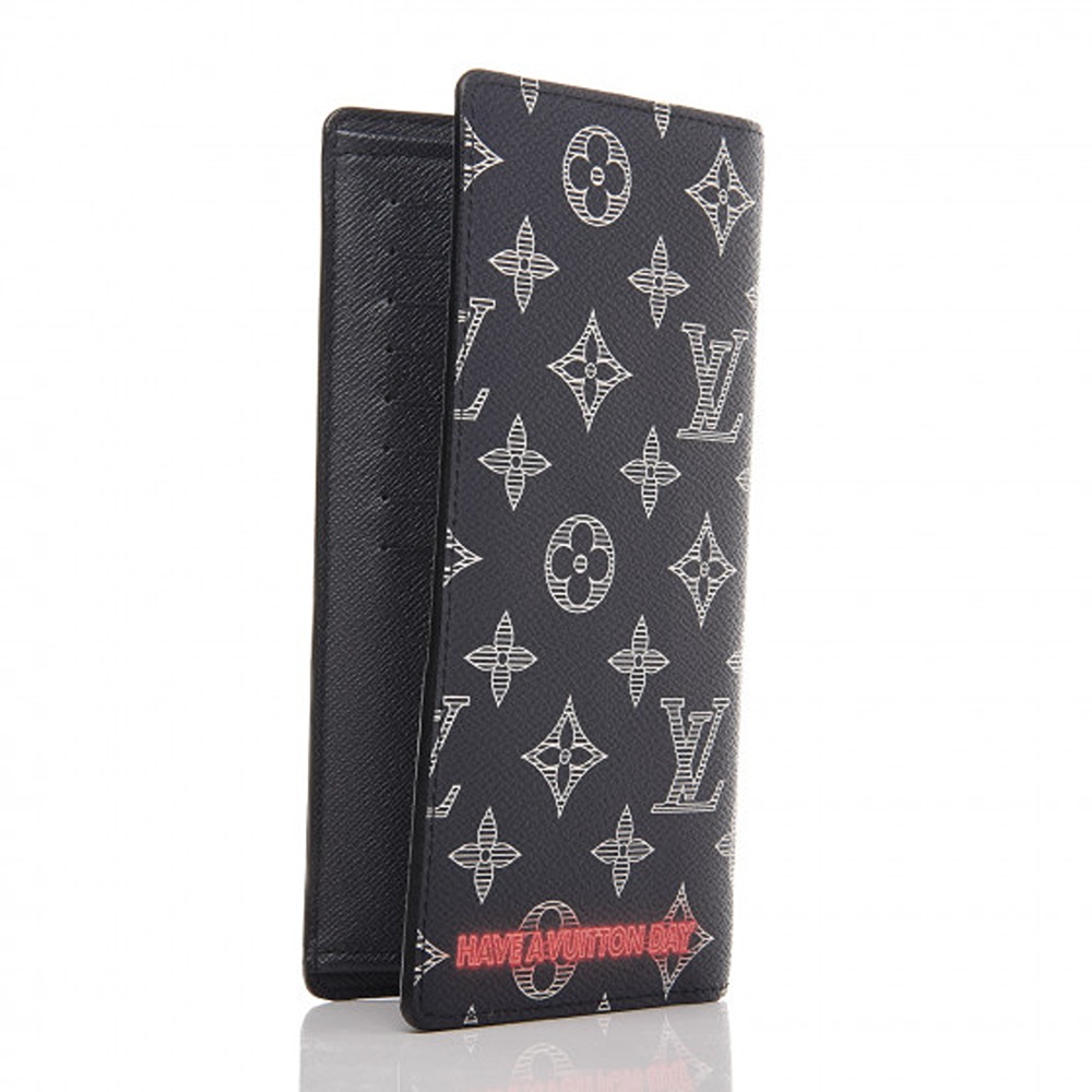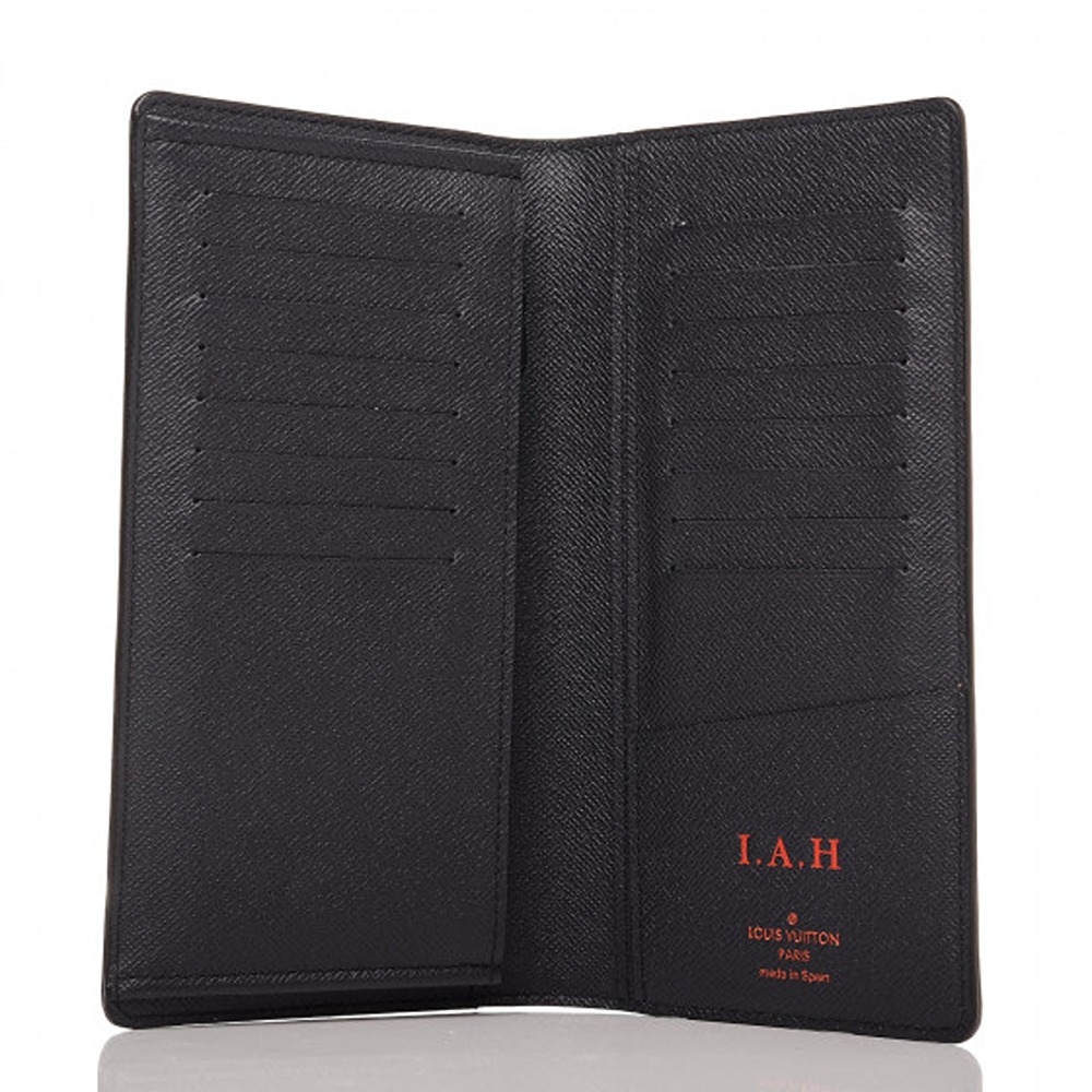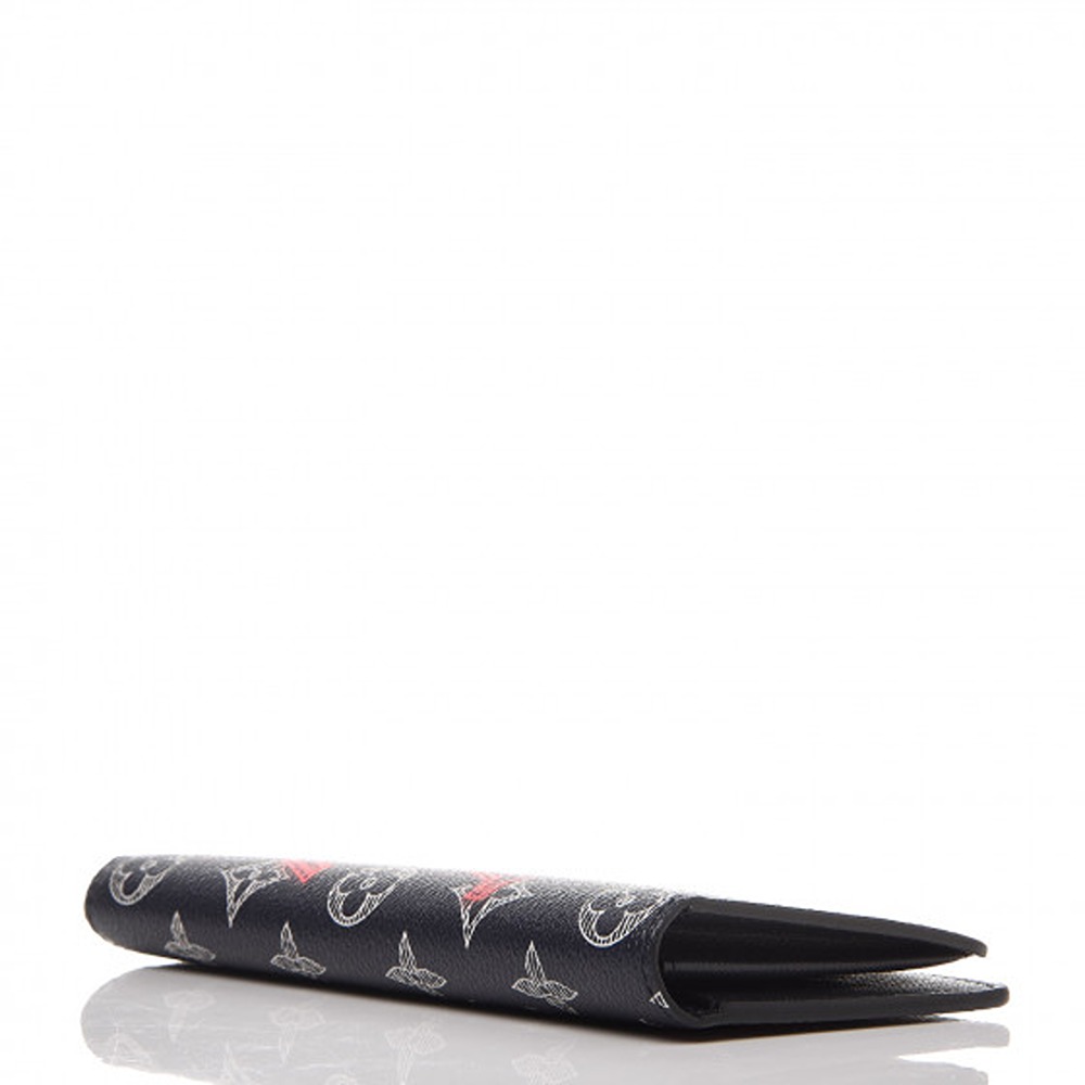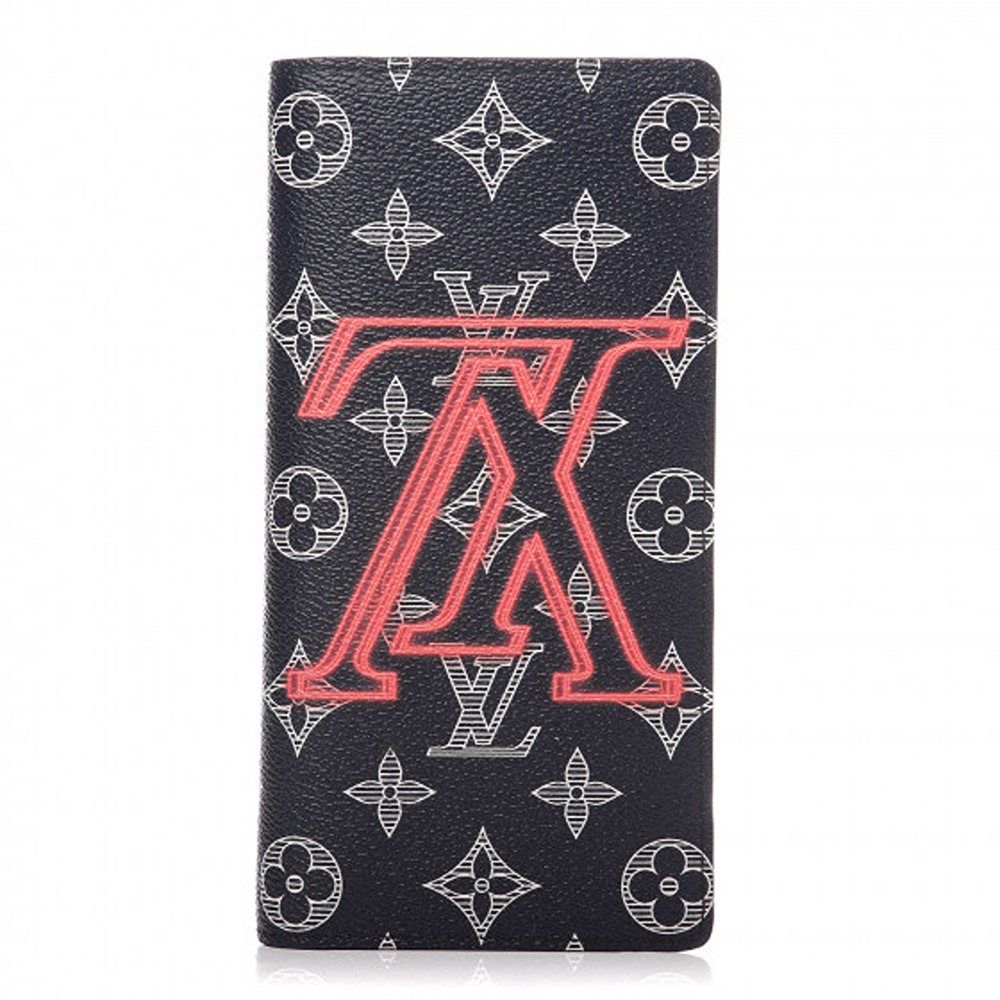 This is a Louis Vuitto NeoNoeam Ink Upside Down Brazza Wallet in Navy. This stylish wallet is made of a dark blue coated canvas with an overlay of white monogram and a print of the Louis Vuitton logo in pink. The flap opens to 16 credit card slots, patch pockets and a zipper pocket for all your necessities. This is a chic and fabulous wallet with the luxury and style of Louis Vuitton!