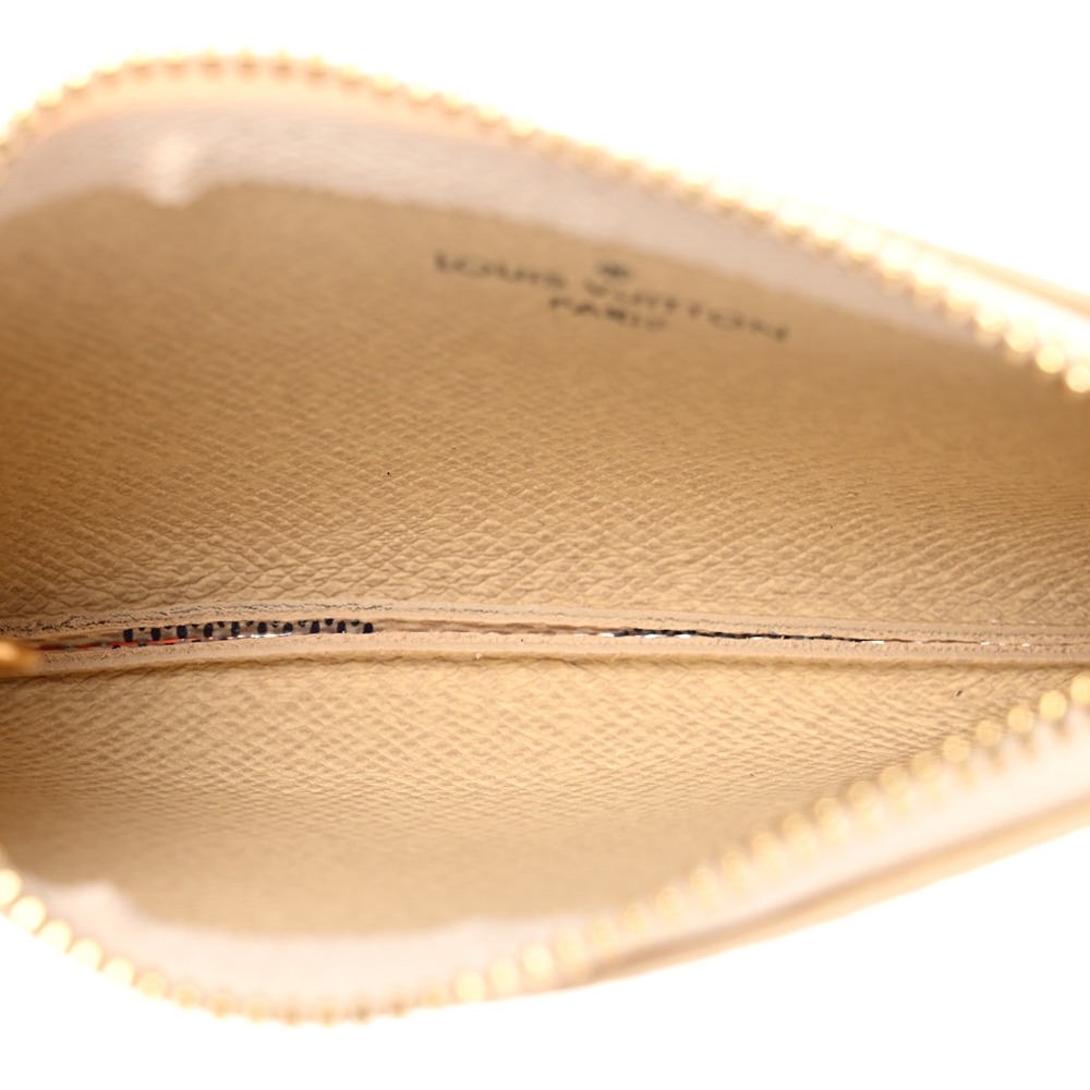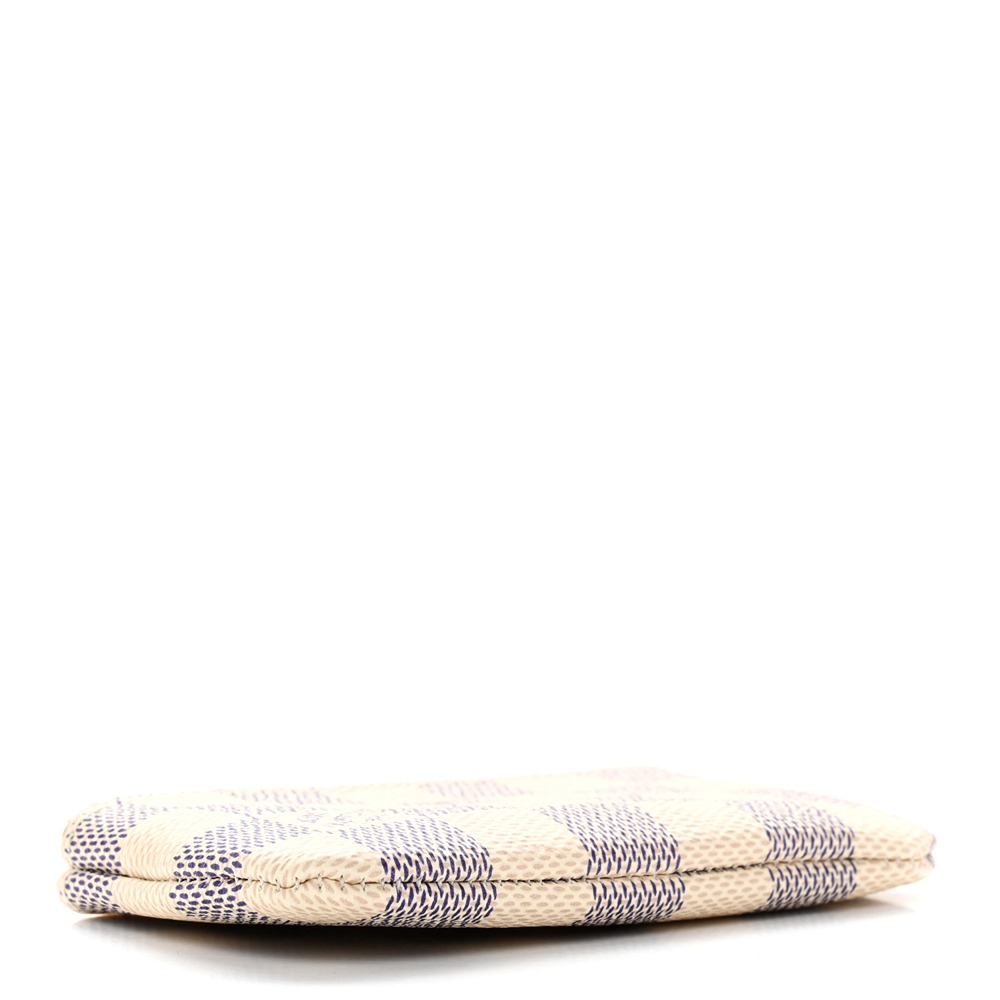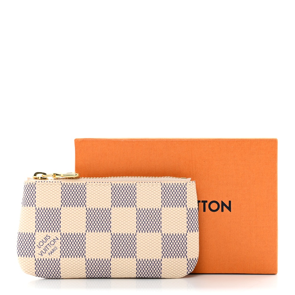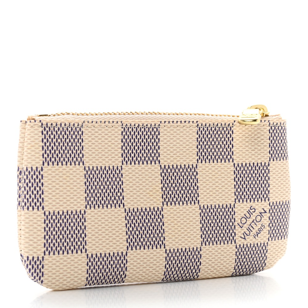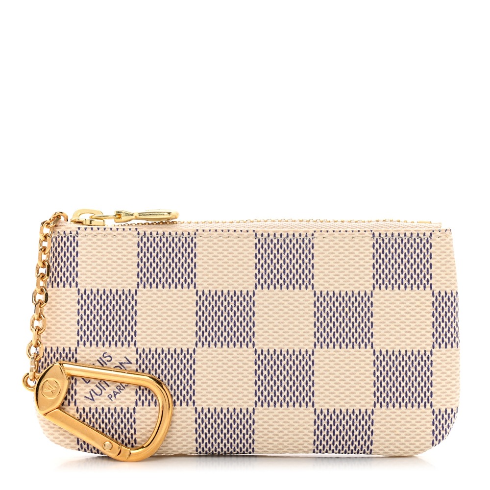 Louis Vuitton Damier Azur Key Pouch. This stylish pouch is crafted of Louis Vuitton Damier checkered toile canvas in blue and white. This coin purse has a polished brass top zipper that opens to an ivory cross-grain leather interior with a brass D-ring on a chain.