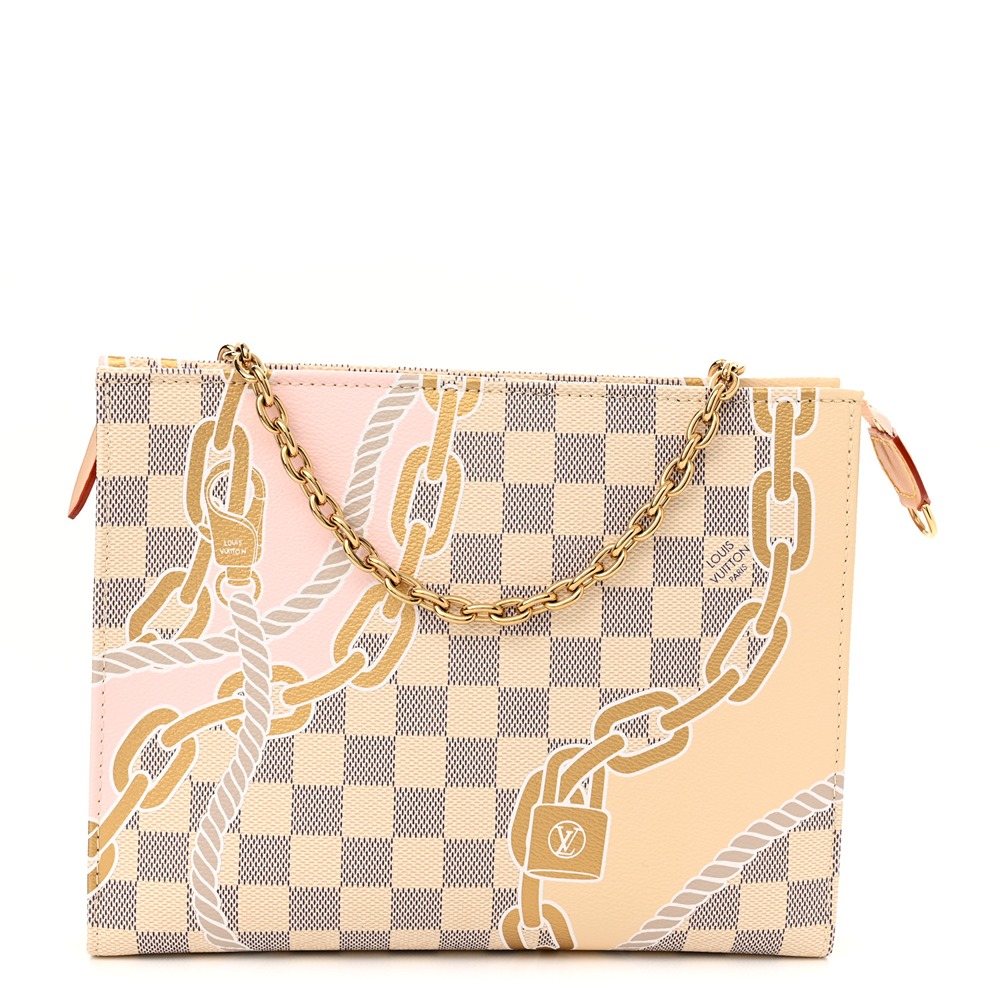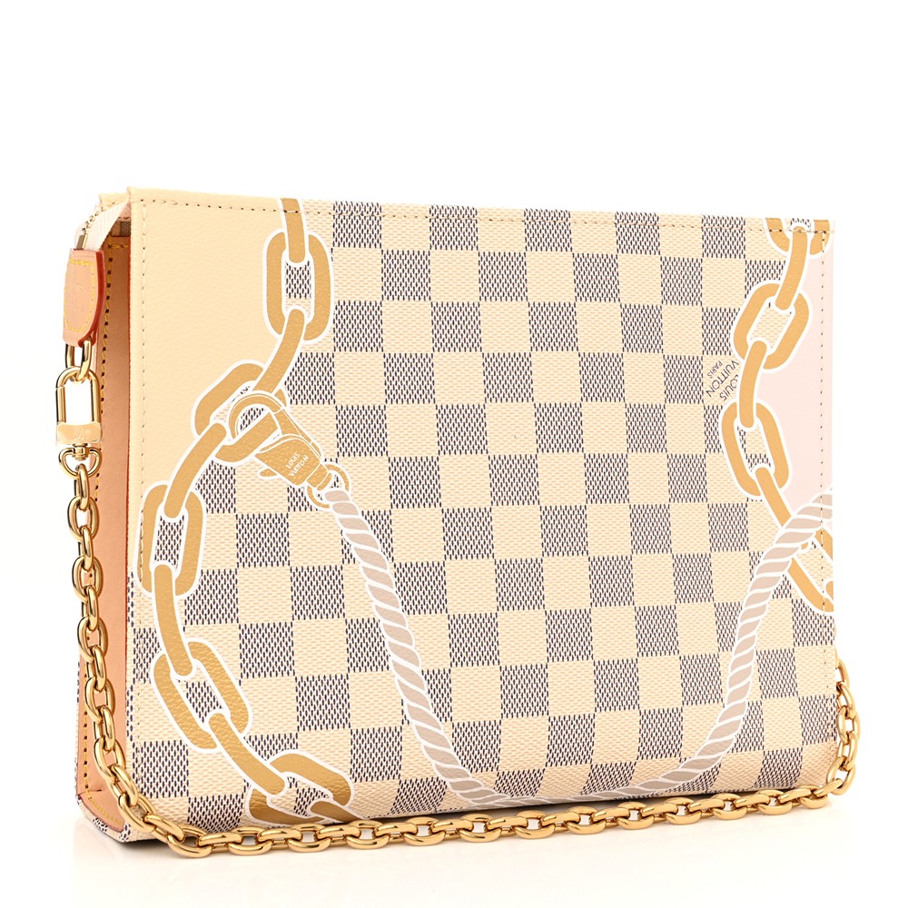 Louis Vuitton Damier Azur Nautical Toiletry Pouch On Chain. This handy travel accessory is crafted of traditional Louis Vuitto NeoNoeam-coated canvas with vachetta leather trim on a removable gold-toned chain. The pouch features a brass top zipper that opens to a beige fabric interior with a patch pocket.