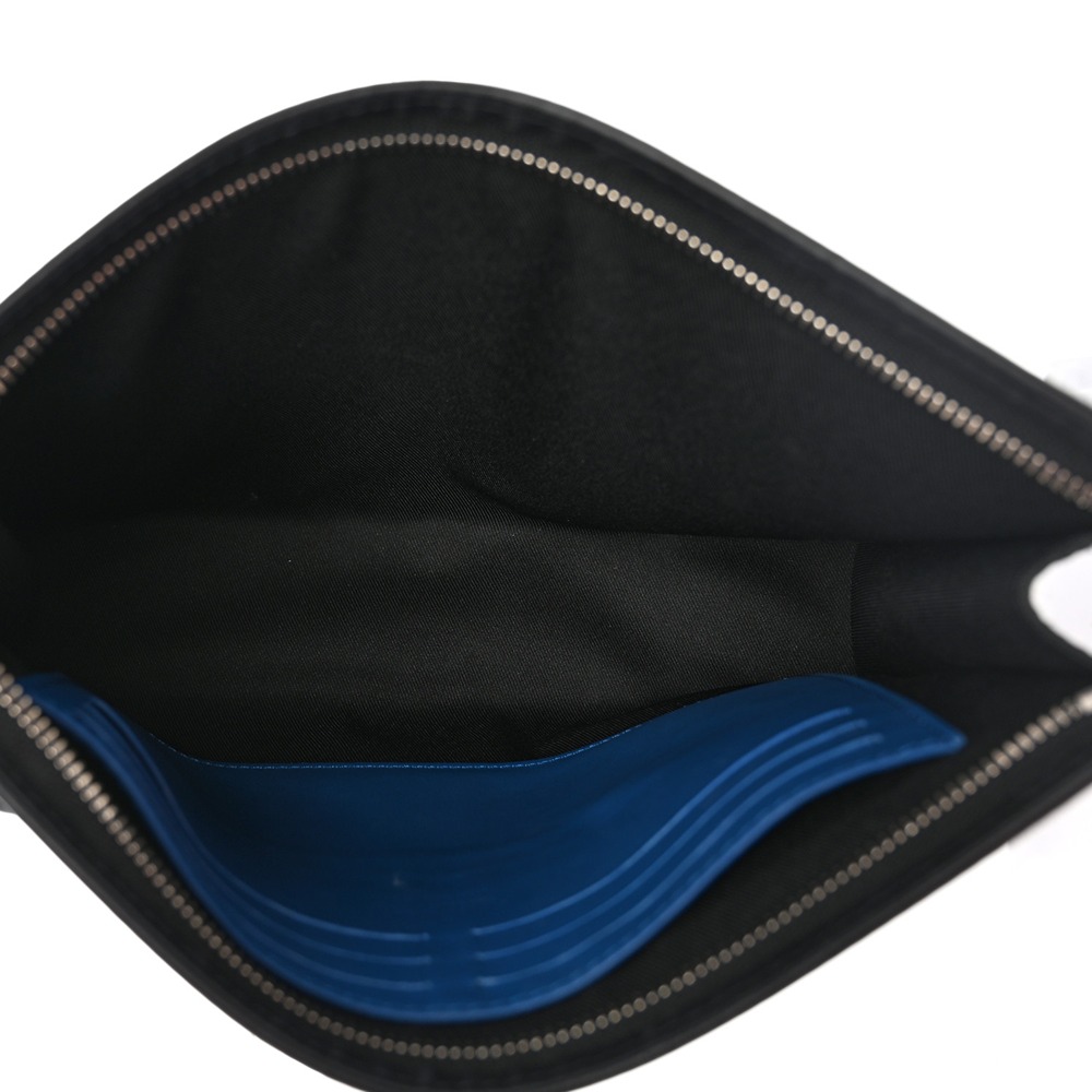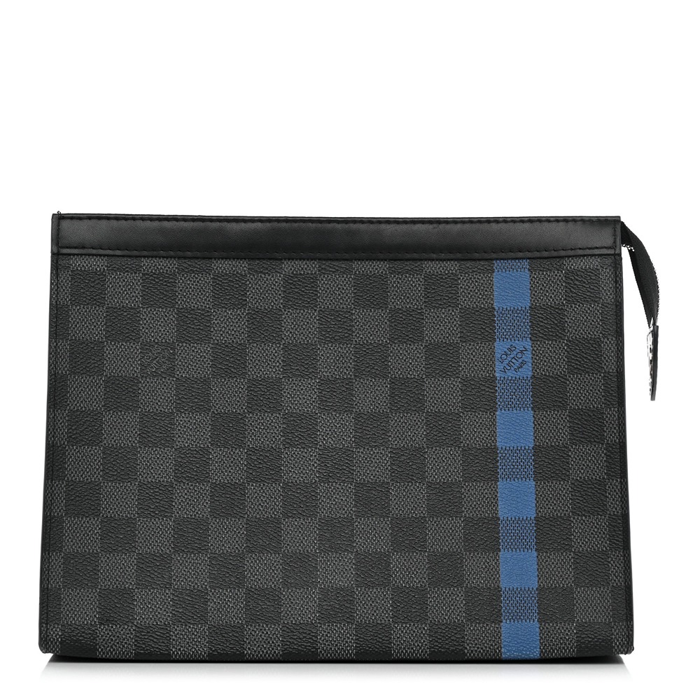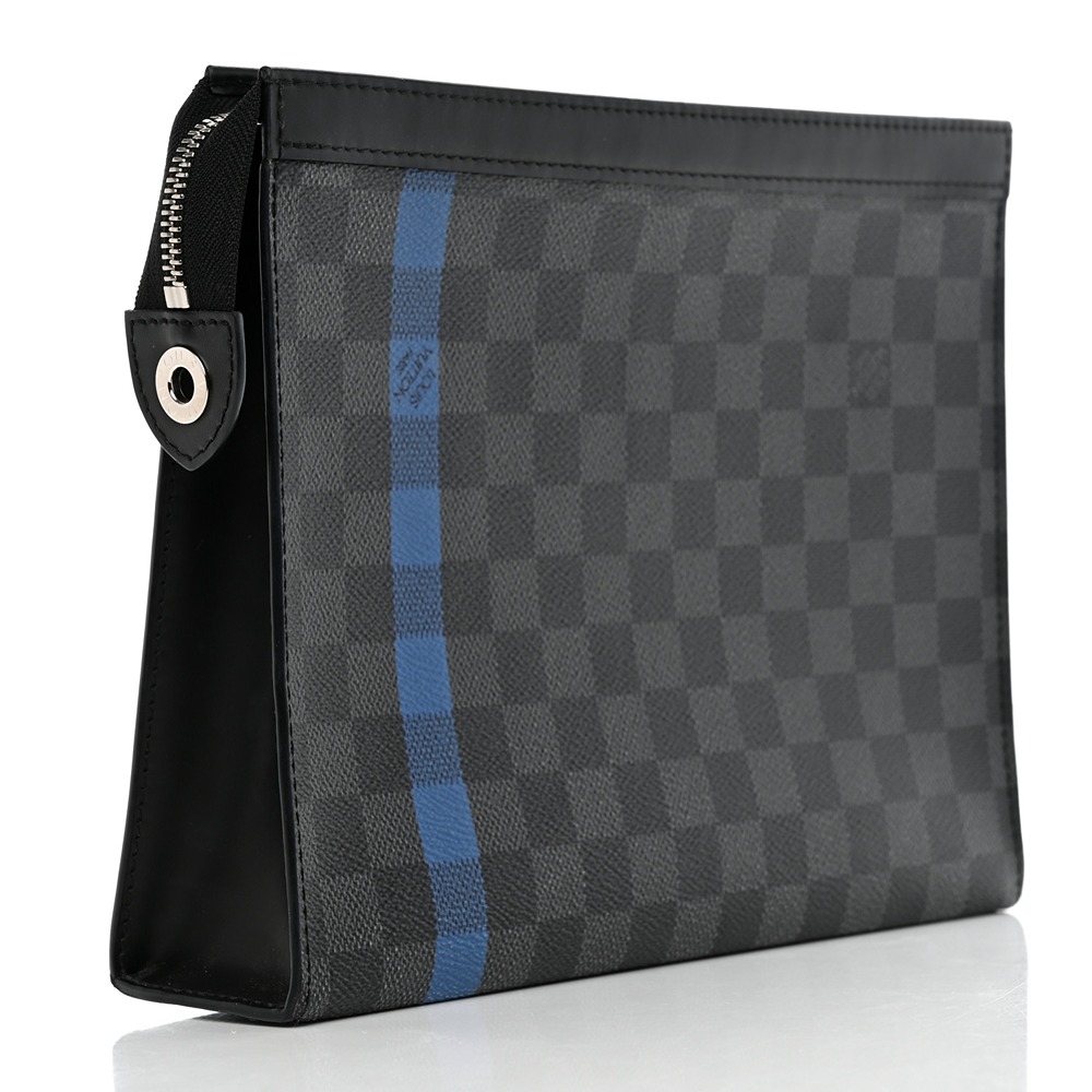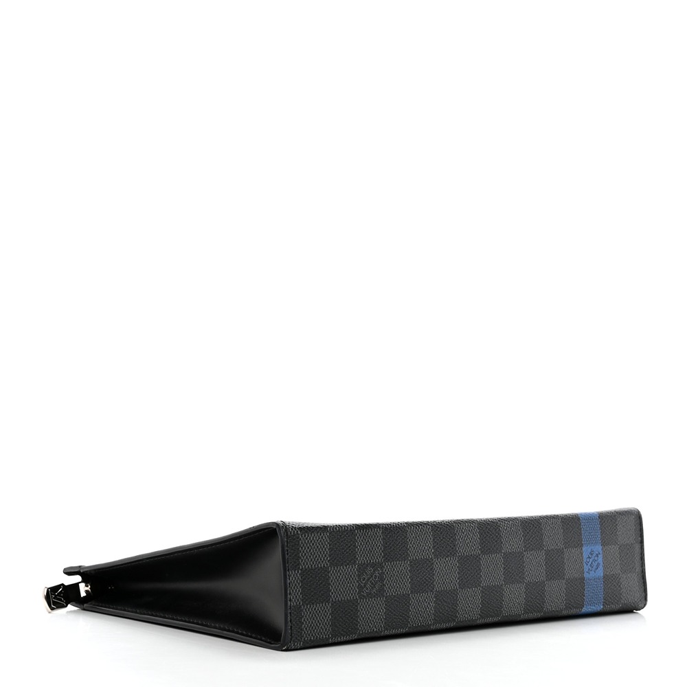 This is an Louis Vuitton Damier Graphite Stripe Pochette Voyage MM in Blue. This chic pouch is crafted of signature Louis Vuitton damier on coated canvas in black and grey with a blue accent stripe. The polished dark silver top zipper opens to a black fabric interior with a large leather patch pocket and a card slot panel.