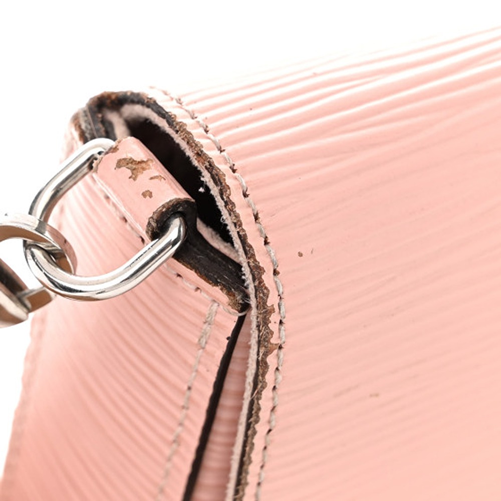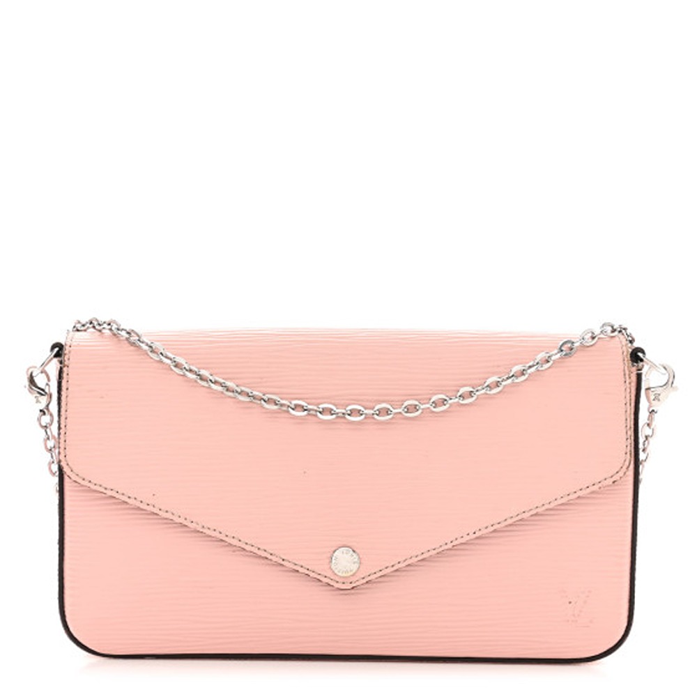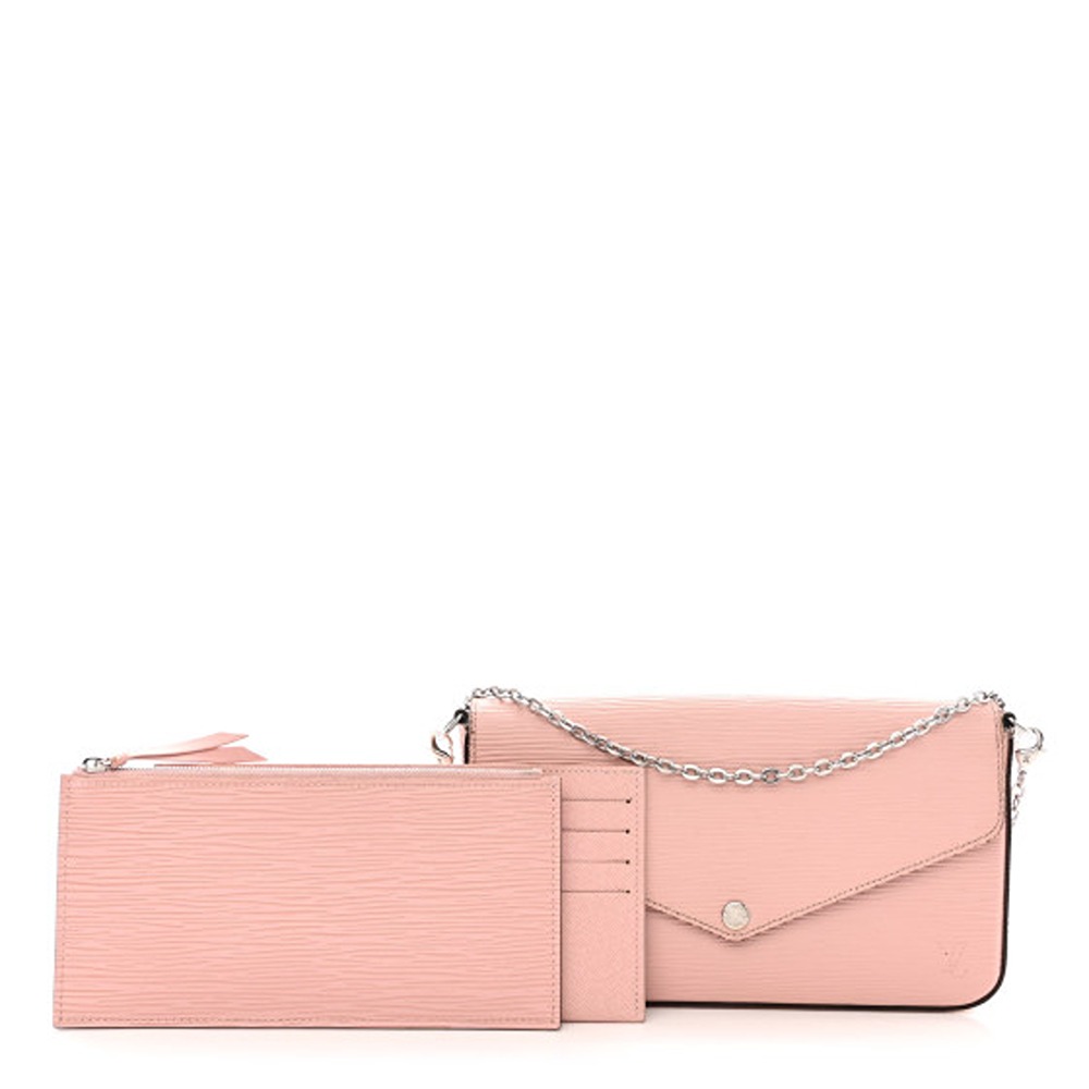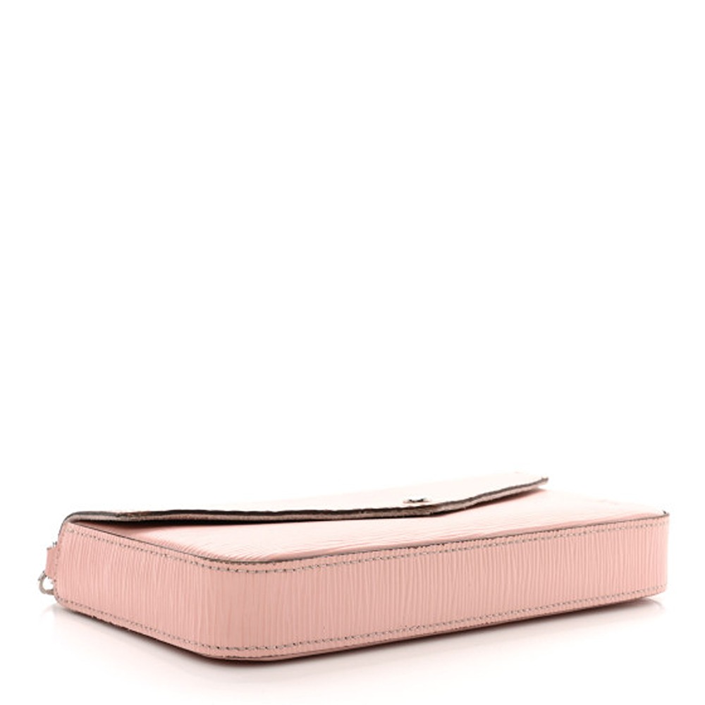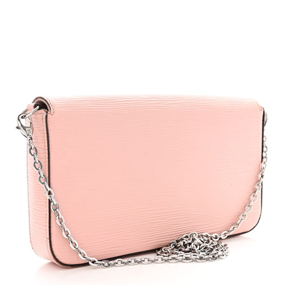 This is a Louis Vuitton Epi Pochette Felicie in Rose Ballerine. This stylish wallet is crafted of Louis Vuitton’s signature textured epi leather in light pink. The shoulder bag features a removable polished silver chain-link shoulder strap and an envelope style flap. This opens with a silver snap to a pink microfiber interior with a patch pocket.
