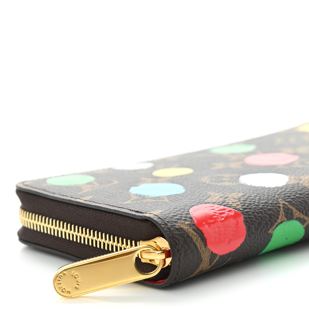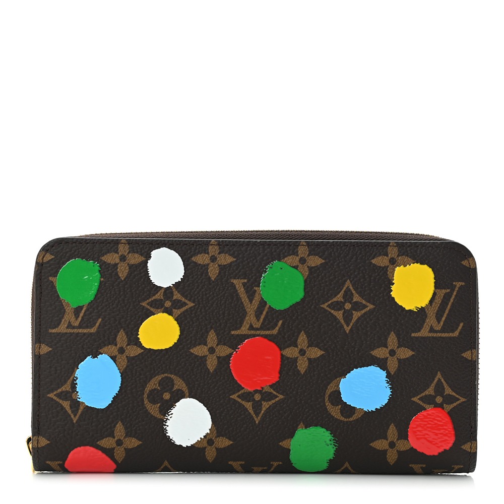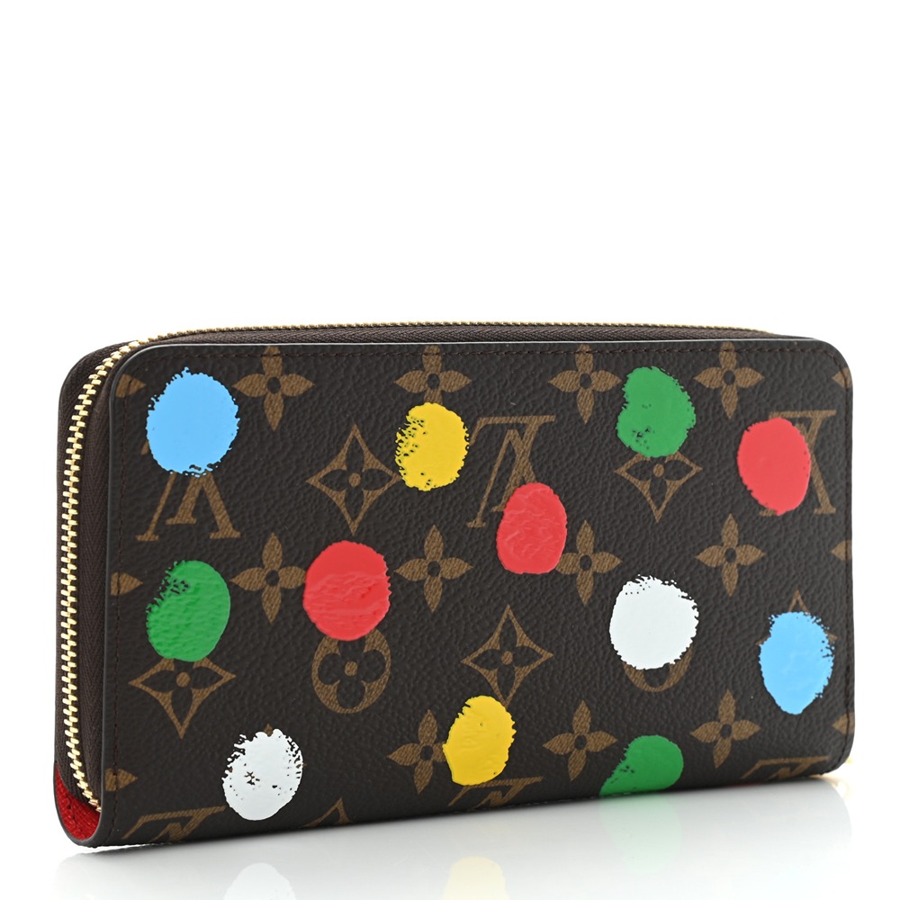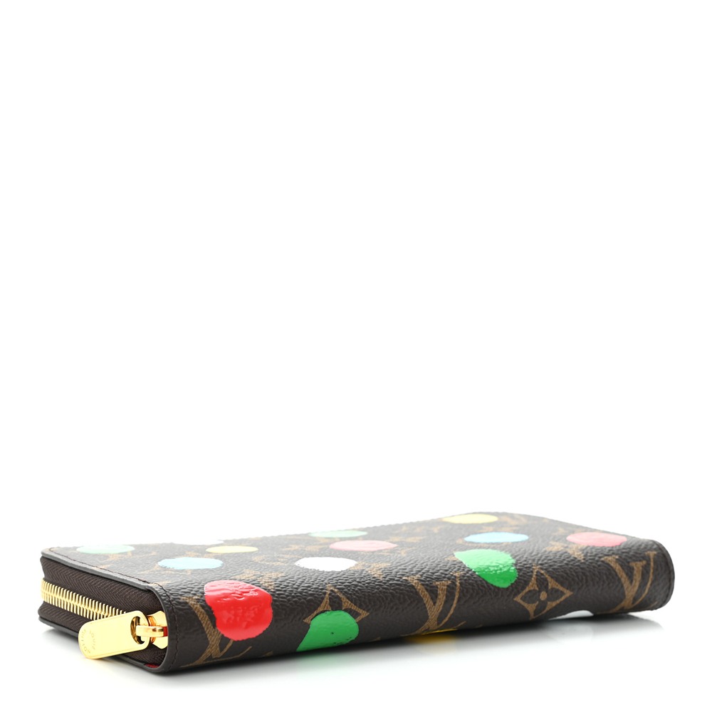 Louis Vuitton LV X YK Monogram Zippy Wallet. This wallet is crafted of Louis Vuitto NeoNoeam on toile canvas and features an overlay screen printing of colorful dots. The wrap-around zipper opens to a red leather interior. Inside the wallet are card slots, a central zipper coin compartment and pockets.