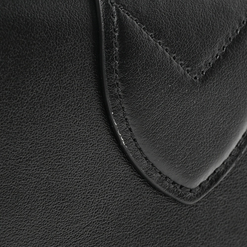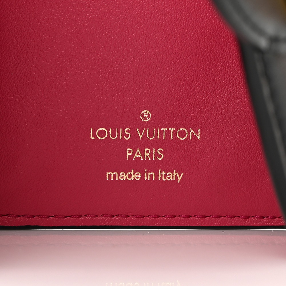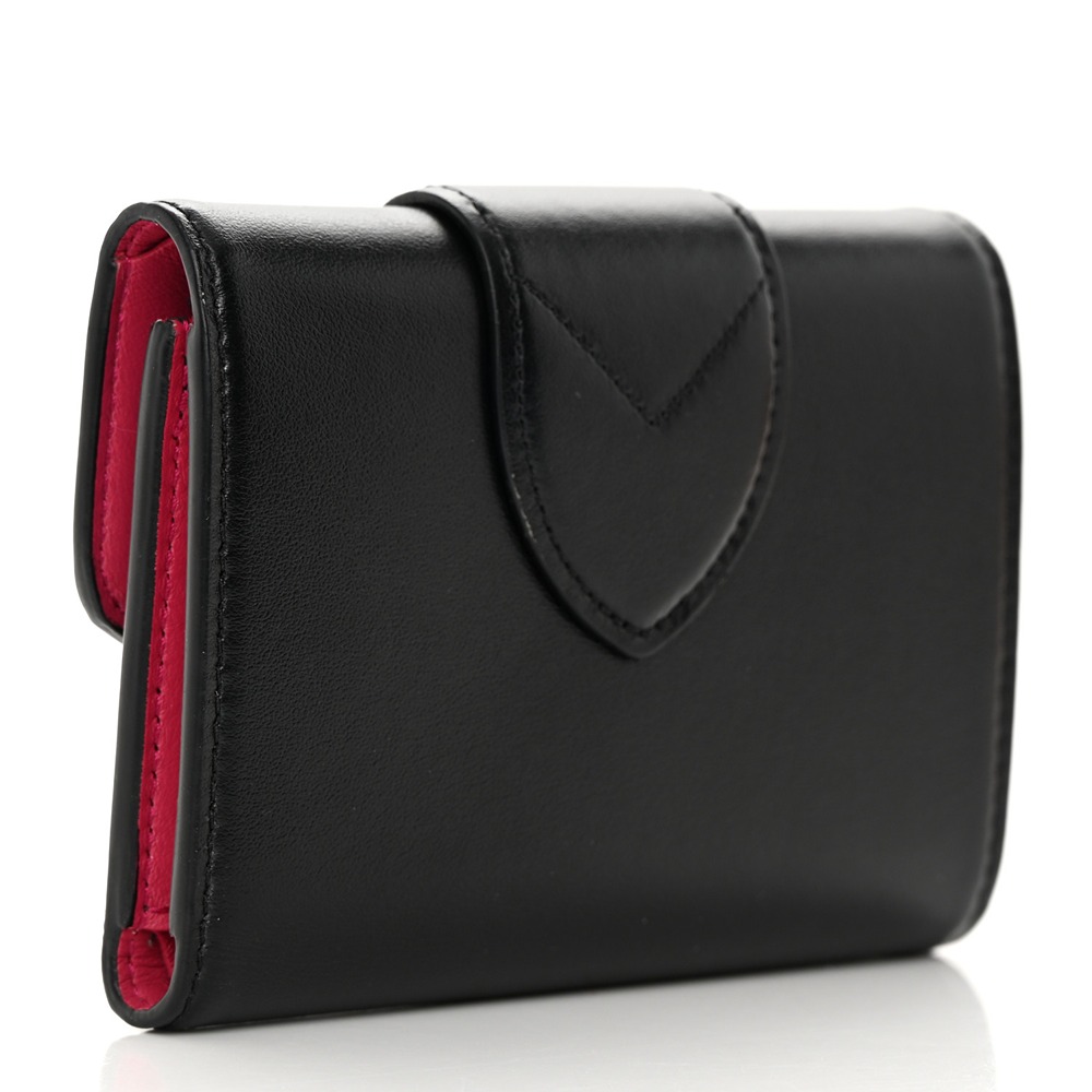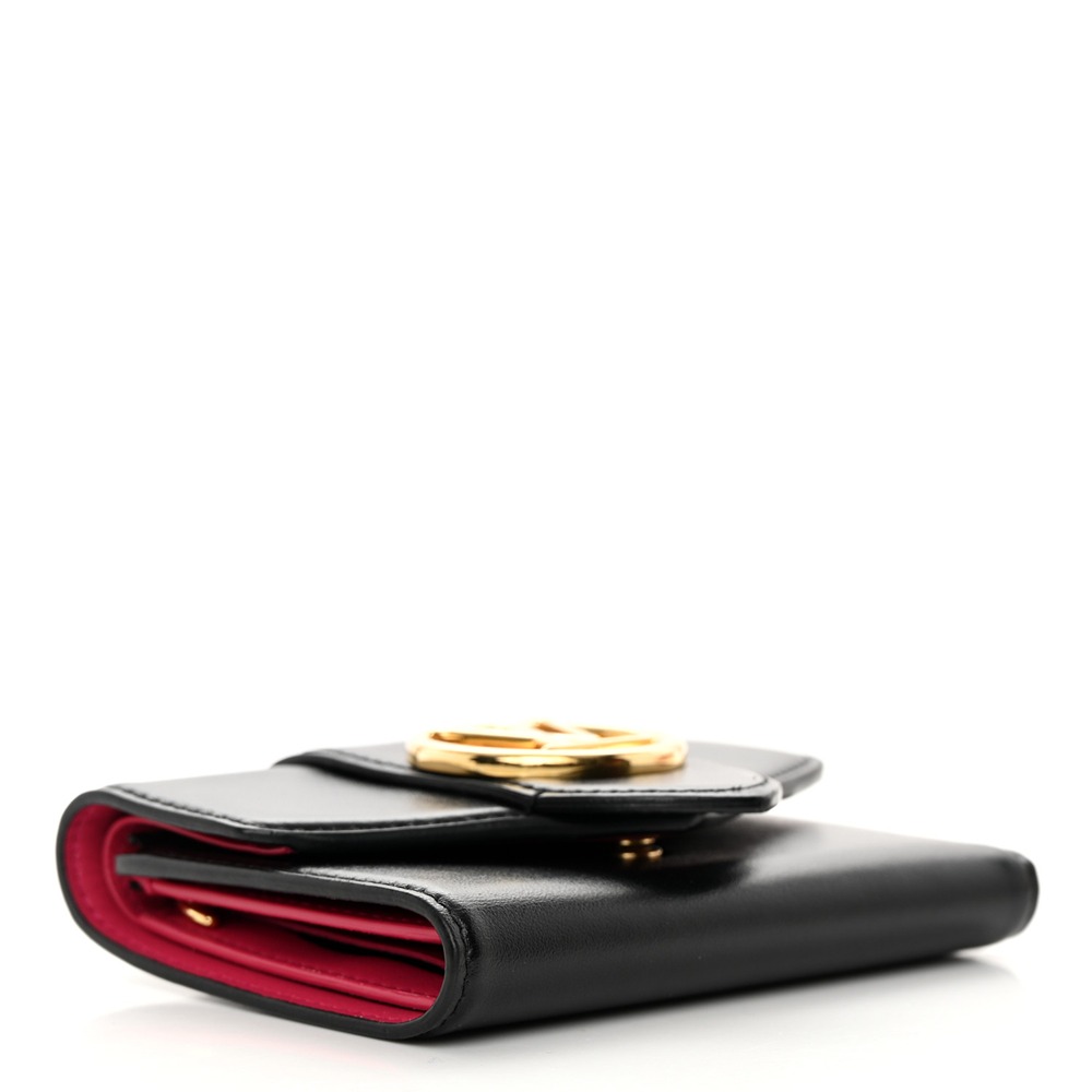This is a Louis Vuitton Smooth Calfskin LV Pont 9 Compact Wallet in Black. This wallet is crafted of smooth calfskin leather in black with a LV logo circular medallion. The front flap opens to a pink leather interior with card slots, patch pockets, a bill compartment, and a zipper pocket.