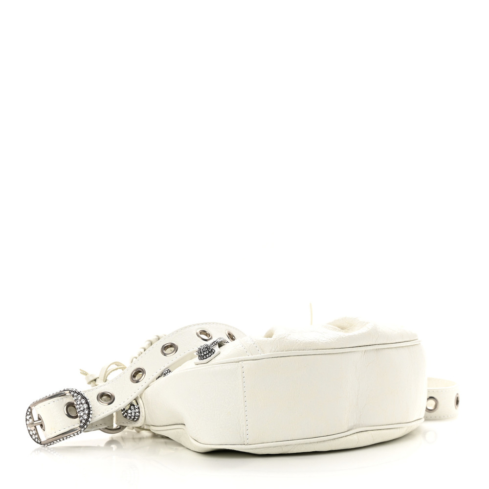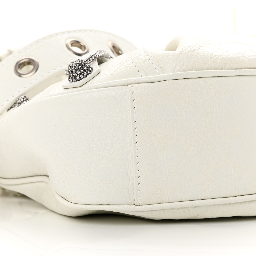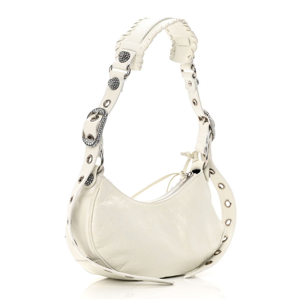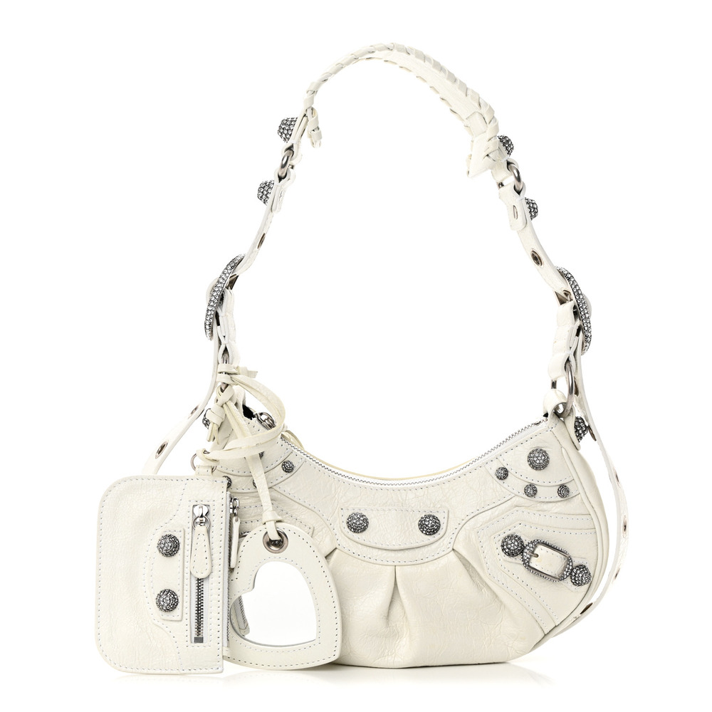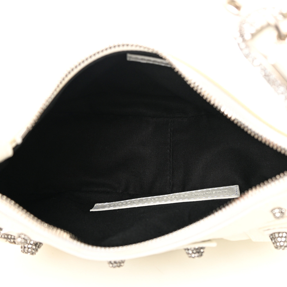 This stylish and structured handbag is crafted of calfskin leather in white. The bag features an adjustable leather shoulder strap with silver links, crystal studs and buckle, a mirror, and a coin purse The top unzips to a black fabric compact interior.