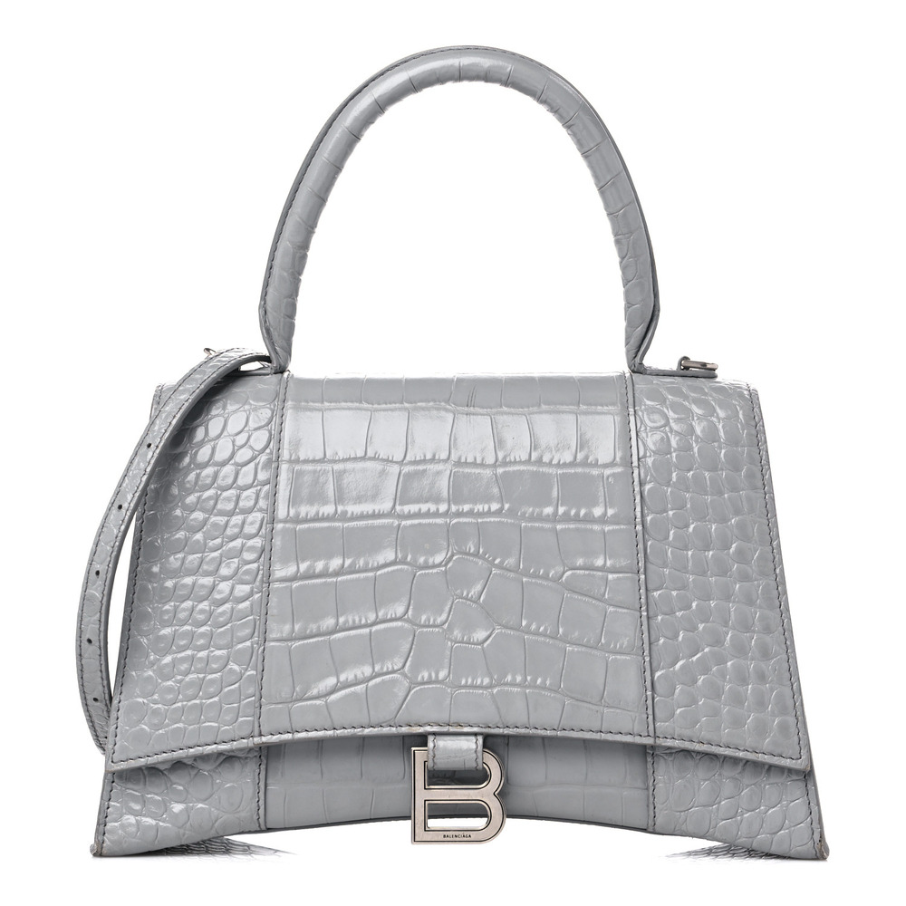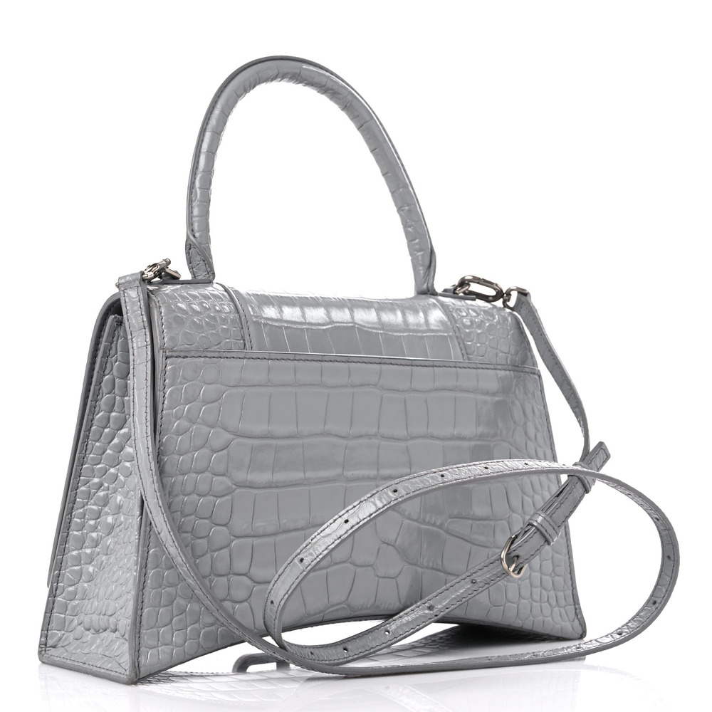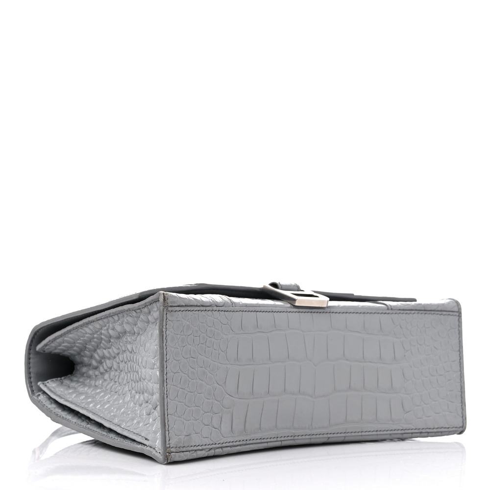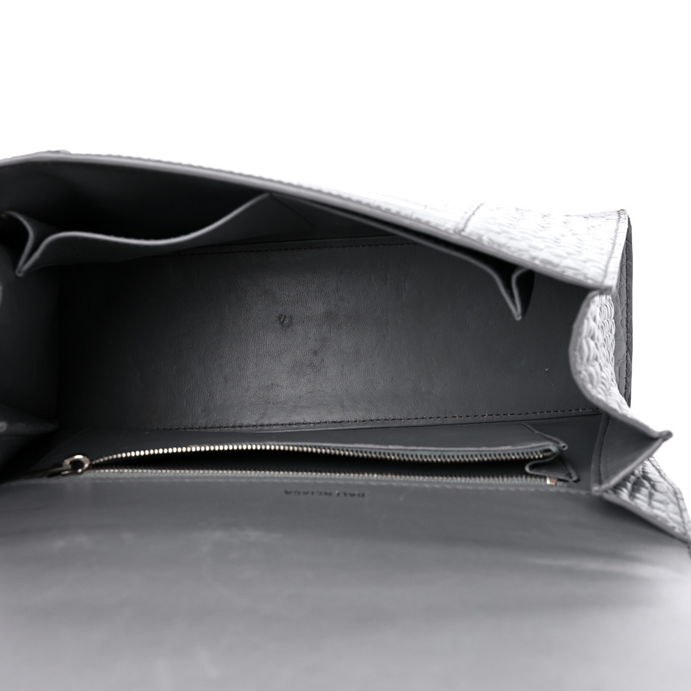 This petite handbag is crafted of crocodile stamped glazed calfskin in black. It features a top handle and an optional shoulder strap. This bag also features the signature Balenciaga B charm, aged gold hardware, and slip pocket at back. The front flap opens to a black leather interior.