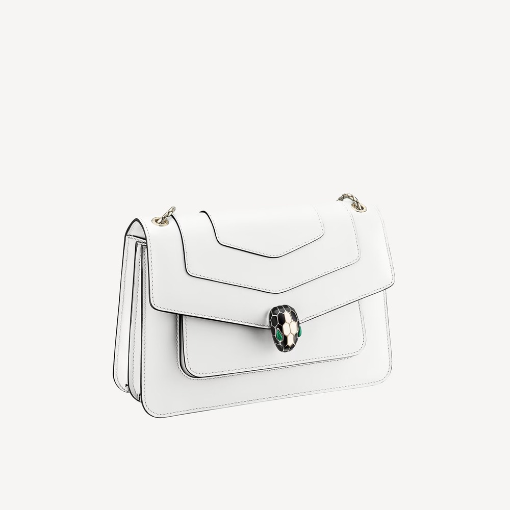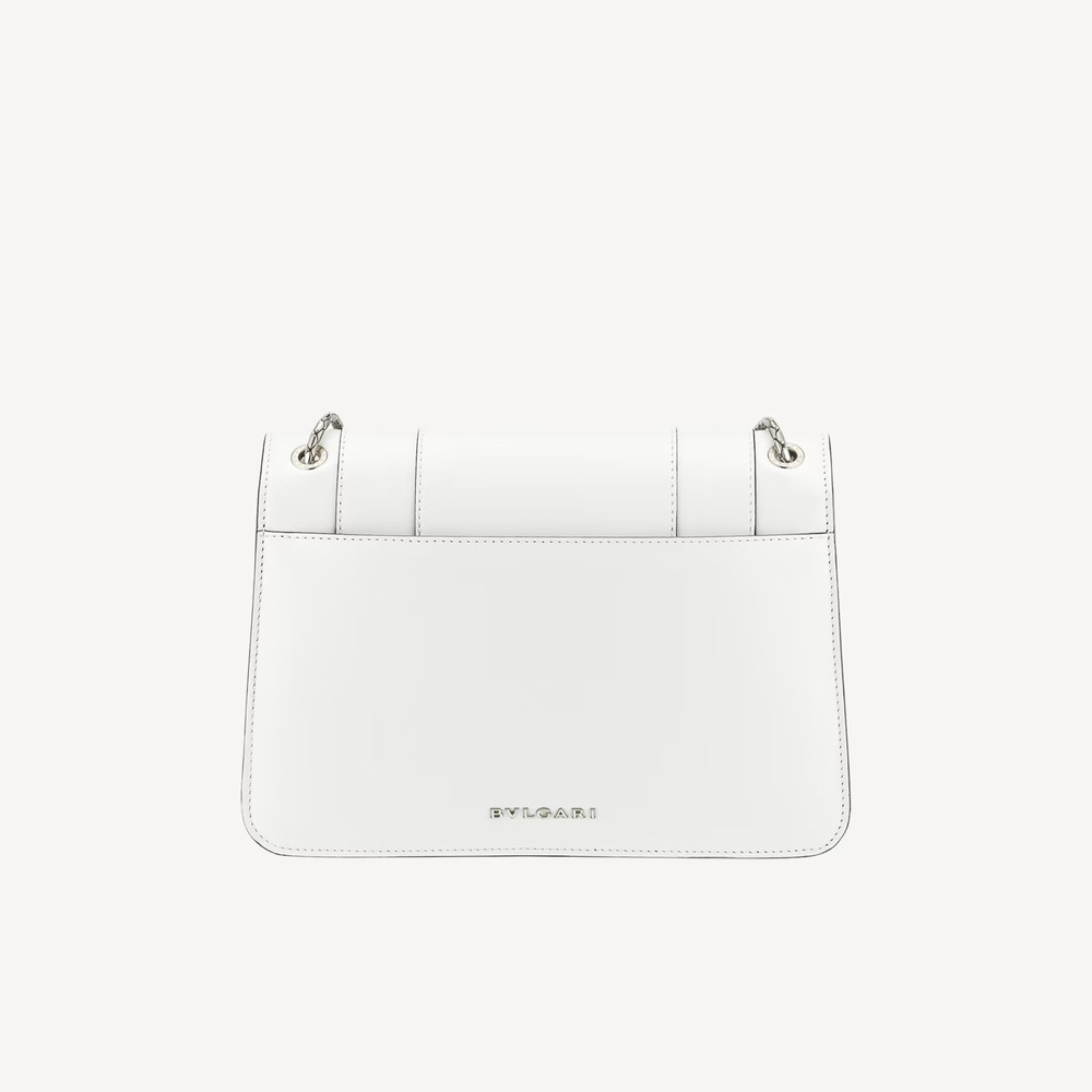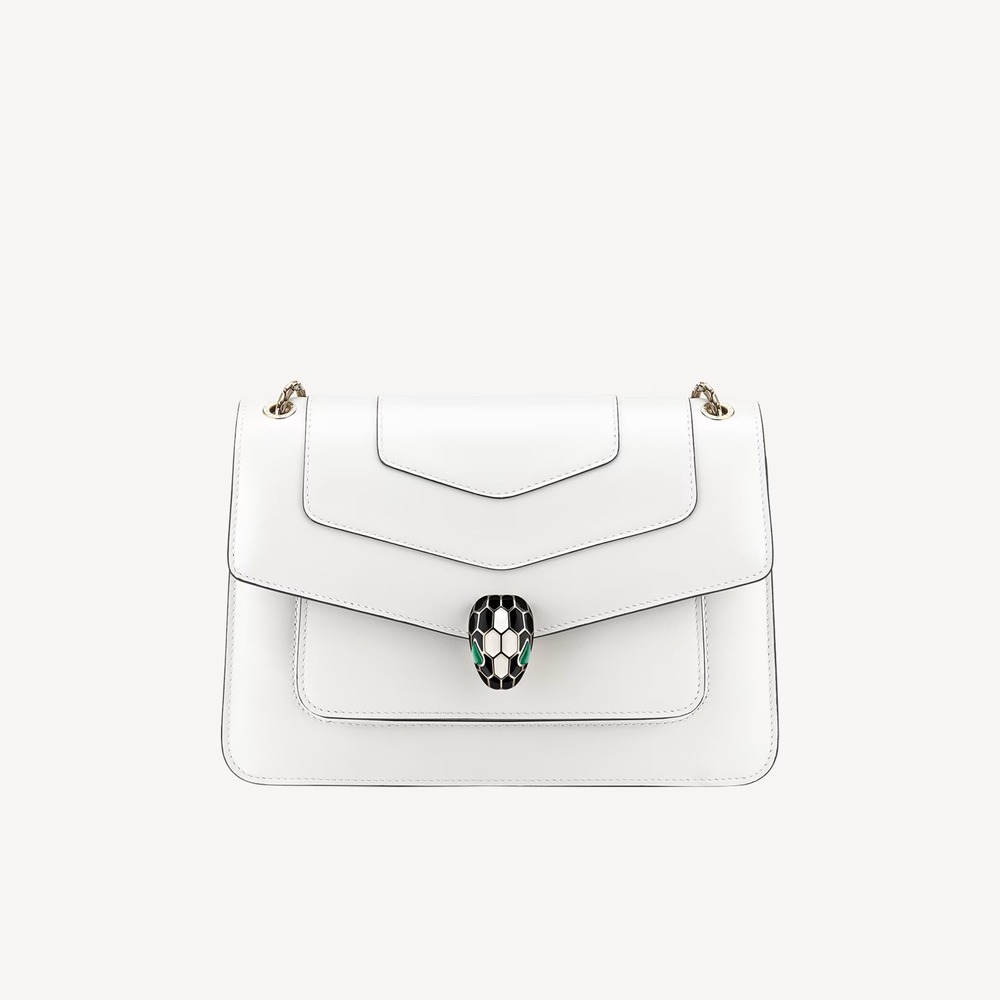 Renewing its timeless appeal with exquisite colours, the Serpenti Forever small crossbody bag is crafted in primrose quartz pink calf leather. Endowed with a snake body-shaped chain strap, the creation is topped by the iconic snakehead magnetic closure, whose mesmerising scales and design, draw from the Serpenti jewels of the 60’s. Featuring a single compartment, the model is completed by a mirror pocket with customisable mirror and the BULGARI metal logo on the back. 20 x 15 x 4.5 cm – 7.9 x 5.9 x 1.8 inches. Made in Italy.