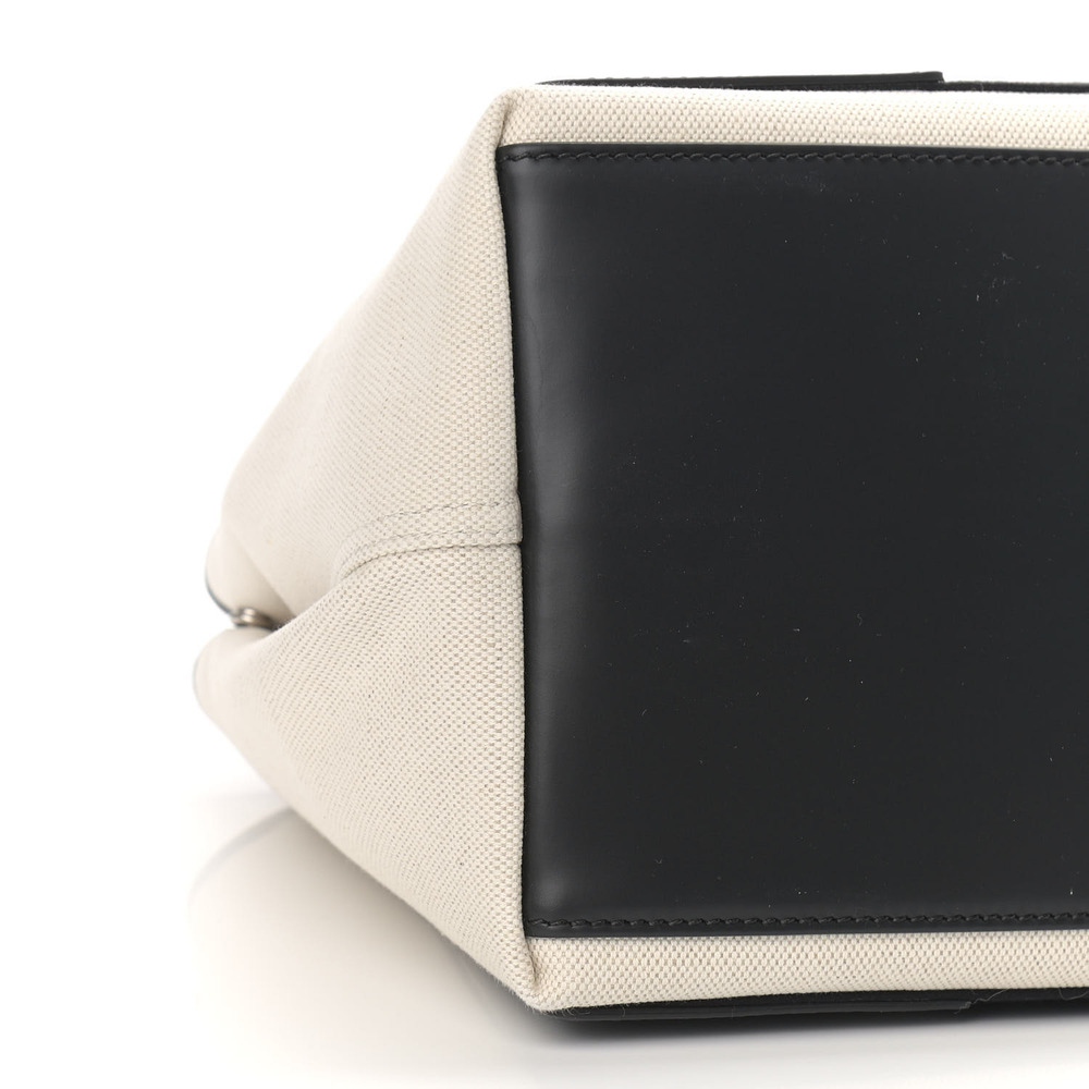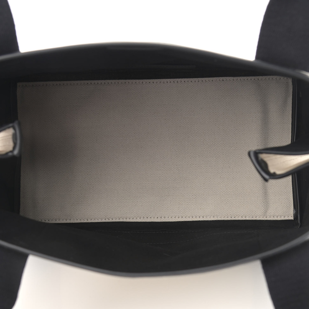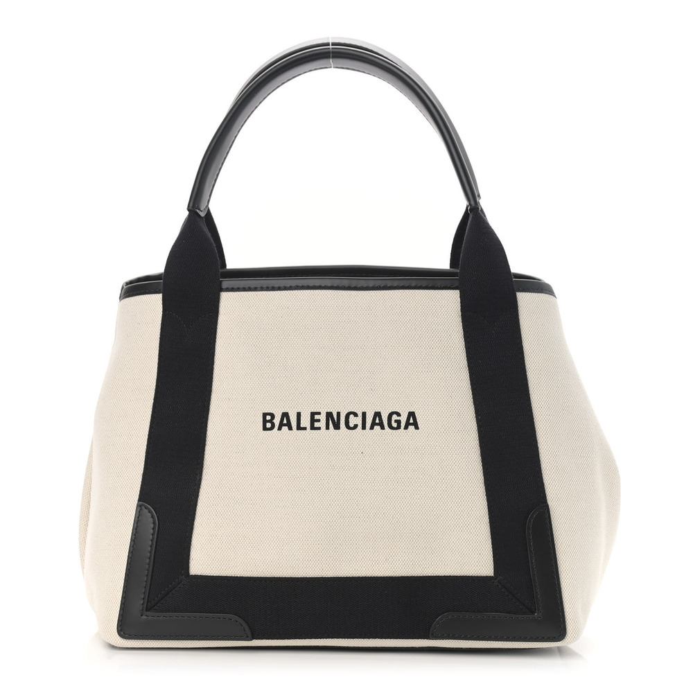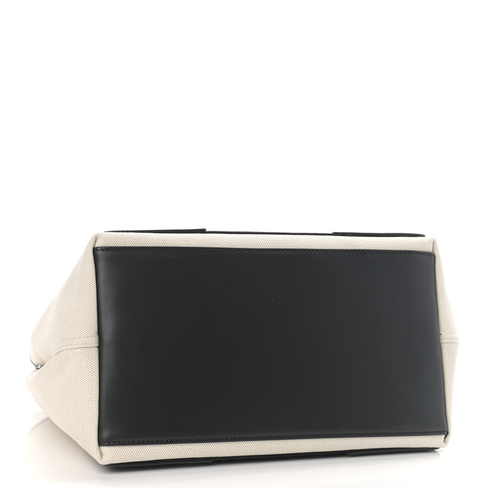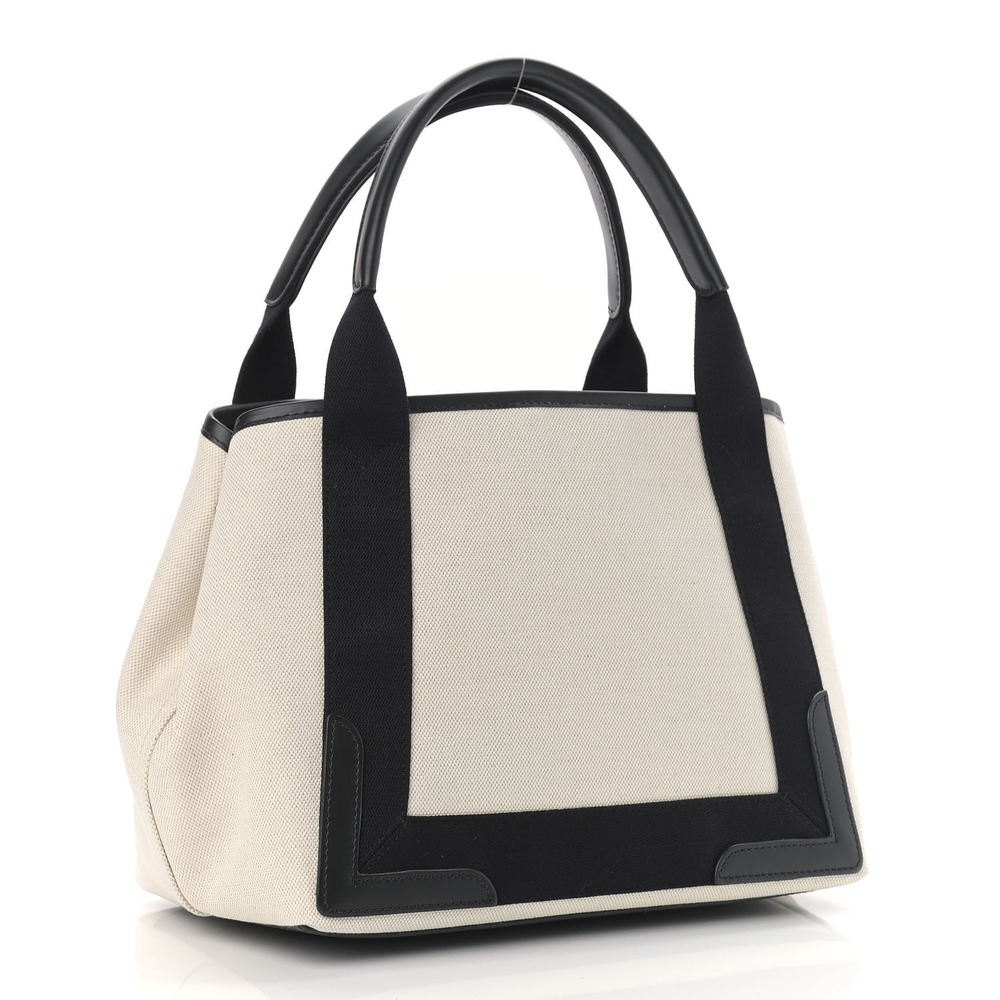 This tote is crafted of ivory canvas and black leather trim. This tote features black nylon accents that extend into top handles with leather grips and a BALENCIAGA logo. The top is open to a black linen interior with a matching removable pouch.