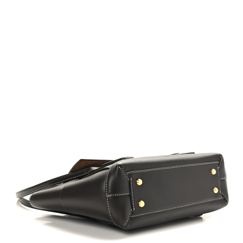 This stylish shoulder bag is crafted of natural French calf leather in black. The bag features top handles and gold hardware. The crossover flap opens to a brown suede interior with a hanging zipper and patch pockets.