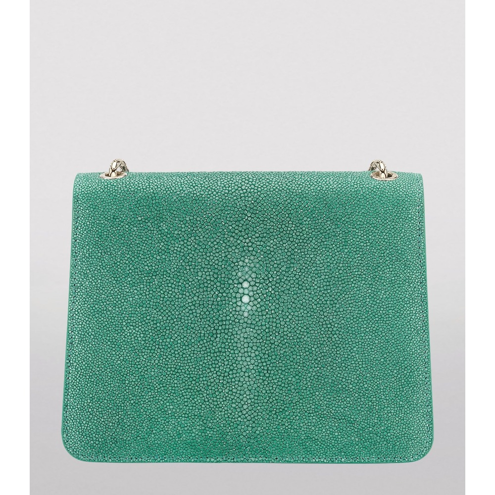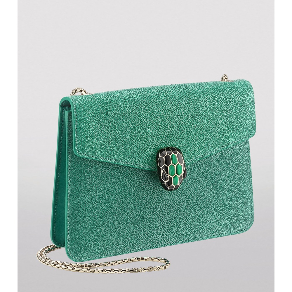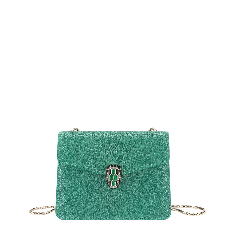 Exemplifying high-octane glamour and opulence, the Bvlgari Serpenti Forever cross-body bag is inspired by ancient Greek and Roman mythology. This iteration is crafted from textured Galuchat leather in a hue that matches the icon of the collection ? the seductive serpent clasp, encrusted with precious malachite eyes to bring healing and positive energy to the wearer.