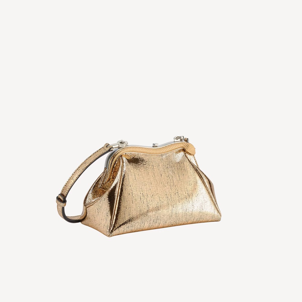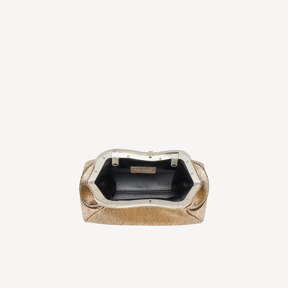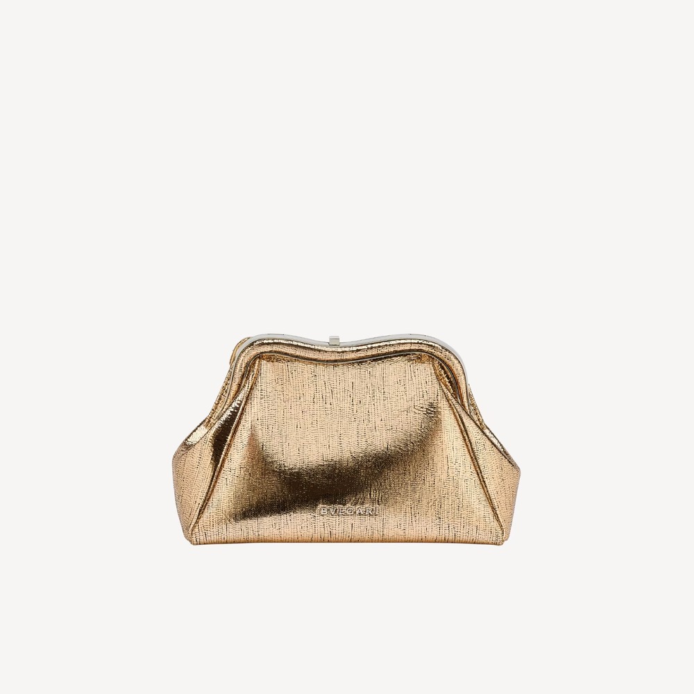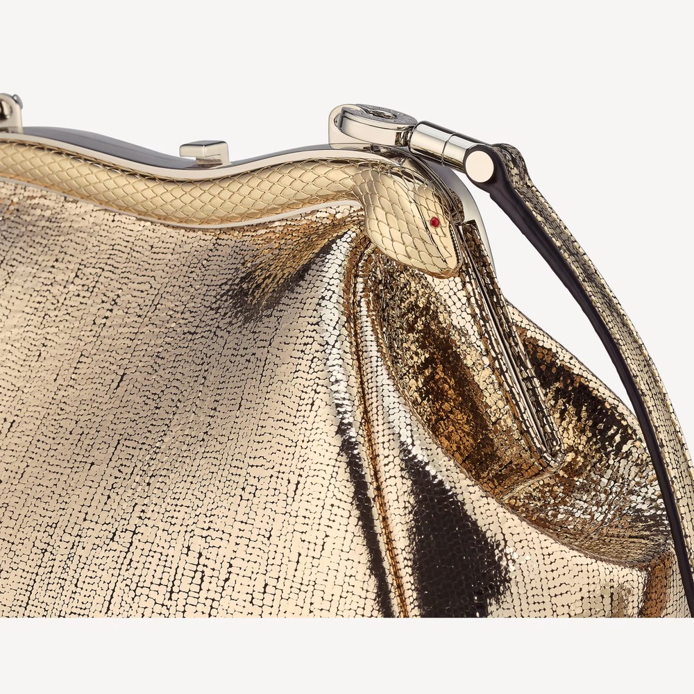 An audacious reinvention of a timeless icon, the day-to-night Serpentine small pouch in black smooth calf leather combines a soft on-trend shape with a jewellery-inspired detail evoking the serpent’s sinuous movements. Featuring a gold-plated brass snake body-shaped frame inspired by the bold Serpenti heritage necklaces of the 1960s, this bag offers multiple styles in one ? its curvaceous metallic top is embellished with engraved scales and red enamel eyes on the front, for a glam look, and a plain calf leather insert on the back for a more casual attitude. The model is completed by a single compartment, a press button closure, a leather strap and the BULGARI metal logo on the back. 19.5 x 14 x 10 cm – 7.7 x 5.5 x 3.9 inches. Made in Italy.