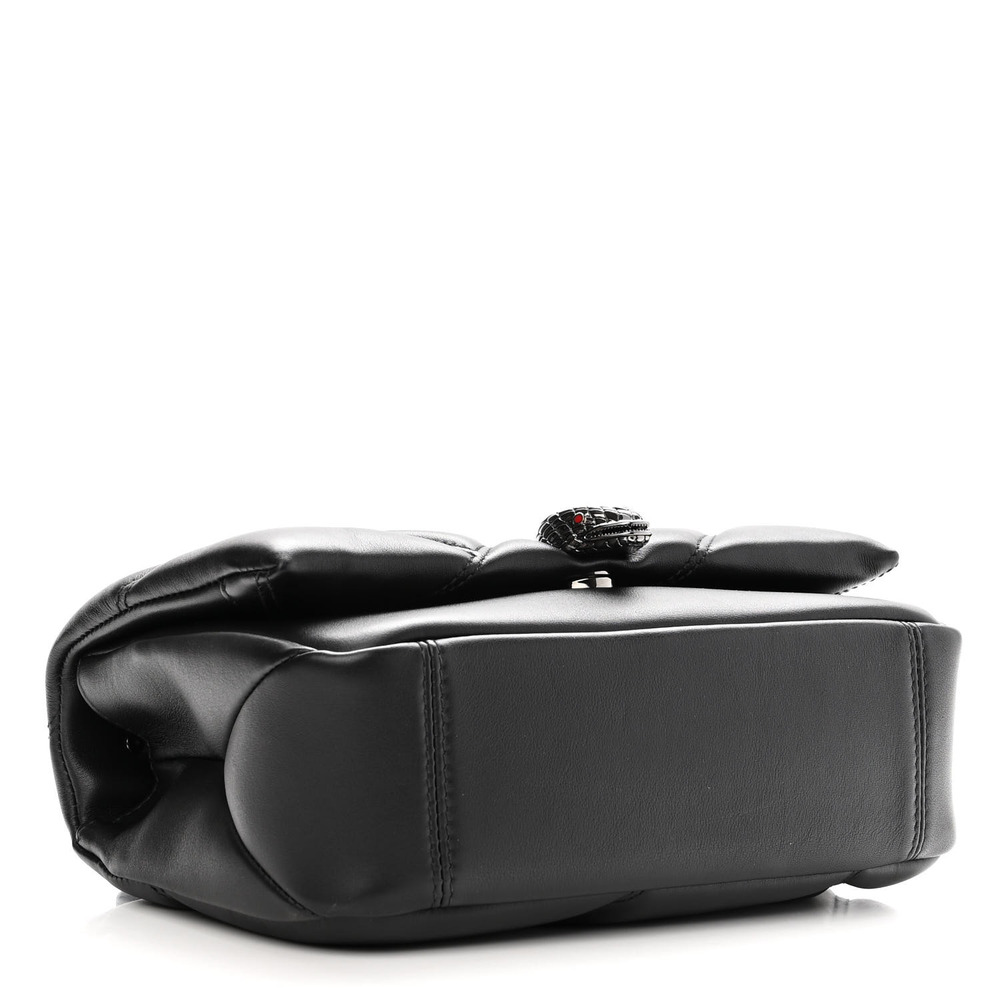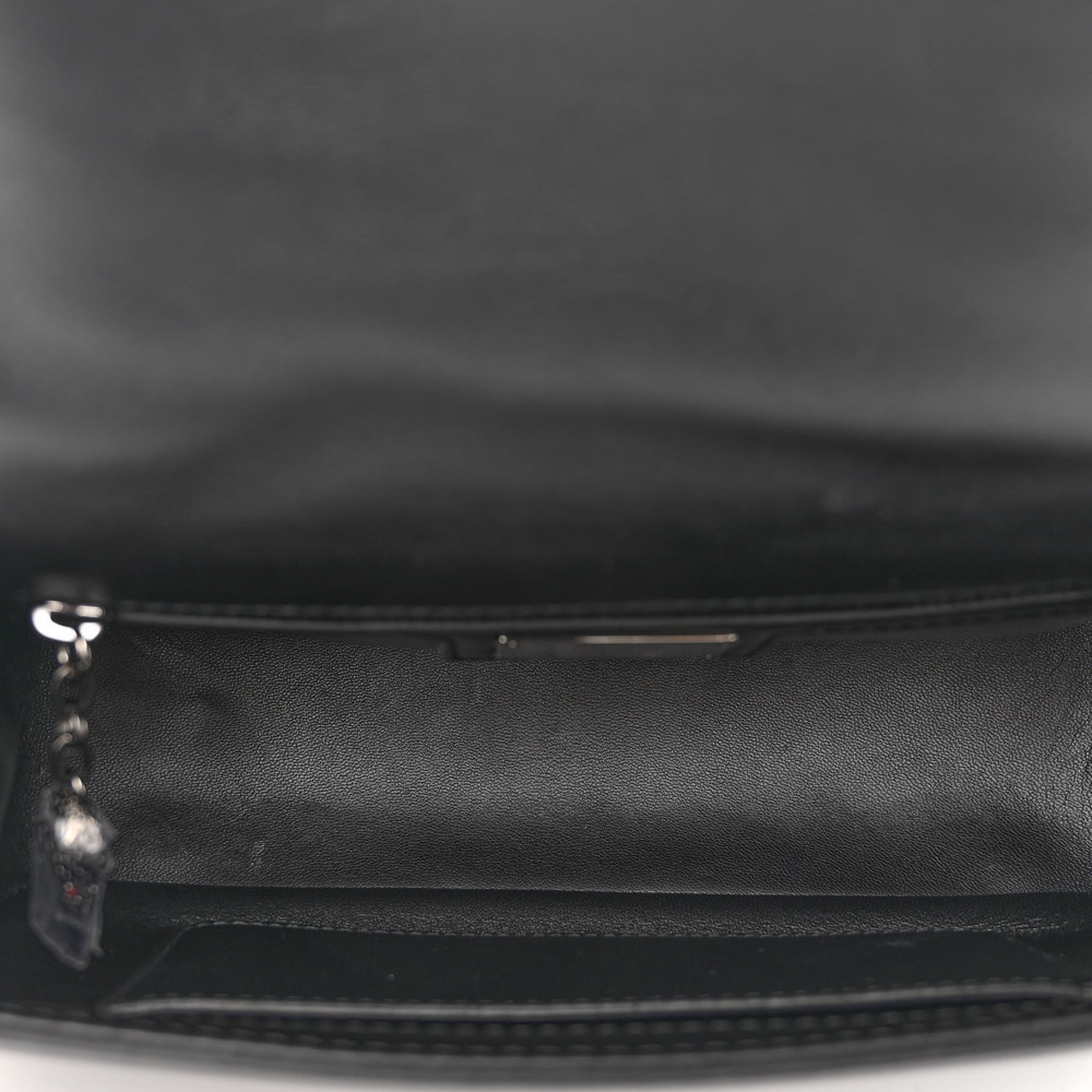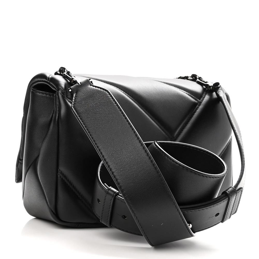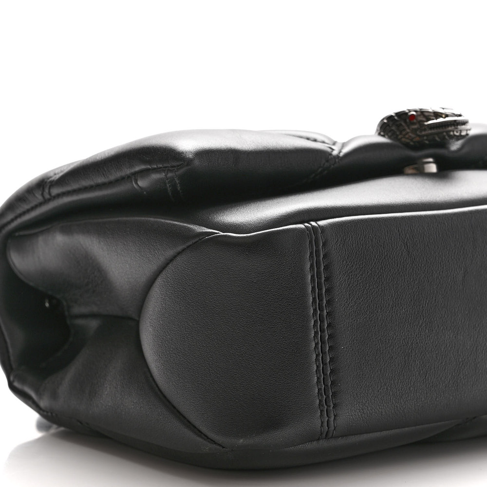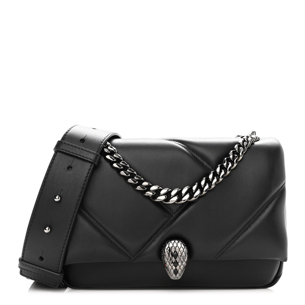Made of a captivating combination between a large graphic motif and bold metal details, this ?Serpenti Cabochon? crossbody bag is ready to enlarge the Serpenti universe with its sophisticated and functional design, featuring a contemporary style. The geometric maxi matelass?? pattern, inspired by the sinuous surface of cabochon-cut gemstones, enriches the extreme softness of the black calf leather of the bag’s core. The model is enhanced by a new ruthenium-plated version of the Serpenti head closure in dark brass, which takes inspiration from a Bvlgari heritage watch from the 1960s, with small black onyx scales in the middle and red enamel eyes. Recalling the jeweller DNA, an iconic Bvlgari chain adorns the flap like a collier, also suitable as a refined handle. Perfect to accessorise a sophisticated day-to-night look, the bag features an adjustable leather shoulder strap, also detachable for a versatile wearability as a top handle or a clutch. Small size with one gusset, a zipped internal pocket and an inner open pocket. Internal metal tag featuring the Bvlgari logo. 21.5 x 15 x 7 cm – 8.5 x 5.9 x 2.8 inches.