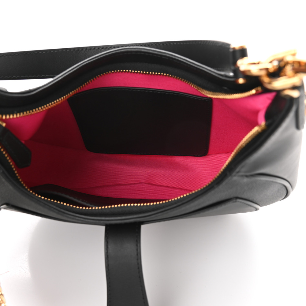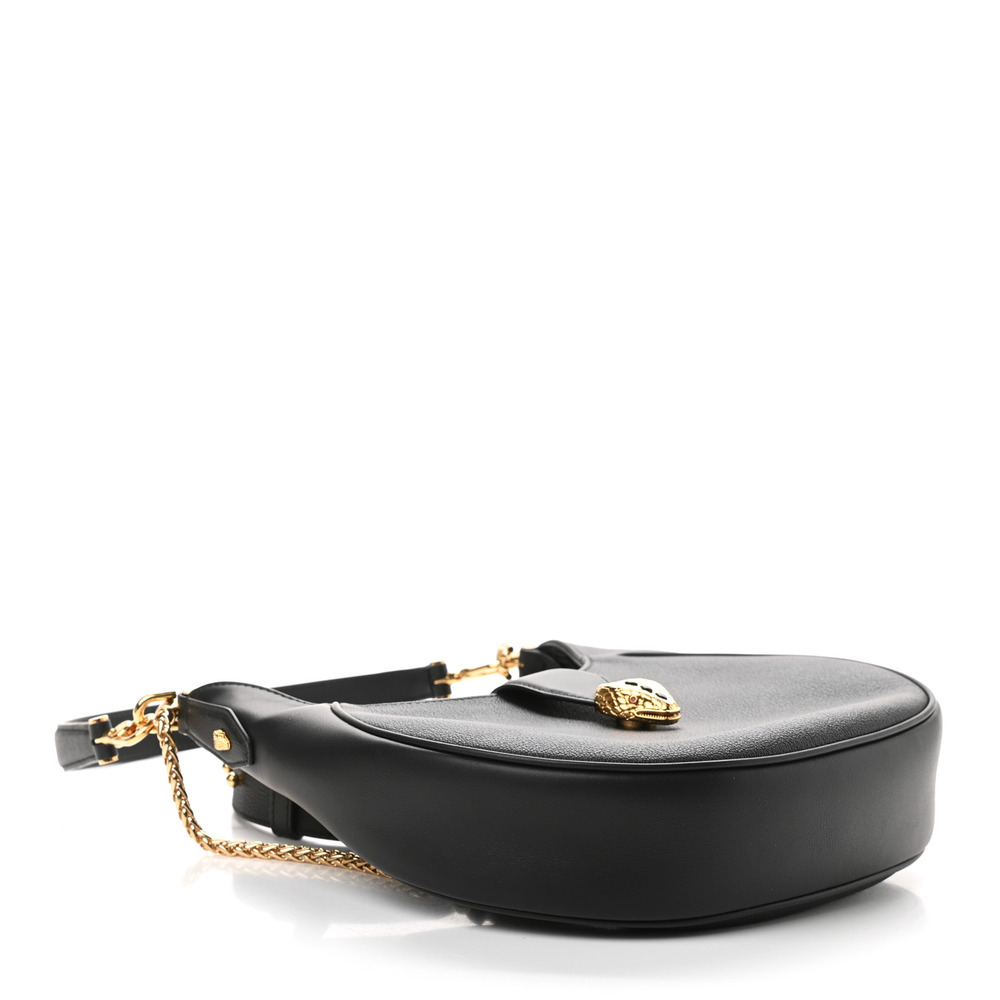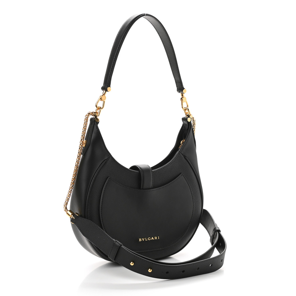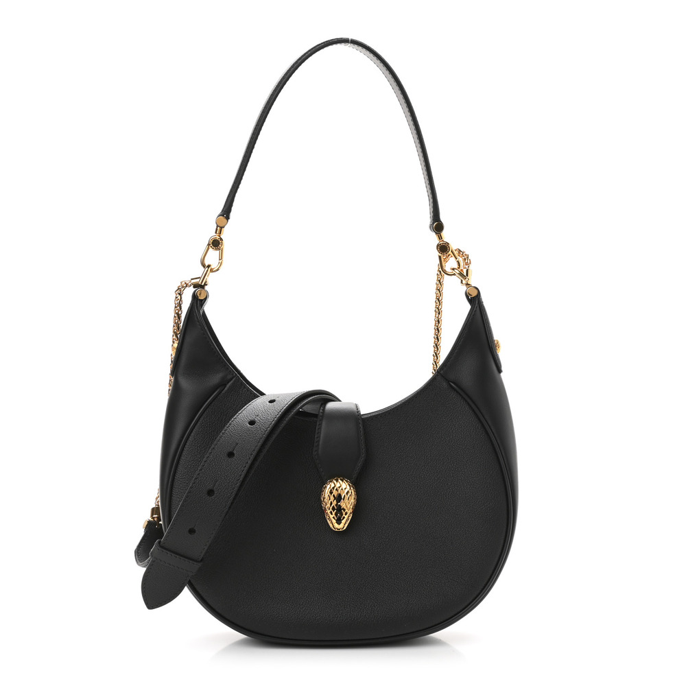 Enriching the Serpenti Forever universe with its on trend appeal, the new Serpenti Ellipse medium shoulder bag stands out for its distinctive shape, iconic details and versatile wearability. Crafted in black calf leather, Urban grain on the central body and smooth on the sides, with gold-plated brass hardware, the everyday bag flaunts a captivating heritage snakehead with black onyx scales in the middle and red enamel eyes hiding the frontal magnetic closure. Featuring a single compartment, an adjustable chain and leather strap along with a removable leather handle for crossbody wearability or the classic shoulder carry close to the body, the model is completed by a practical zipped top closure, three internal pockets, one external pocket and the BULGARI metal logo, both on the back. 25.5 x 25 x 5.5 cm – 10 x 9.8 x 2.2 inches. Made in Italy.