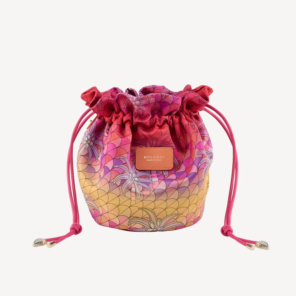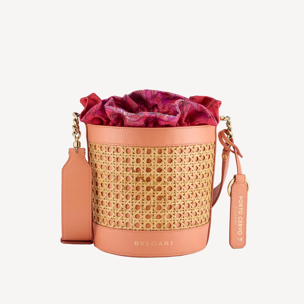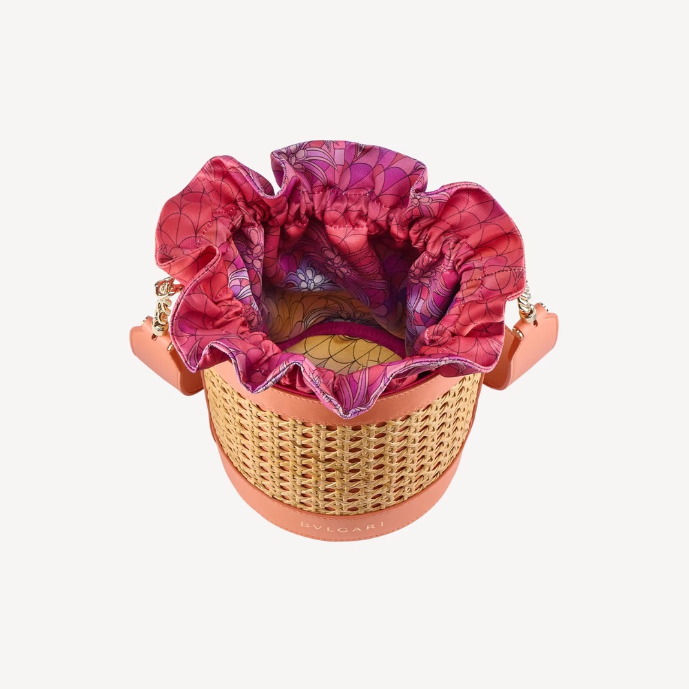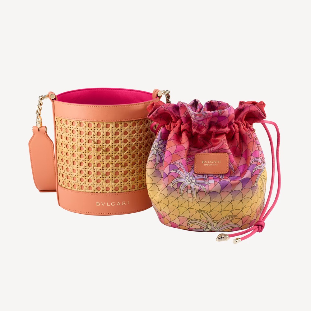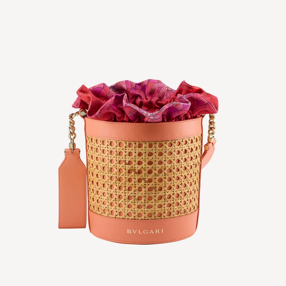 A Special Resort Edition exclusive to Saudi Arabia, the Serpenti Forever medium bucket bag in natural Vienna straw with coral carnelian orange calf leather details takes an on-trend and casual shape, imbued with the inspiring nuances and enveloping light of a sunset in Eden. The everyday bag is equipped with a detachable satin satchel, which can also be used as a separate pouch, featuring a multicoloured print outside, a monochromatic beetroot spinel fuchsia look inside and a fabric drawstring closure with two heritage snakeheads, drawing inspiration from a Bulgari watch from the 1960s. The model is completed by a leather strap with chain, a customisable coral carnelian orange calf leather tag with hot stamped Bulgari logo and “Saudi” inscription on one side, and the BULGARI logo hot stamped on the front. 18 x 17 x 18 cm – 7.1 x 6.7 x 7.1 inches. Made in Italy.