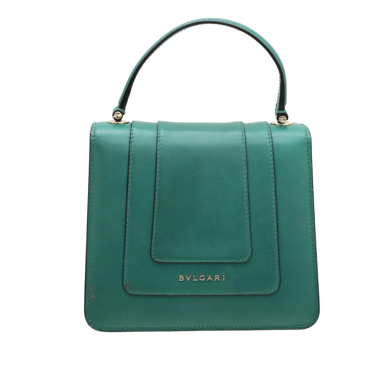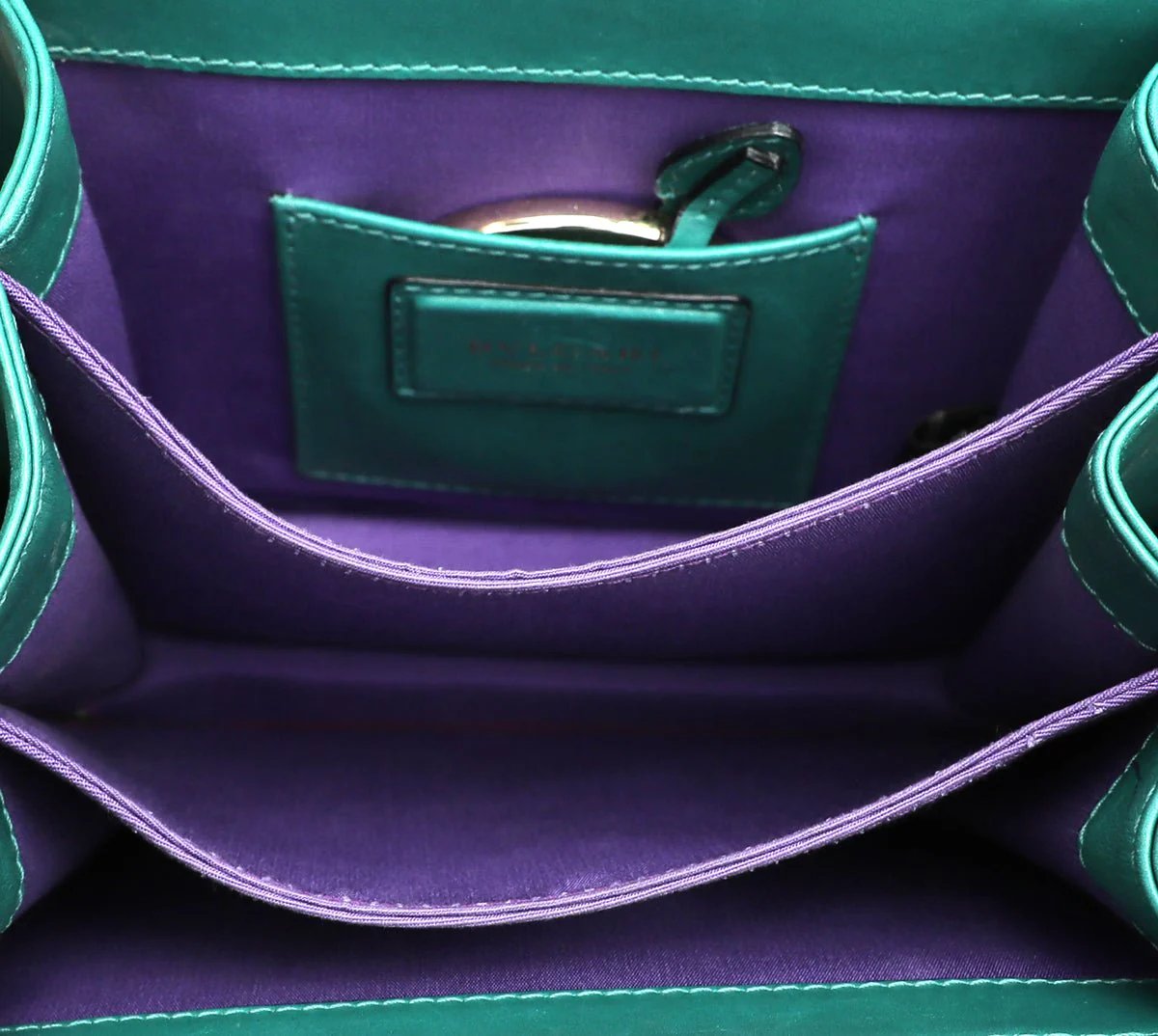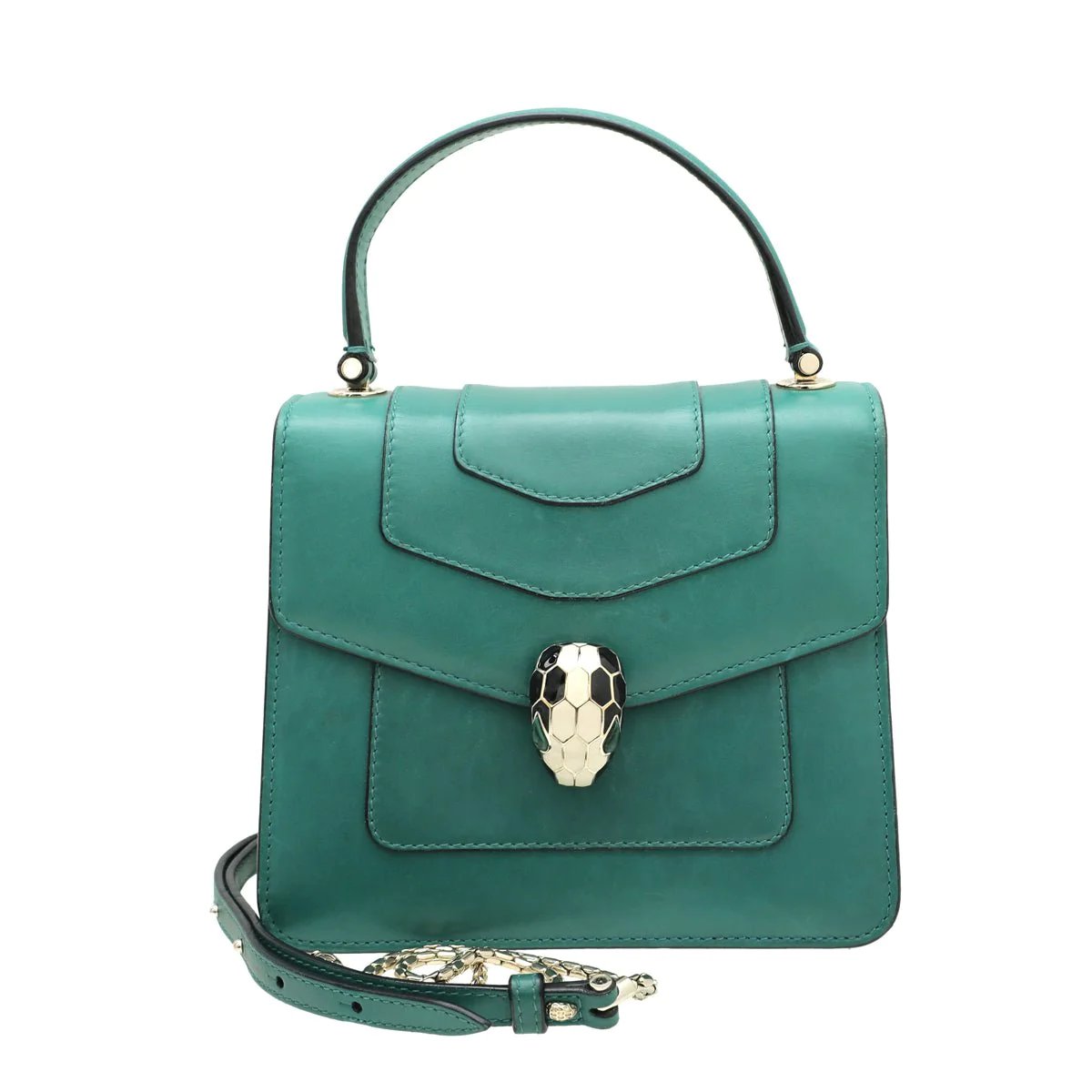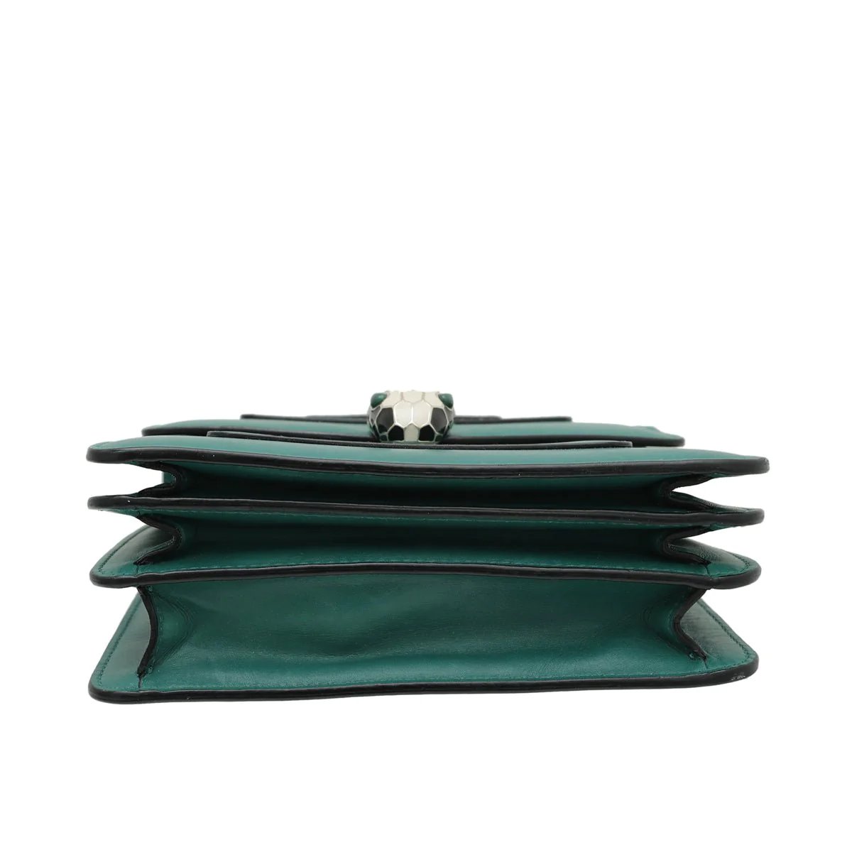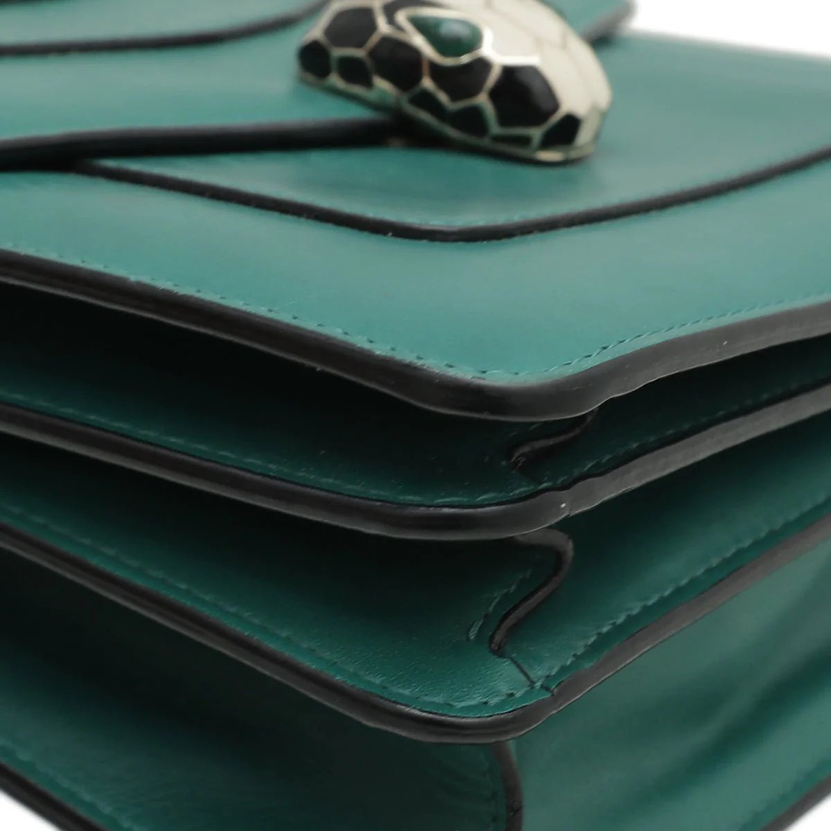 The ?Serpenti Forever? universe welcomes a new creation to reinforce the Serpenti statement and complement the collection. Crafted in emerald green calf leather, this model features light gold-plated brass hardware. The iconic snakehead closure hypnotizes with black and white agate enamel and seductive eyes in green malachite. Top handle model with an open pocket on the back, three gussets and a sinuous removable and adjustable snake body-shaped chain with a leather strap for versatile wearability. Medium size with a zipped pocket and a small pocket mirror. 22.5 x 17.5 x 11 cm – 8.9 x 6.9 x 4.3 inches.