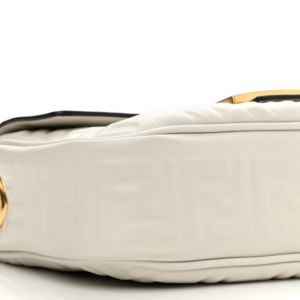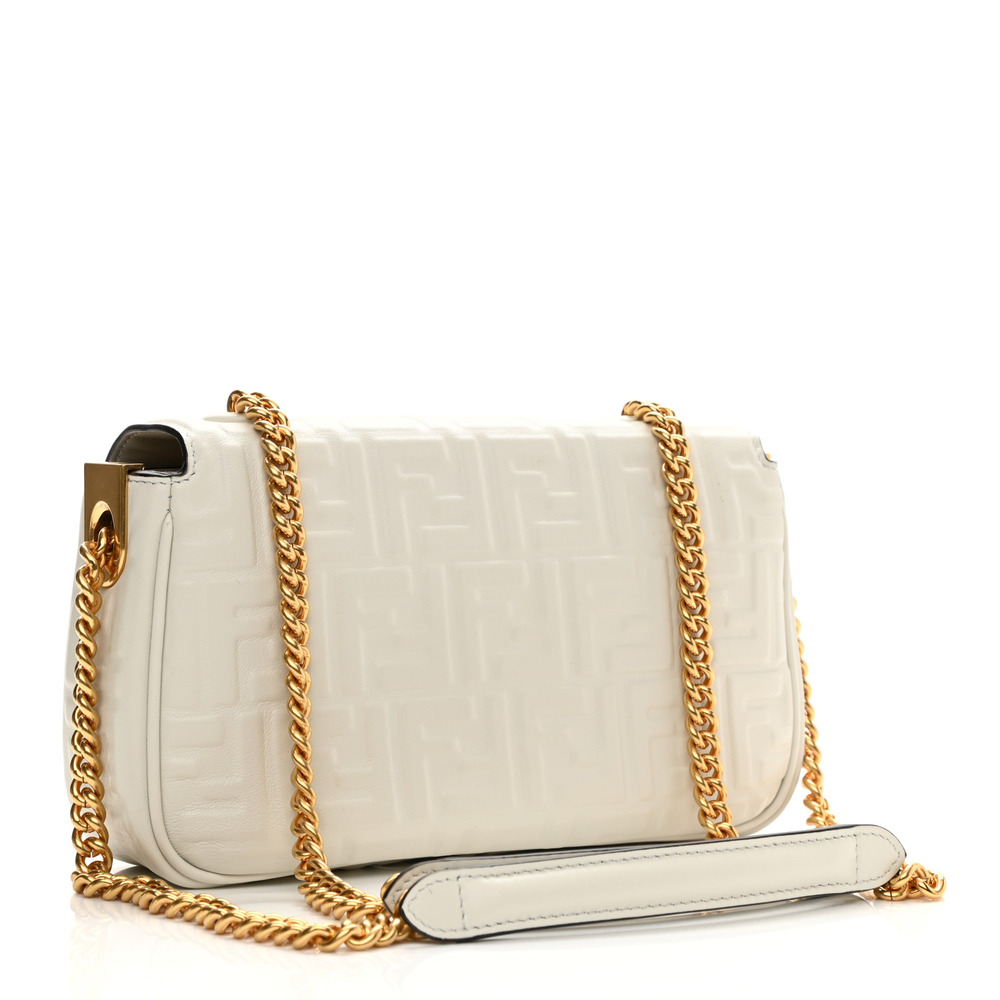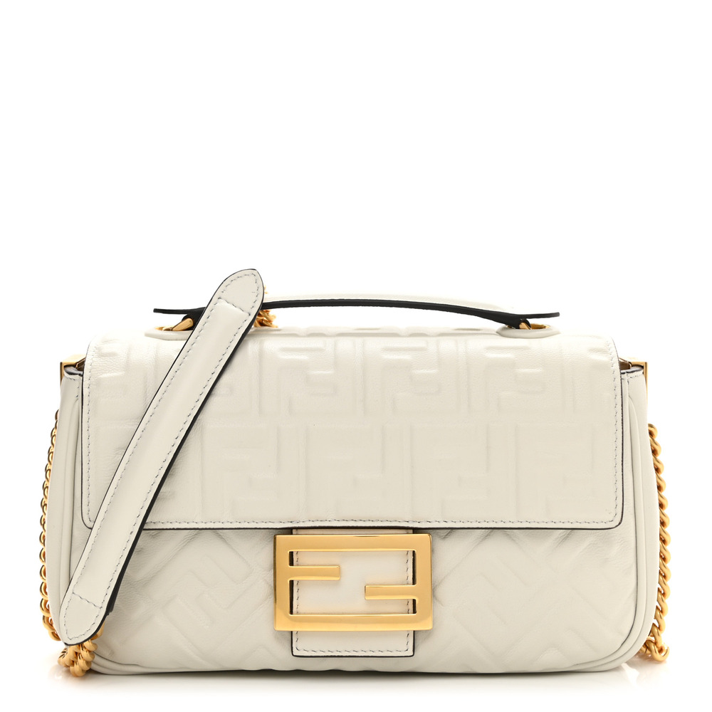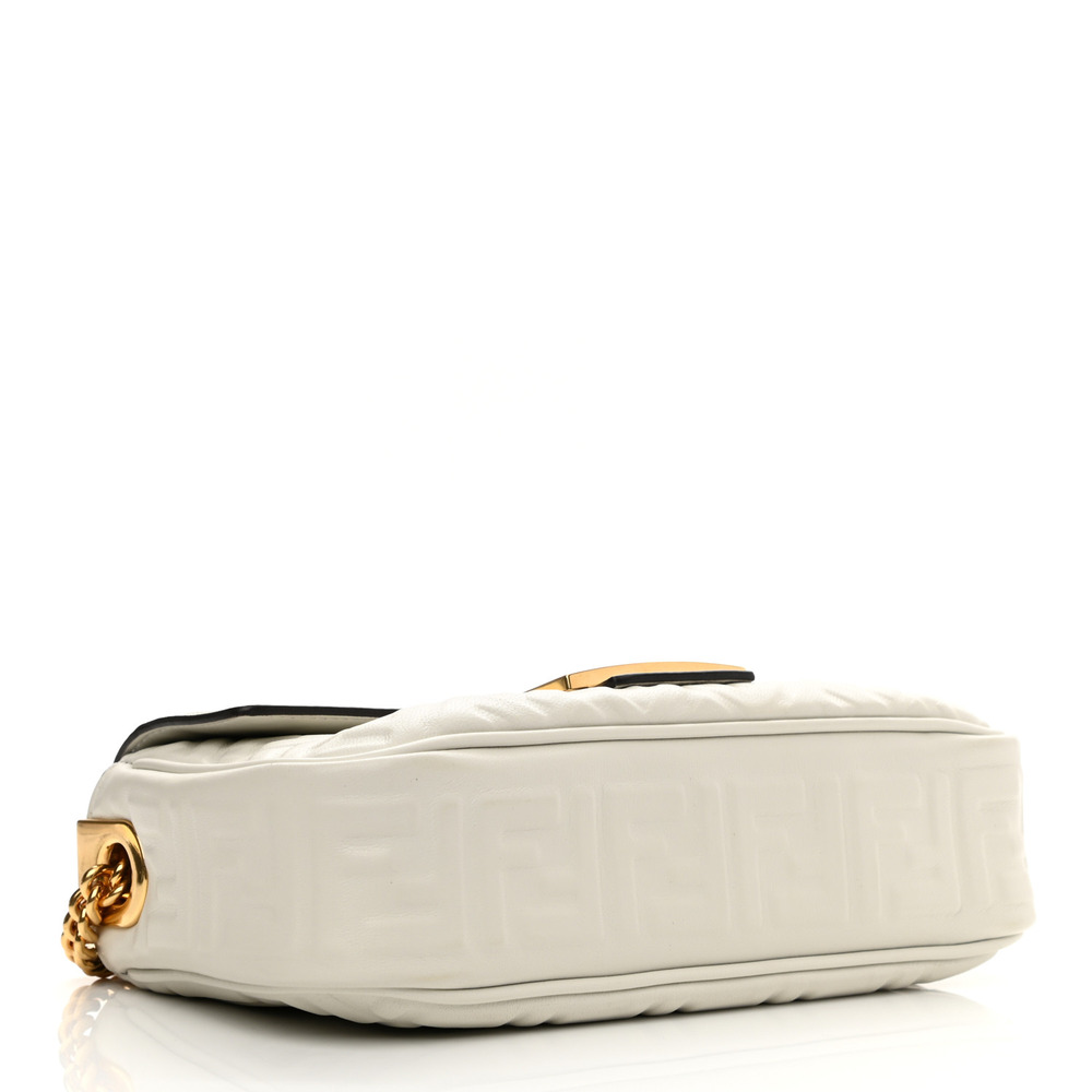 Iconic medium Baguette bag with chain, made of soft, white nappa leather with a 3D texture FF motif. Decorated with an FF clasp.Featuring a front flap, magnetic clasp, lined internal compartment with zipper pocket and vintage gold-finish metalware.Can be carried by hand or over the shoulder thanks to the sliding-chain shoulder strap.