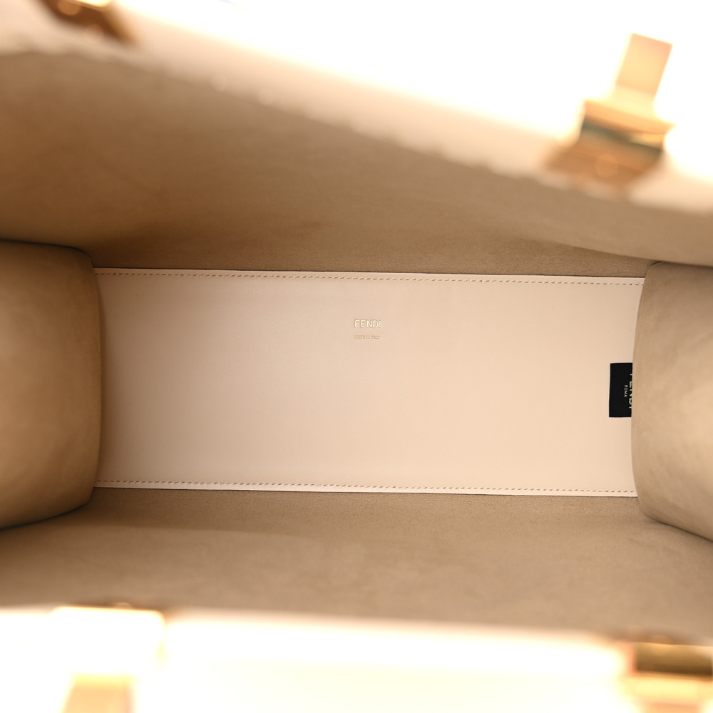 The Fendi Sunshine medium tote bag comes in an eye-catching version in FF coated fabric with a colorful intarsia design on front from fashion illustrator Antonio Lopez and macro “Fendi Roma” logo in white leather. Elegant and unmistakable, it features two rigid tortoiseshell effect plexiglass handles, white leather detachable shoulder strap and edges and gold-tone metal hardware.