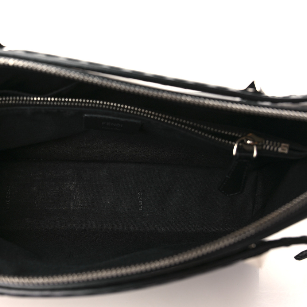 This chic satchel is finely crafted of grained calfskin leather in off white. The shoulder bag features leather strap top handles with large pointed cone polished silver studs and a cross-body shoulder strap with adjustable silver clasps. There is an over-extending top zipper to a partitioned dark brown fabric interior with a patch pocket and zipper compartment.