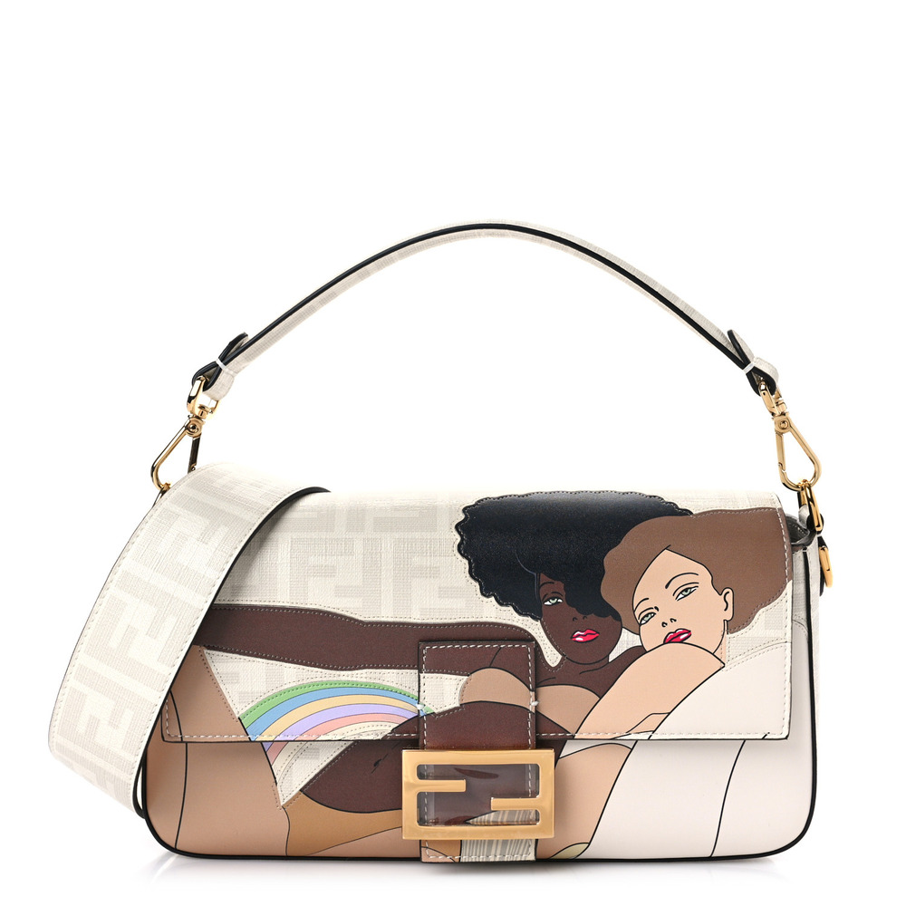 The Bikini Girls graphics are a tribute to the visionary sensitivity of the fashion illustrator Antonio Lopez: recalling the atmospheres of the disco era and an expression of the free and universal femininity that distinguishes the Fendi spirit.Featuring a front flap, magnetic clasp, internal fabric-lined compartment with a zip pocket, vintage gold-finish metalware.Can be carried by hand or worn on the shoulder or cross-body thanks to the handle and shoulder strap, both of which are detachable.