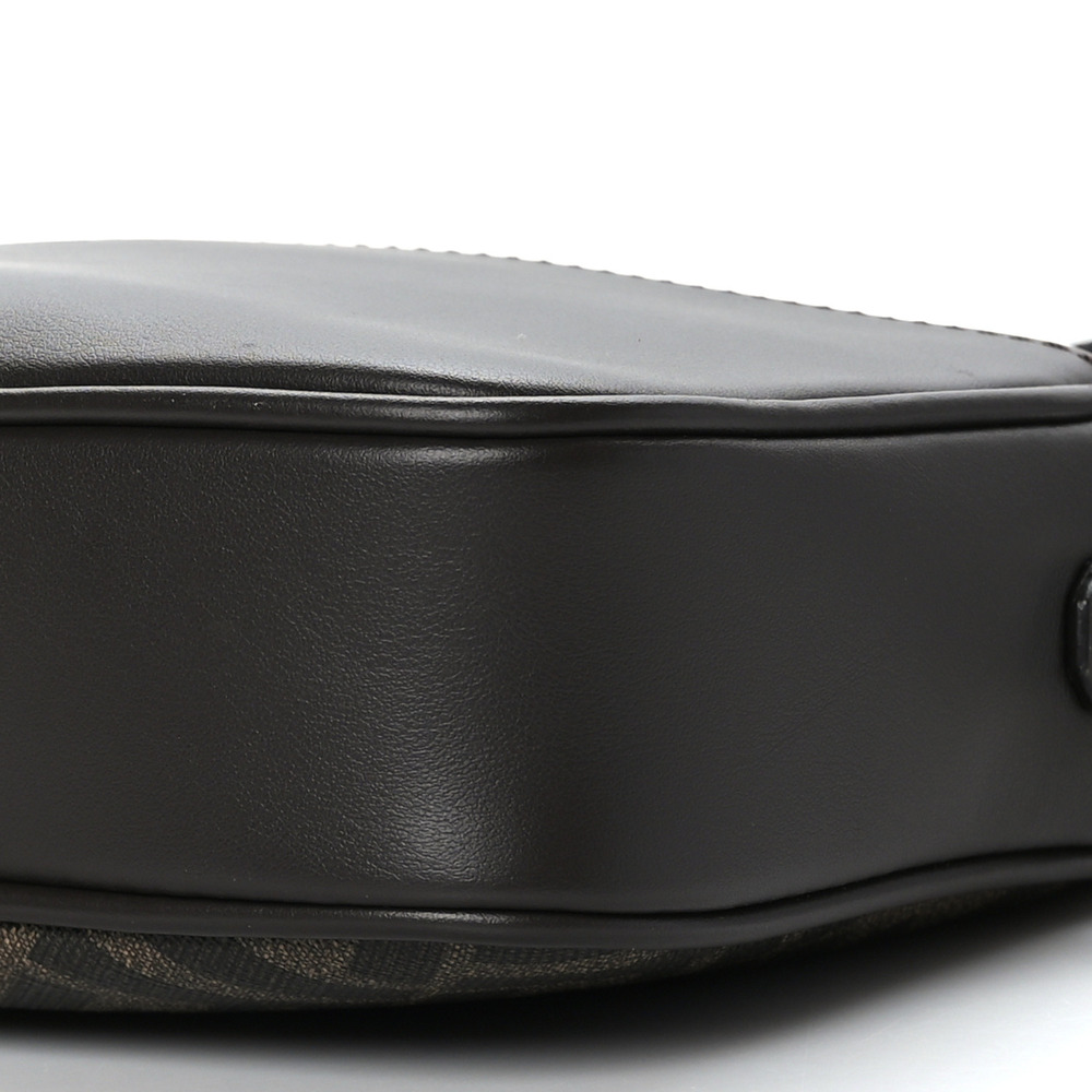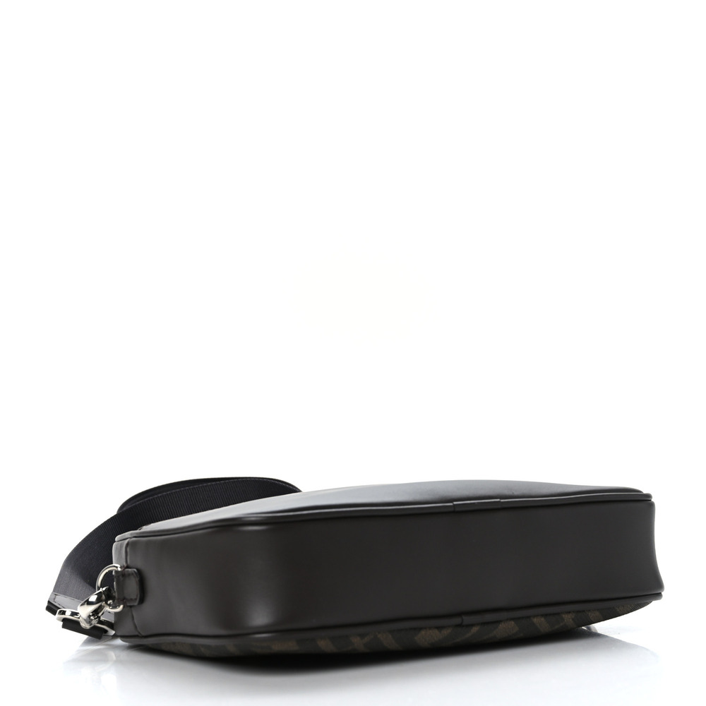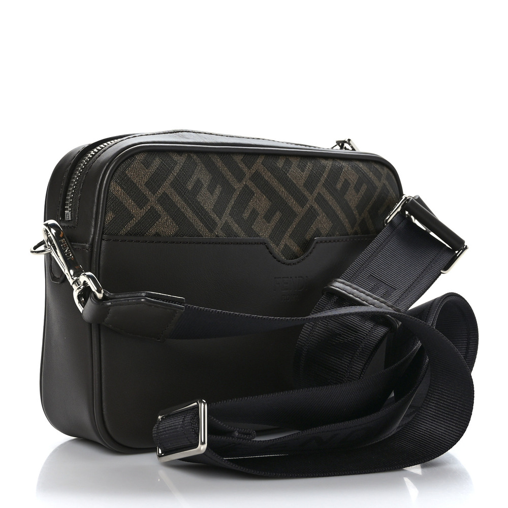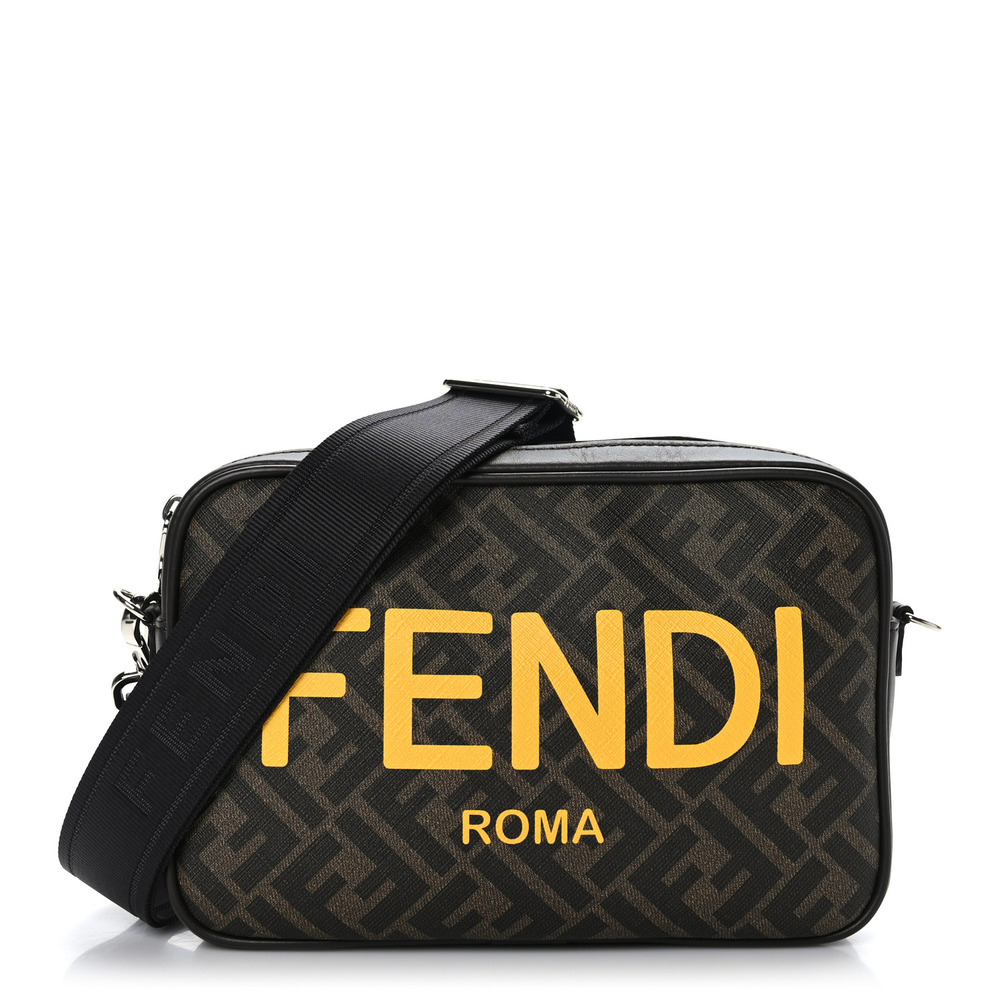 Compact shoulder bag with zip closure. The tech fabric cross-body shoulder strap with “FENDI” branding is adjustable and detachable. Made of textured fabric with a brown FF motif and yellow FENDI ROMA print. Embellished with details in brown leather. Interior organized with a flat pocket. Palladium-finish metalware.