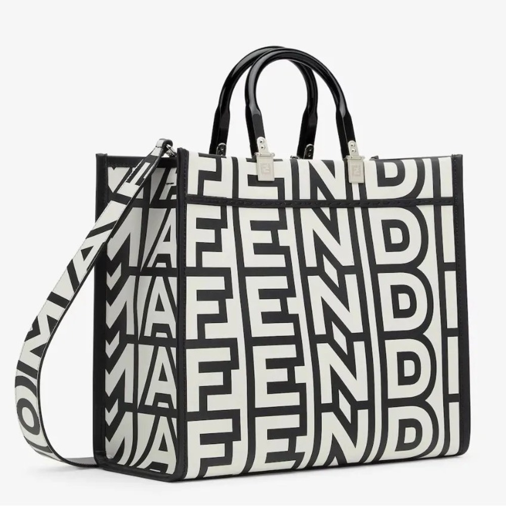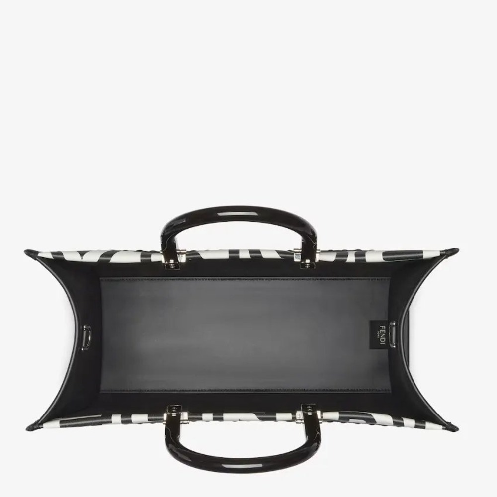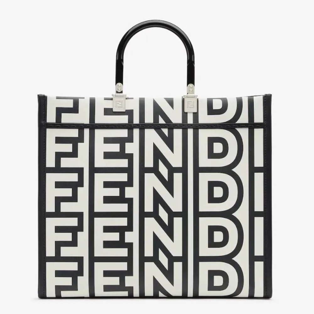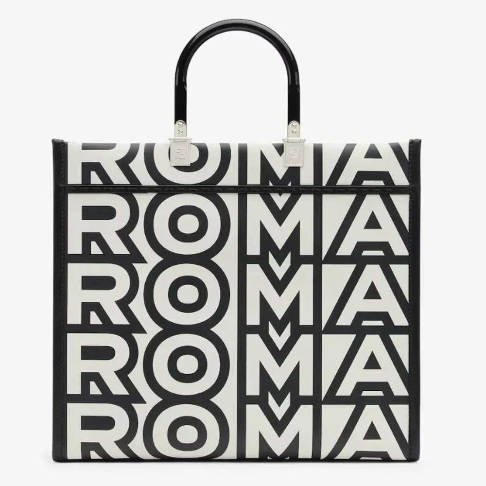 Part of the Fendi by Marc Jacobs limited edition, this style is made of leather with a macro version of the Fendi Roma logo printed all over in black and white. Stiff plexiglass handles.Features a spacious lined internal compartment, edges in tone on tone leather, and palladium-finish metalware.Can be carried by hand or worn on the shoulder thanks to the two handles and detachable shoulder strap.