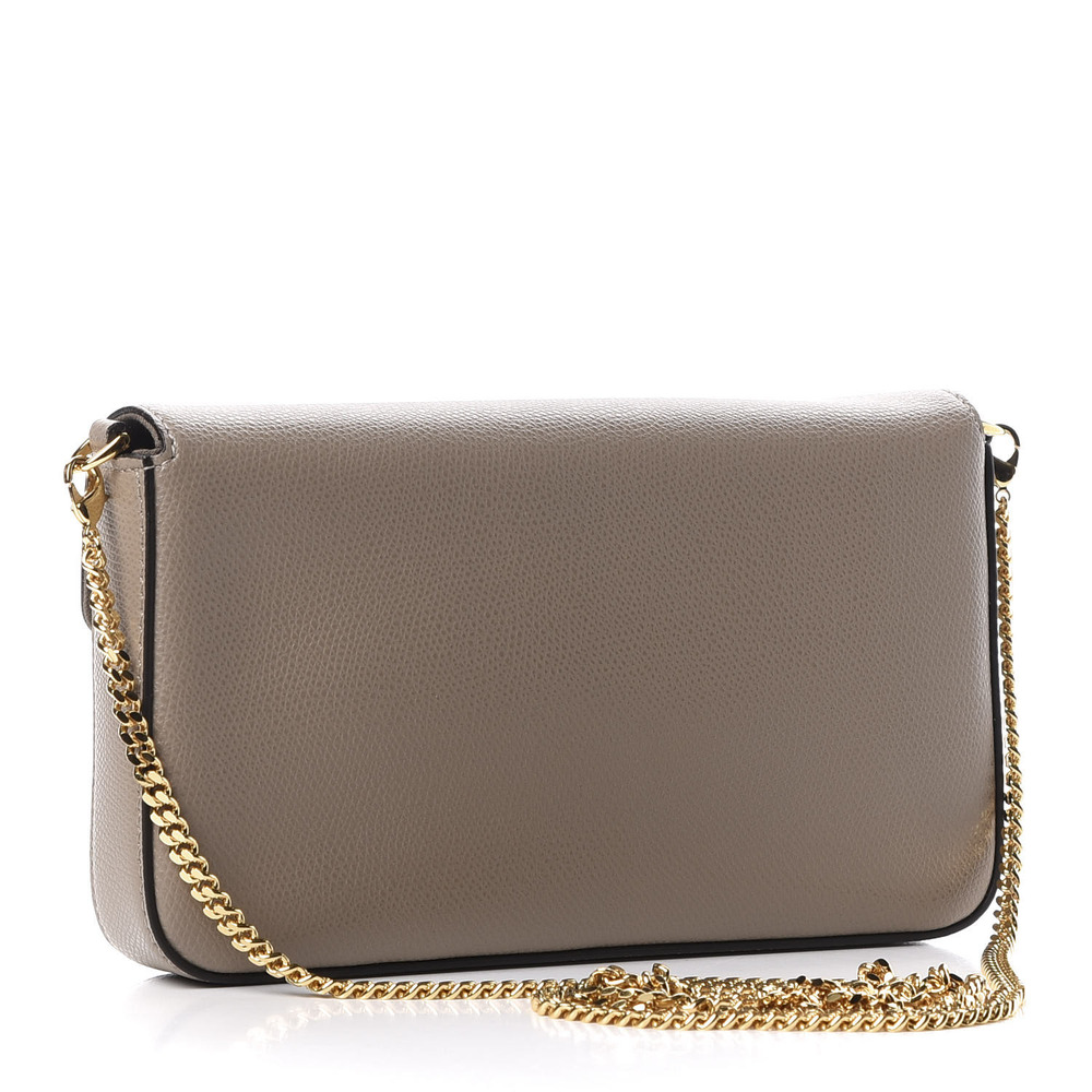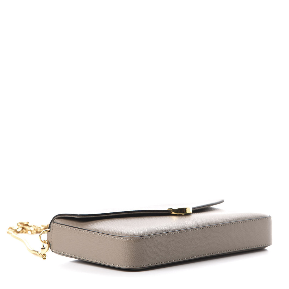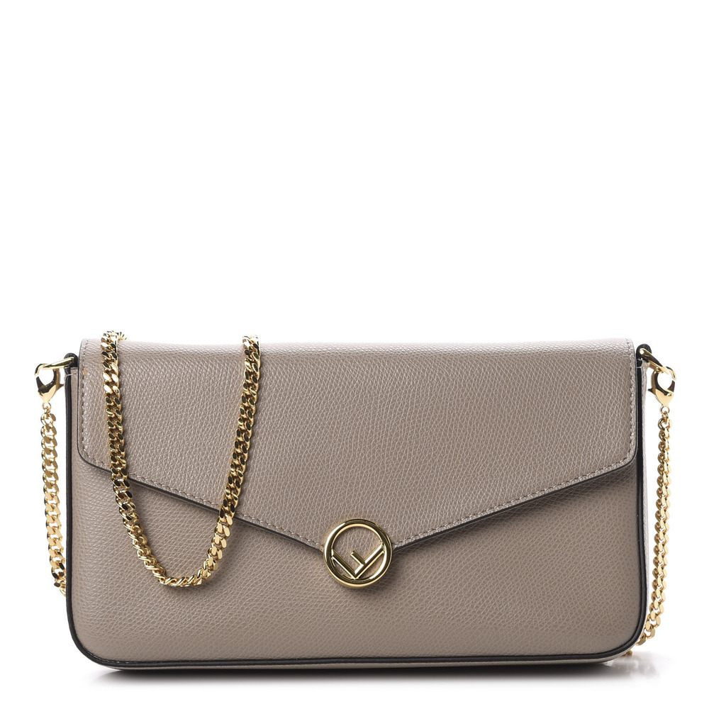 This chic wallet on a chain bag is crafted of smooth tortora patent leather. The bag features a removable waist-length gold chain shoulder strap and a facing flap with a matching F is Fendi logo. This opens to a black fabric interior with a patch pocket and two removable inserts. This is a unique look for day or evening wear only from Fendi!