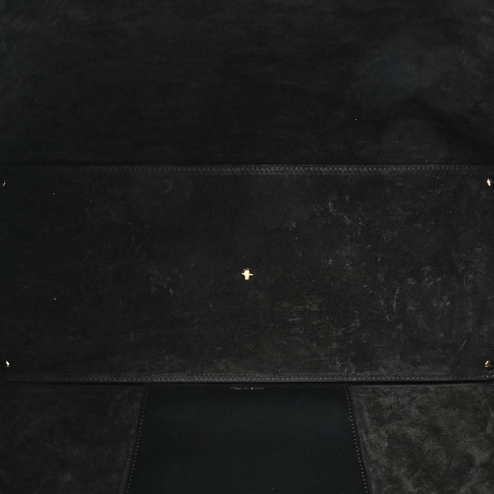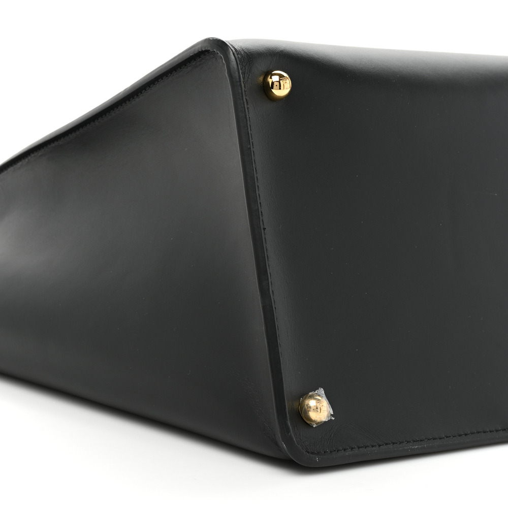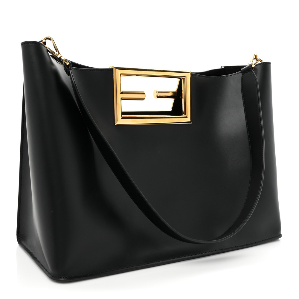 This stylish shopping tote is crafted in smooth black leather with five gold tone feet at the base, an optional leather shoulder strap, gold tone hardware and a bold magnetic closure Fendi logo handle. The top opens to a spacious suede black interior with a patch pocket.