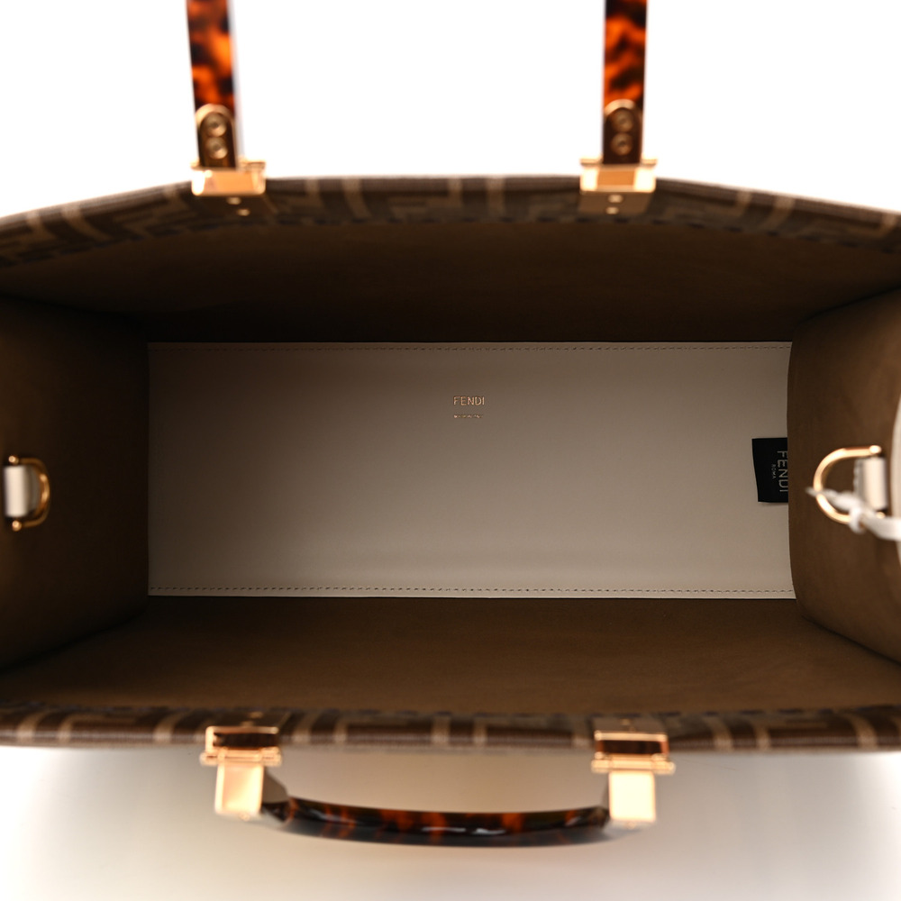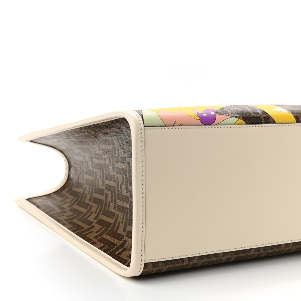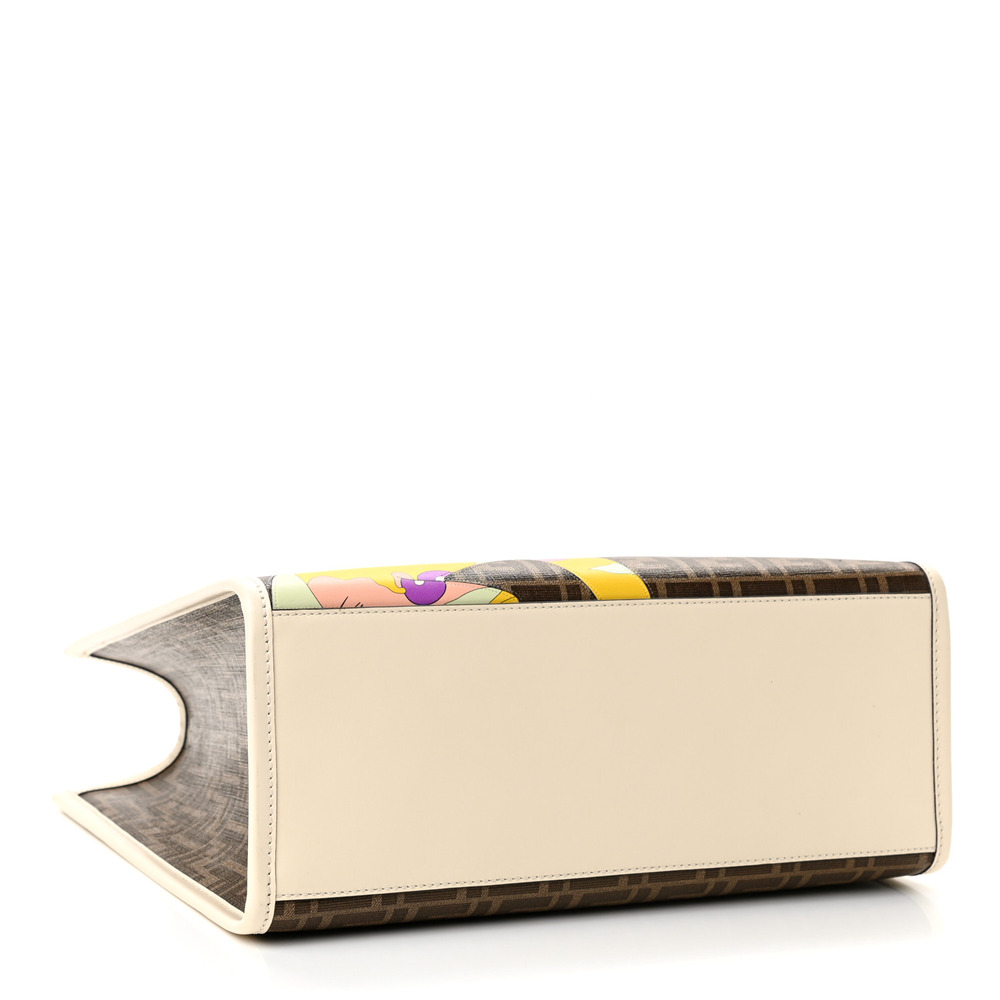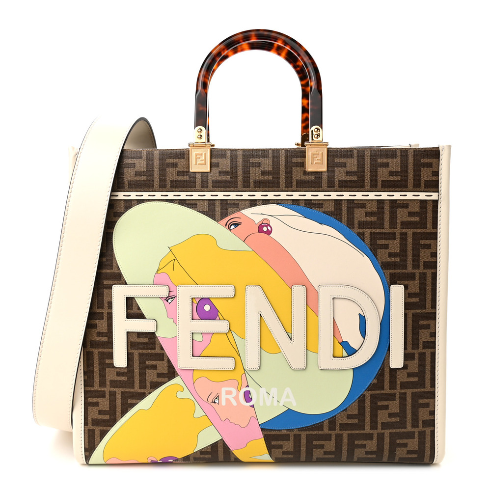 The Fendi Sunshine medium tote bag comes in an eye-catching version in FF coated fabric with a colorful intarsia design on front from fashion illustrator Antonio Lopez and macro “Fendi Roma” logo in white leather. Elegant and unmistakable, it features two rigid tortoiseshell effect plexiglass handles, white leather detachable shoulder strap and edges and gold-tone metal hardware.