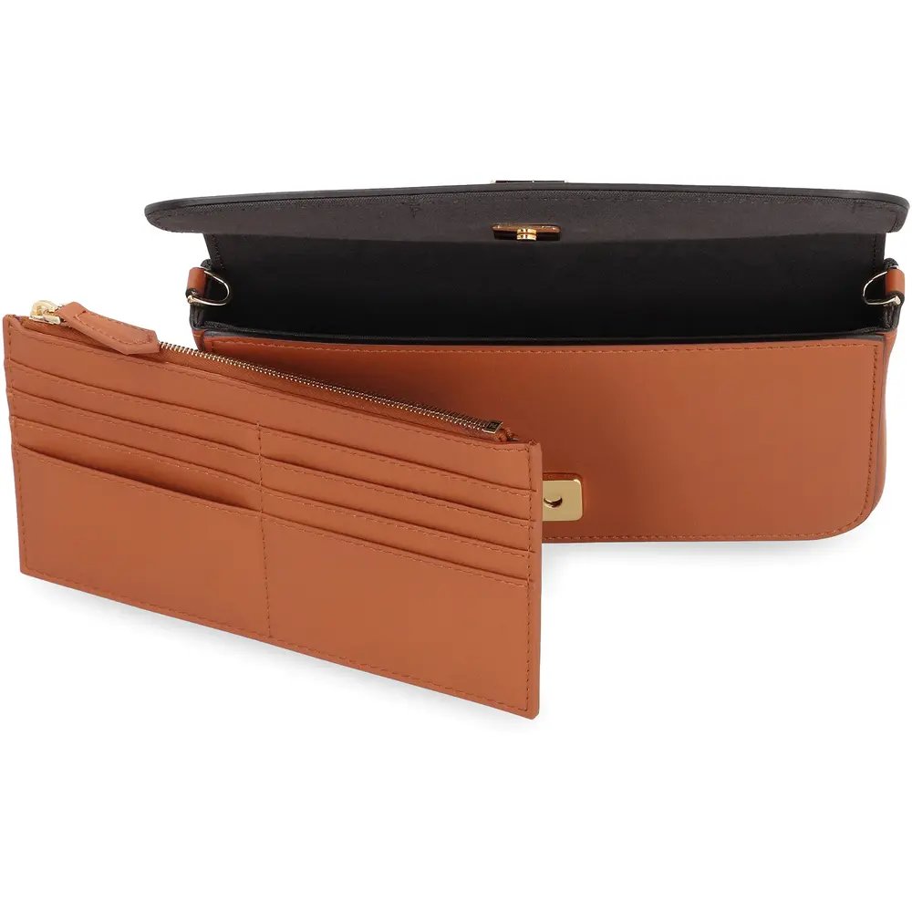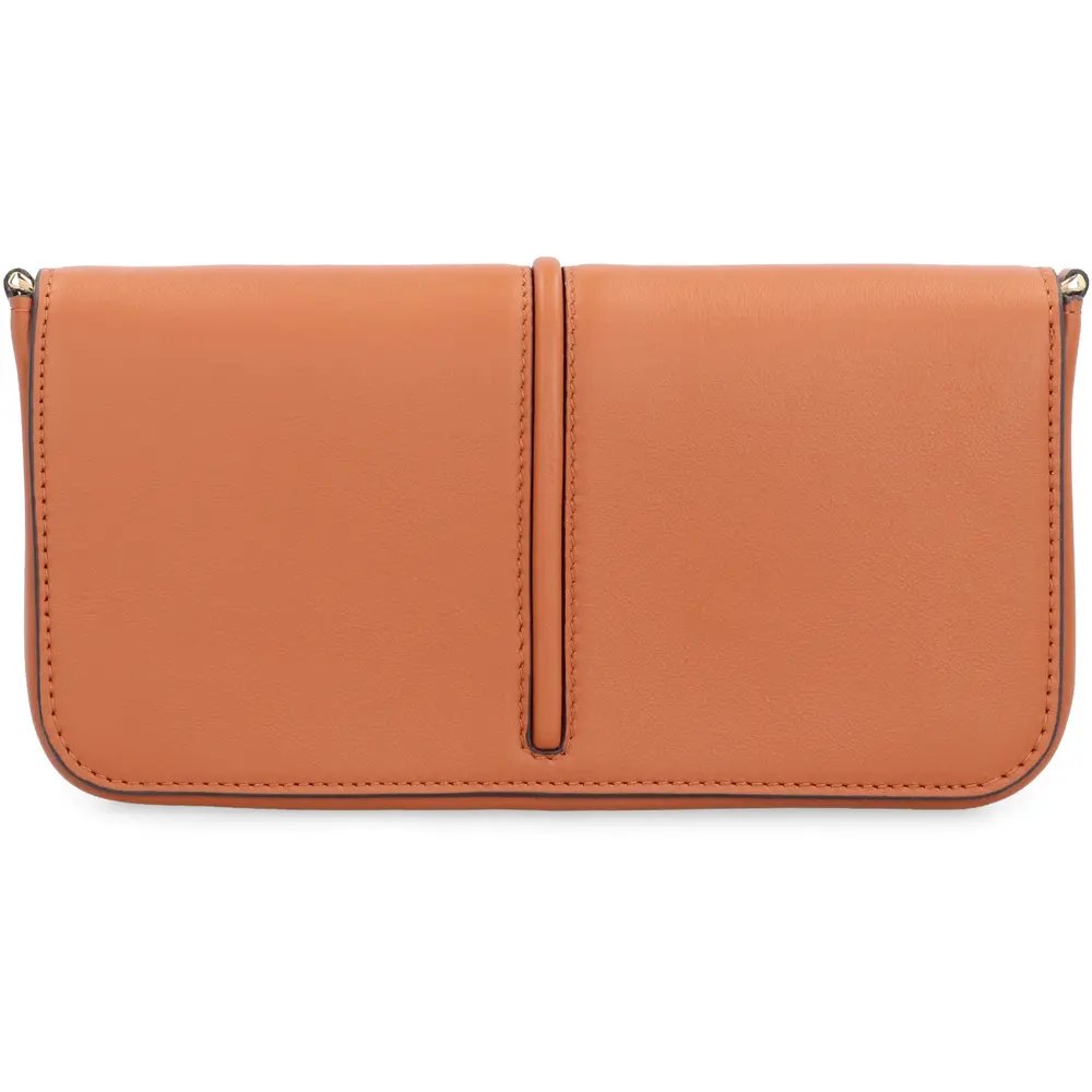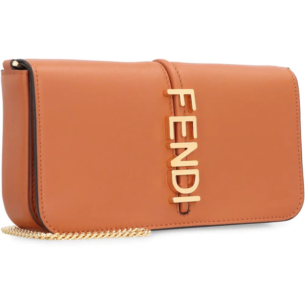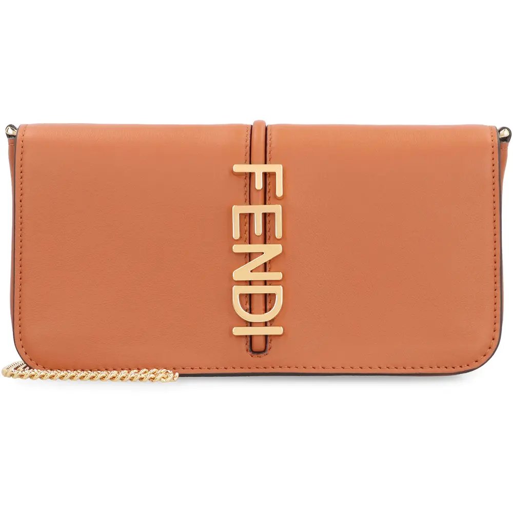 Compact Fendigraphy wallet with flap and metal Fendi lettering. Featuring an internal, removable pouch with eight card slots and zipper pocket. Fine chain shoulder strap, detachable. Made of white leather. Gold-finish metalware.