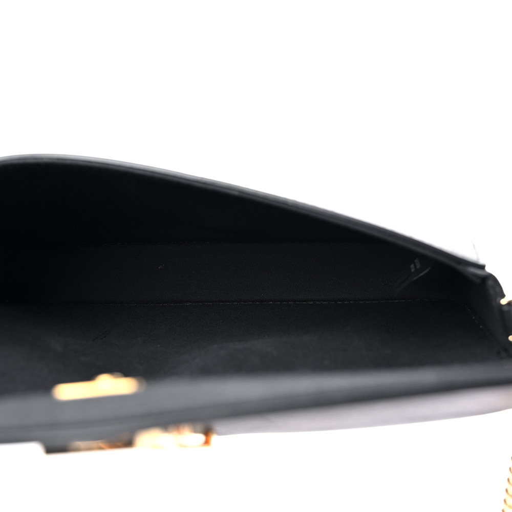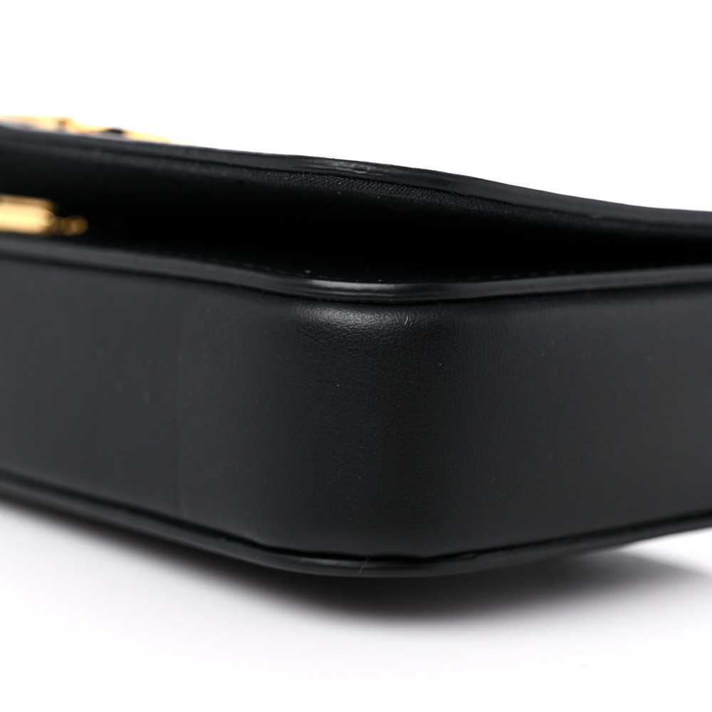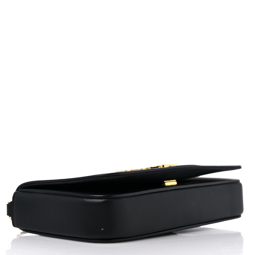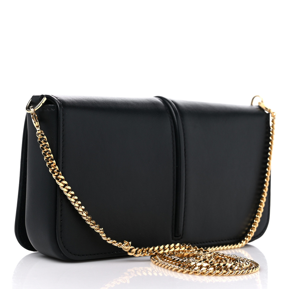 Compact Fendigraphy wallet with flap and metal Fendi lettering. Featuring an internal, removable pouch with eight card slots and zipper pocket. Fine chain shoulder strap, detachable. Made of white leather. Gold-finish metalware.