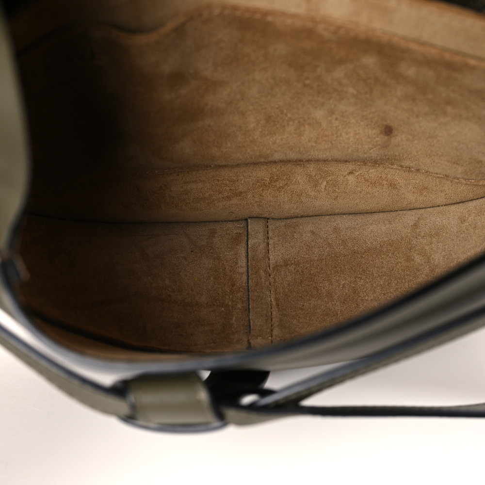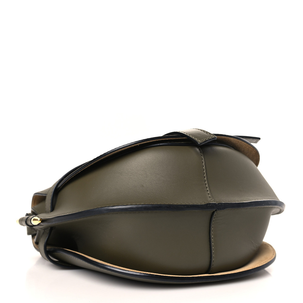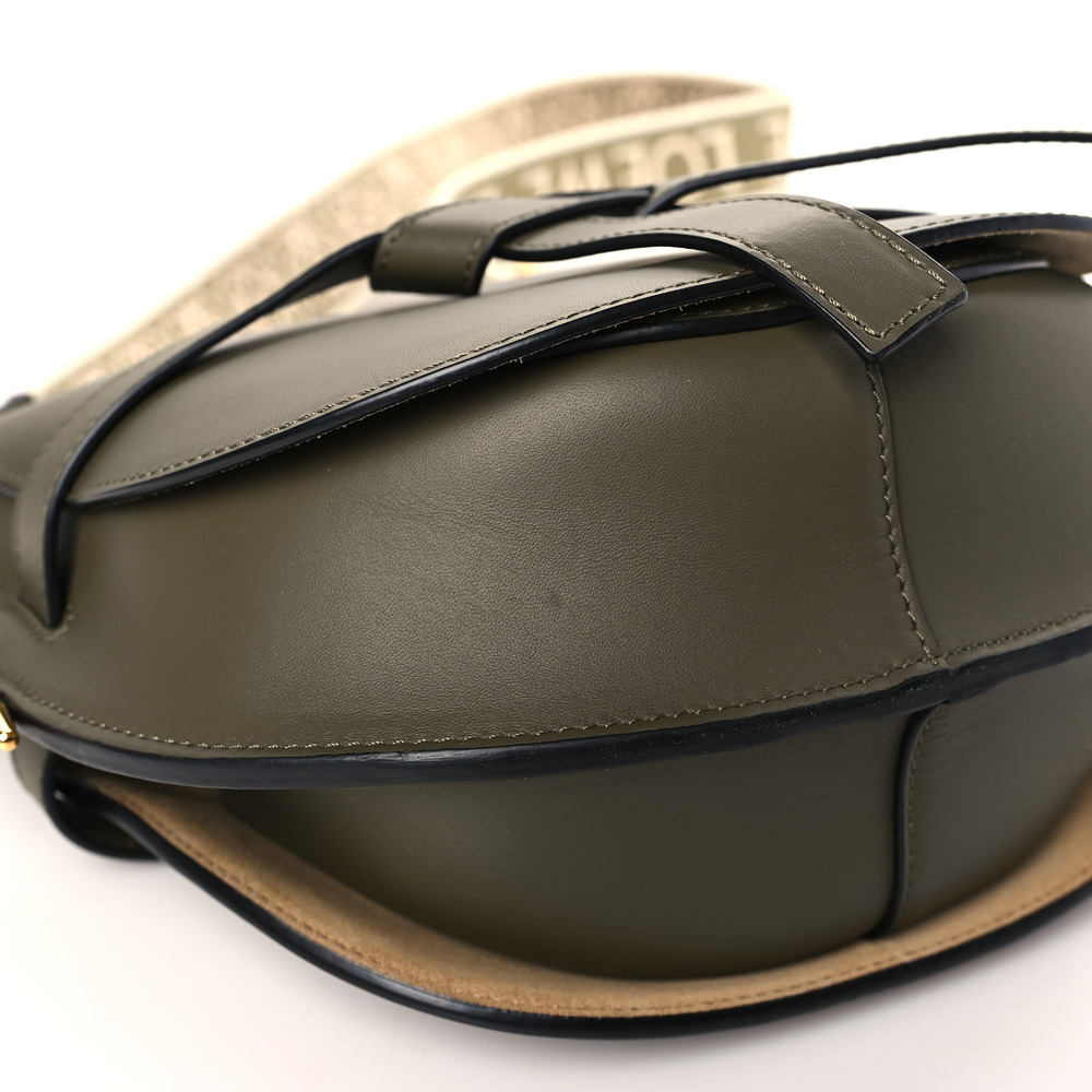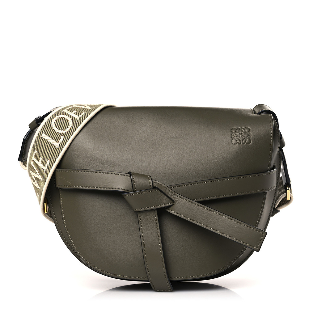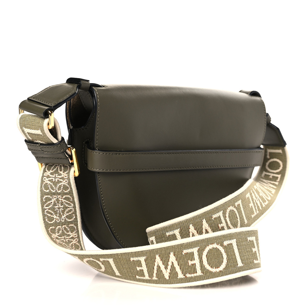 The Gate displays LOEWE’s unrivalled leather craftsmanship with a saddle-stitched knotted leather strap and a side-latched metal pin that gives the bag its name. This small version is crafted in bicolour soft calfskin with a LOEWE jacquard strap.