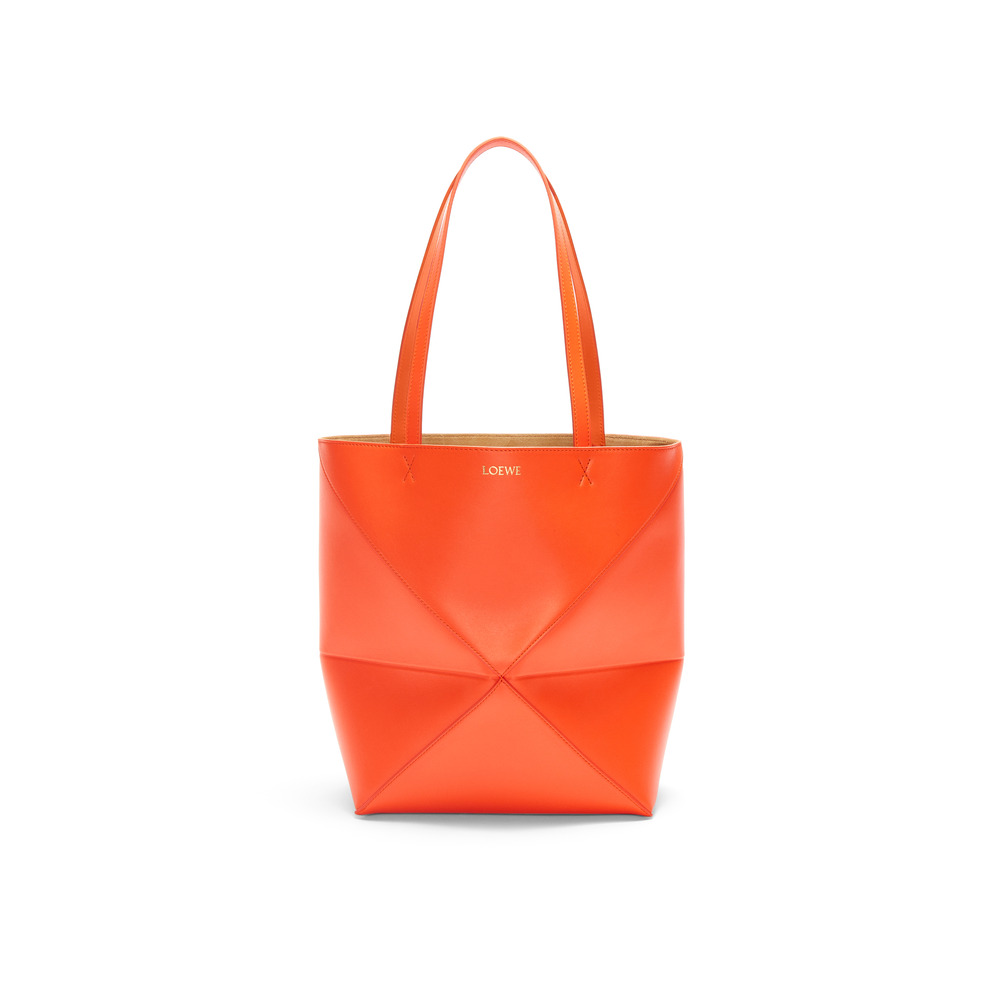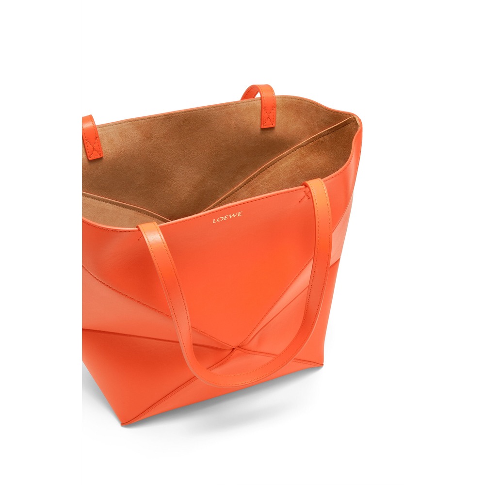 The Puzzle Fold Tote takes the iconic bag?s signature geometric lines and reimagines them in graphic and architectural panels that allow the bag to fold completely flat, making it the perfect travel companion. Soft, lightweight and inventively crafted, it is finished with discreet LOEWE branding. This large bicolour version is crafted in shiny calfskin.