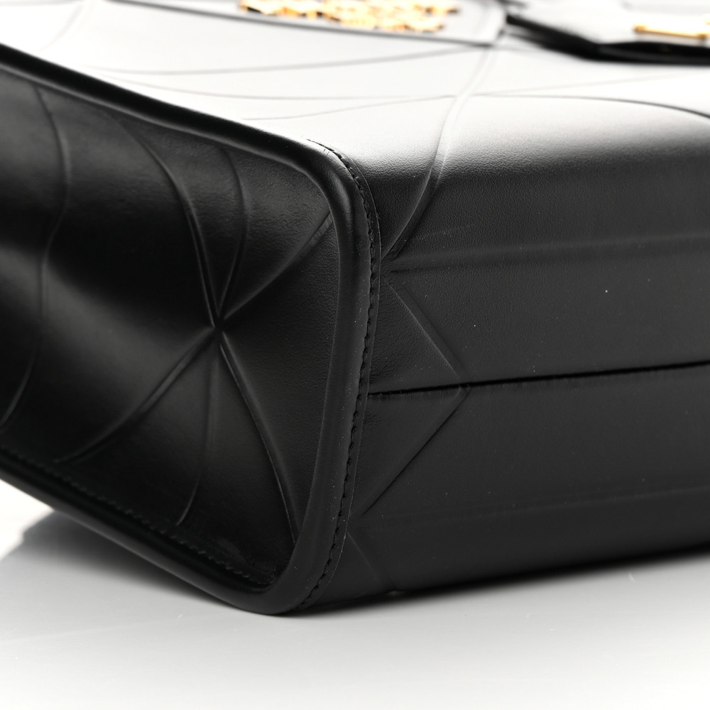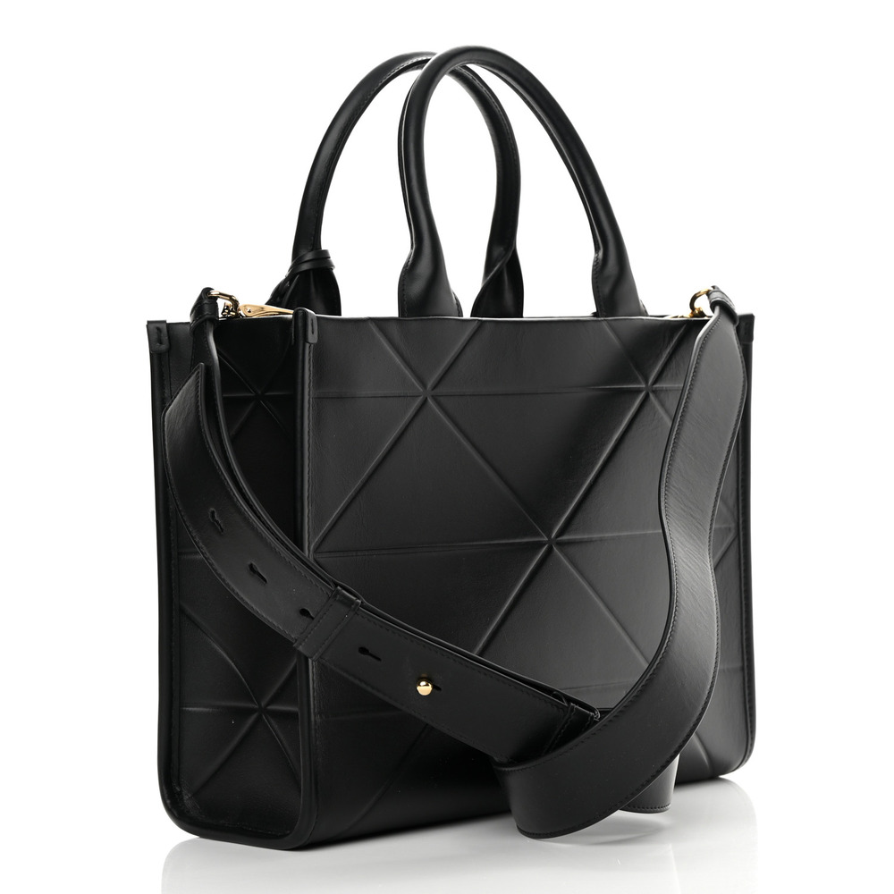 This elegant, minimalist leather handbag has two handles and a leather keychain inside. Steeped in a contemporary allure, this accessory features a motif that evokes the brand?s iconic geometric shape. Signature metal logo lettering stands out on the front.