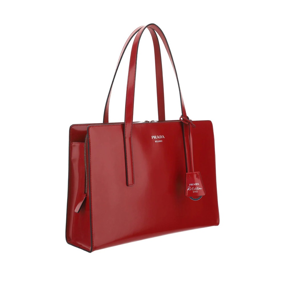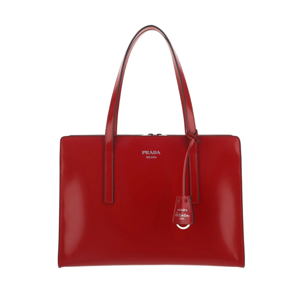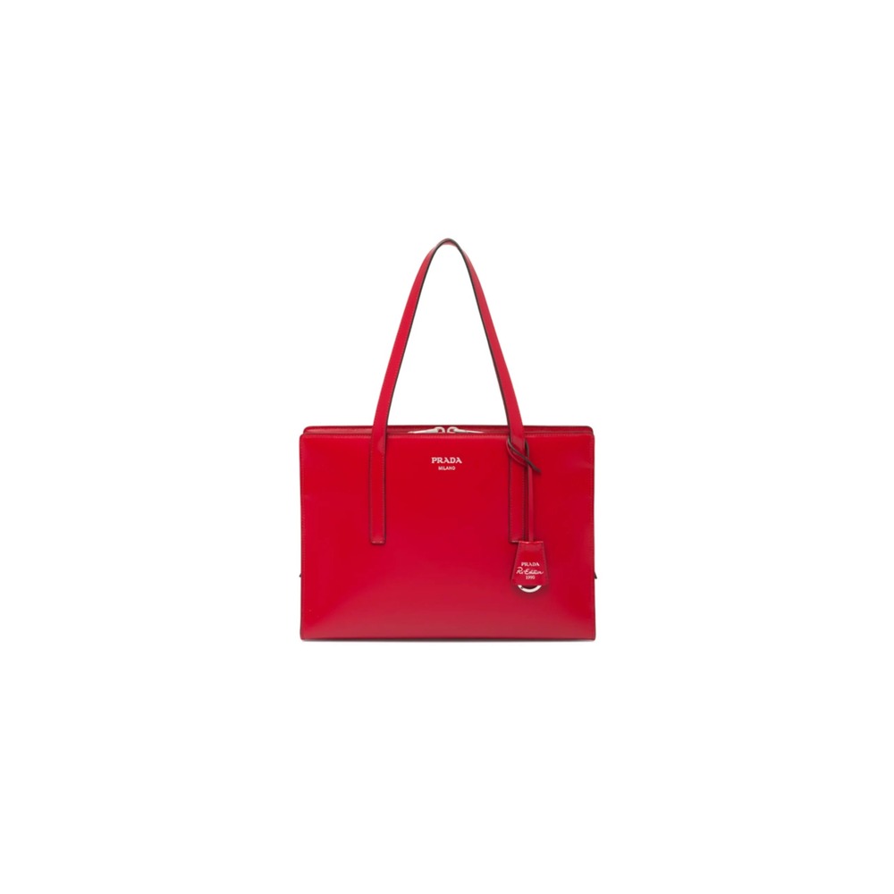 This handbag, a re-edition of an iconic Prada bag of 1995, is characterized by its elegant geometric silhouette with distinct, minimalist lines. Formal allure and practicality meet in its design with a central zipper closure, enhanced by the sophisticated accent of the screen-printed lettering logo. The accessory is made of fine brushed leather, an expression of the brand’s expertise.