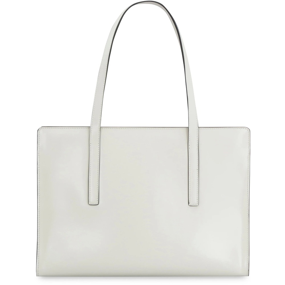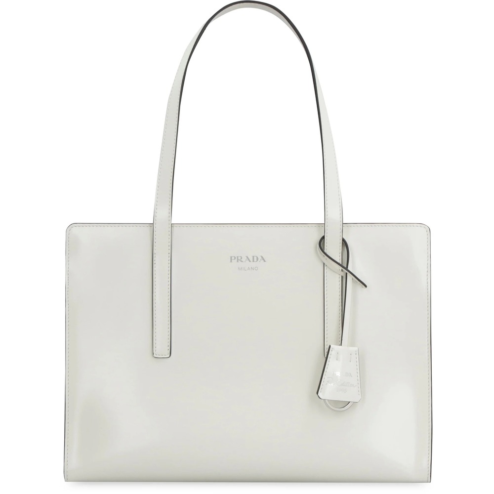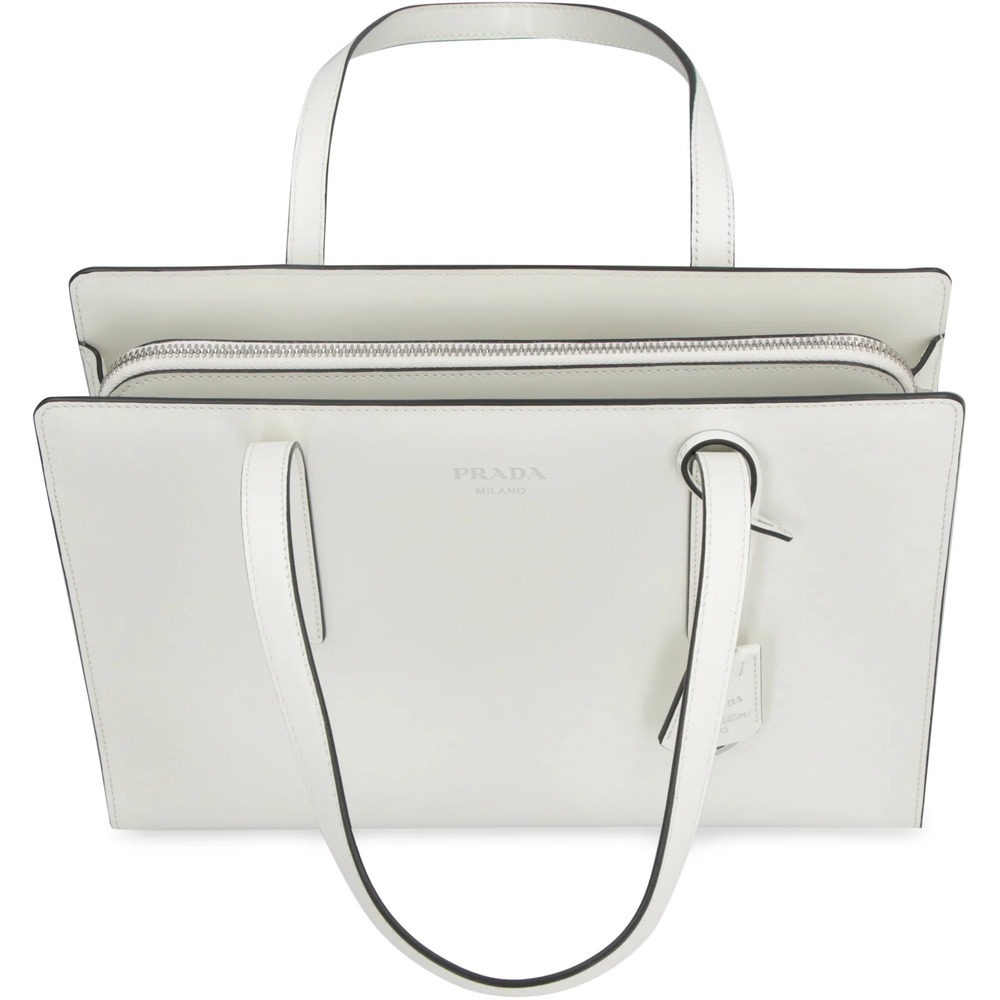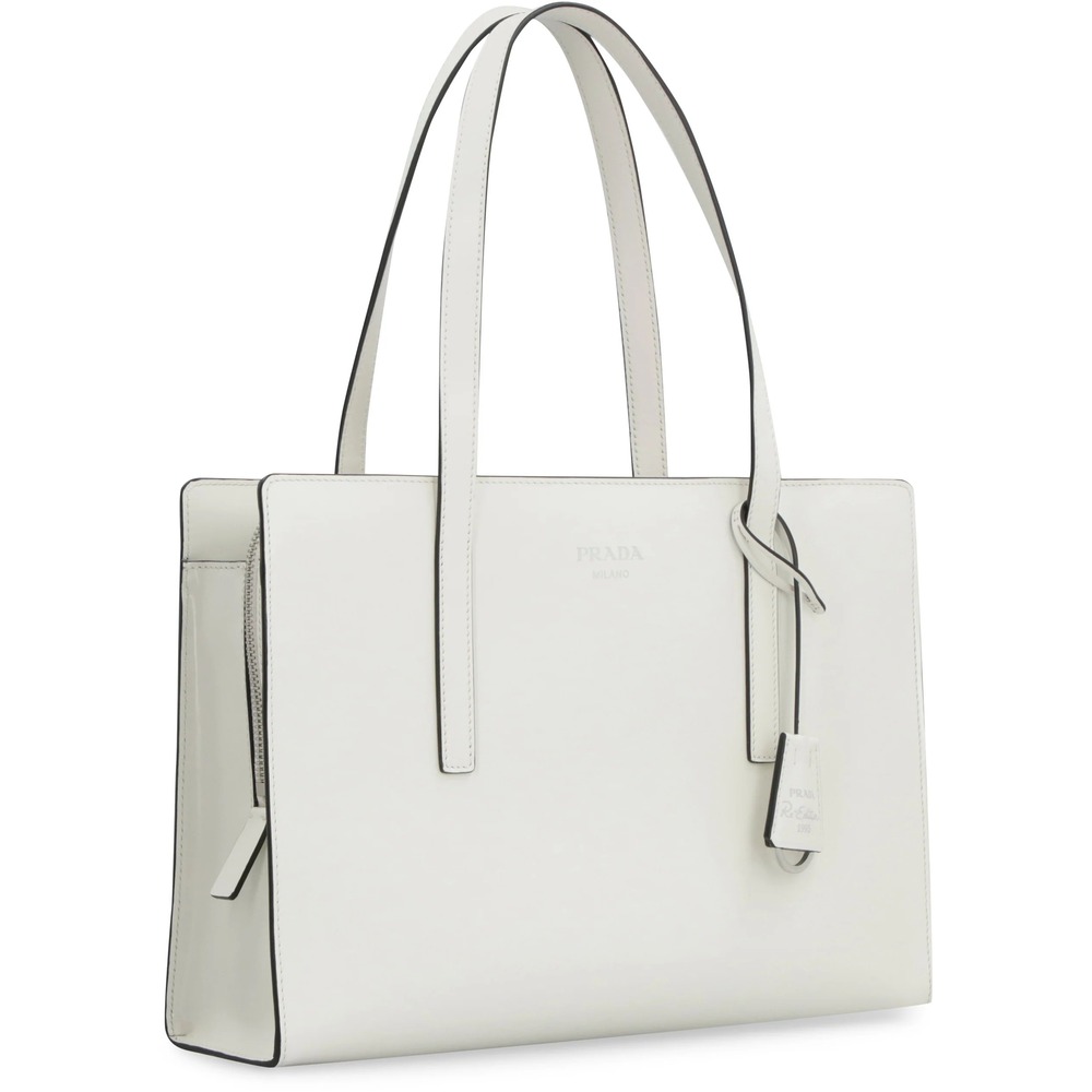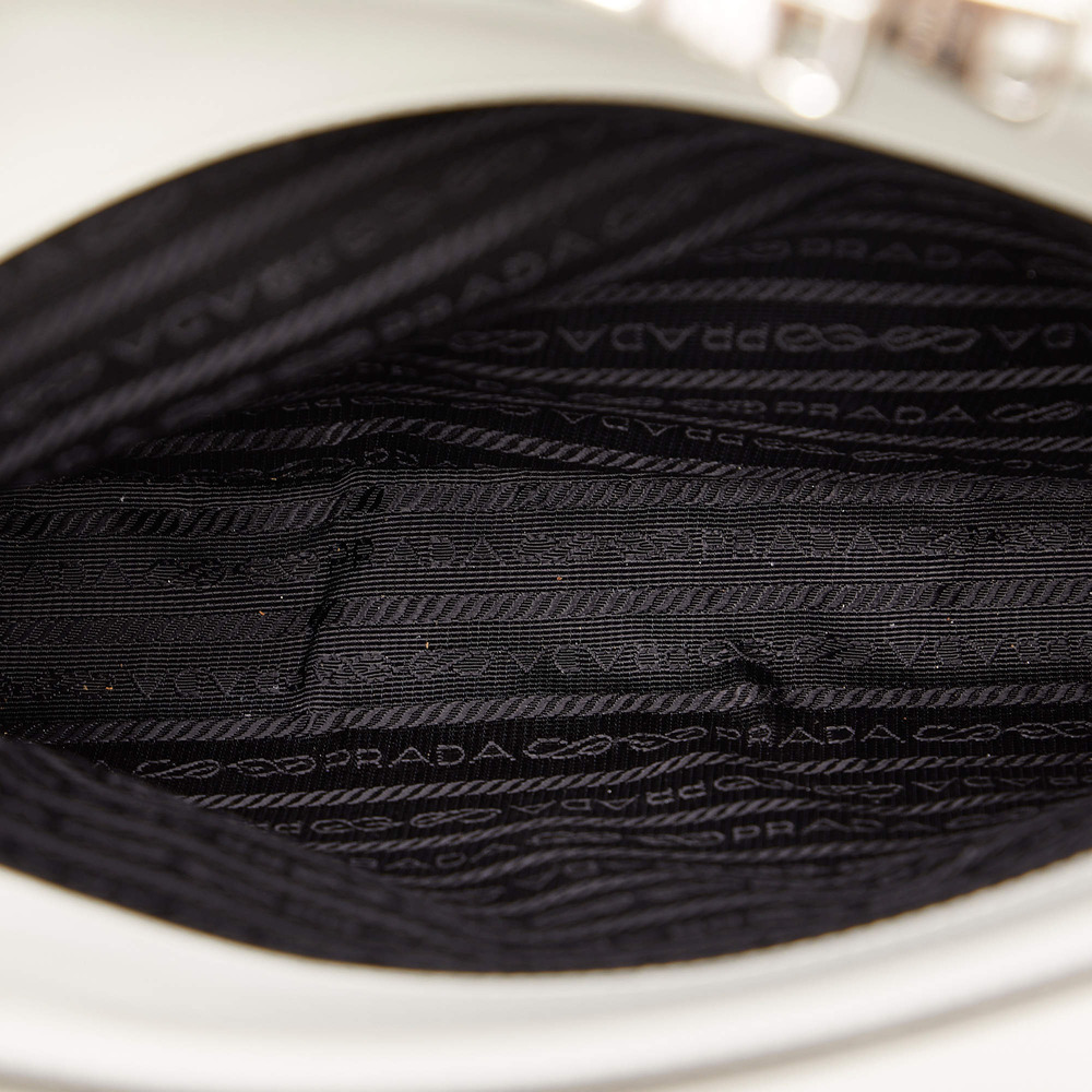 This handbag, a re-edition of an iconic Prada bag of 1995, is characterized by its elegant geometric silhouette with distinct, minimalist lines. Formal allure and practicality meet in its design with a central zipper closure, enhanced by the sophisticated accent of the screen-printed lettering logo. The accessory is made of fine brushed leather, an expression of the brand’s expertise.