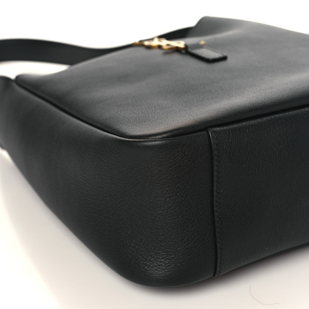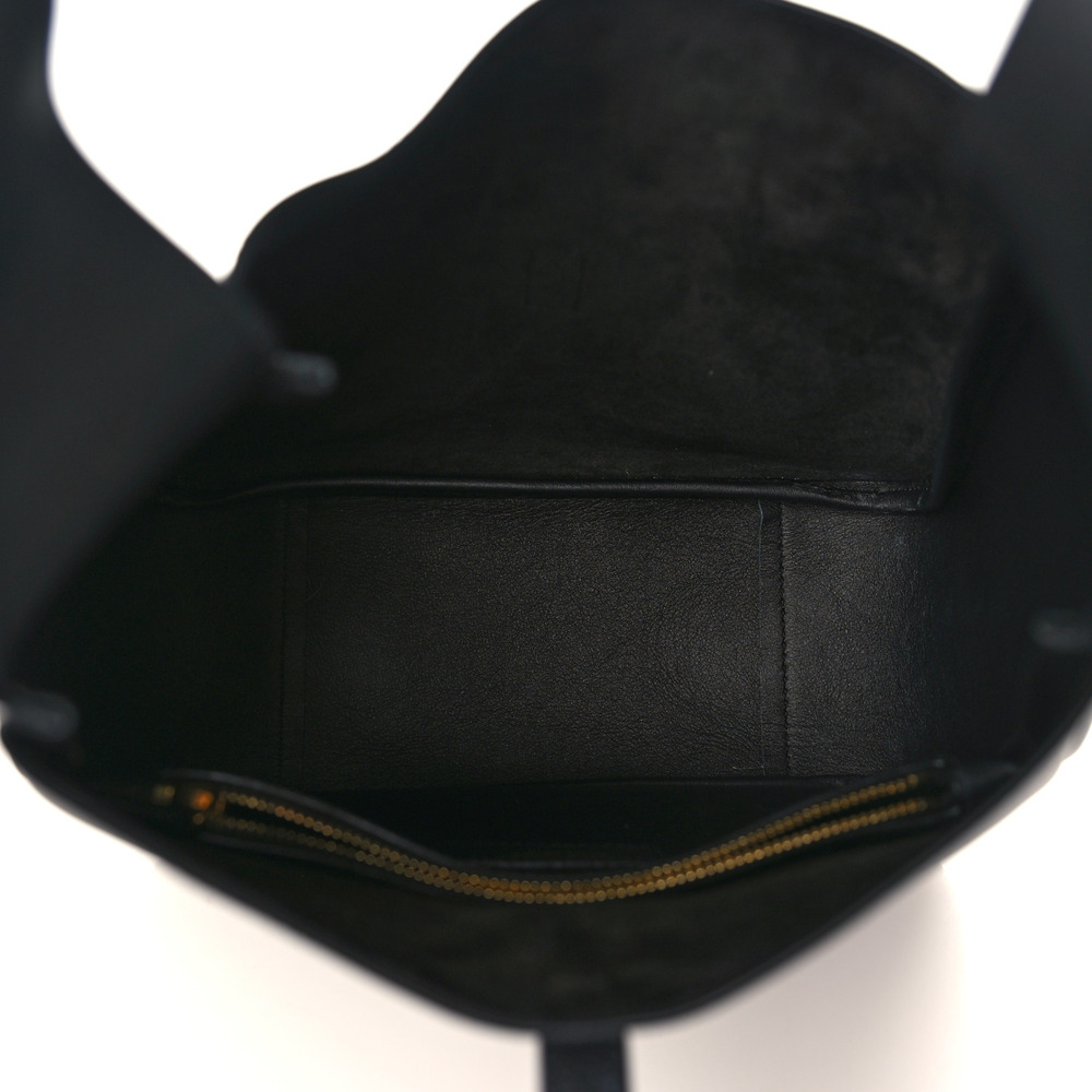 This bucket bag is designed with the iconic CASSANDRE hook closure, a top handle, and an adjustable, detachable shoulder strap for versatile carrying options. Its interior is lined with luxurious suede and includes a convenient zipped pouch for organization. Adorned with light bronze-toned metal hardware and equipped with four metal feet for added durability and stability.