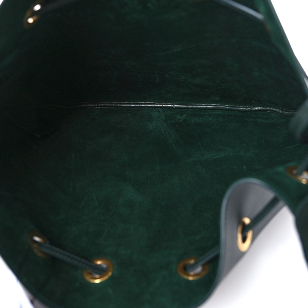 Crafted from luxurious calfskin in a rich green hue, this shoulder bag exudes sophistication. It boasts a looping leather shoulder strap adorned with brass hardware, adding a touch of elegance to the design. The top of the bag opens to reveal a spacious green suede interior, complemented by a matching removable pouch for added versatility and organization.